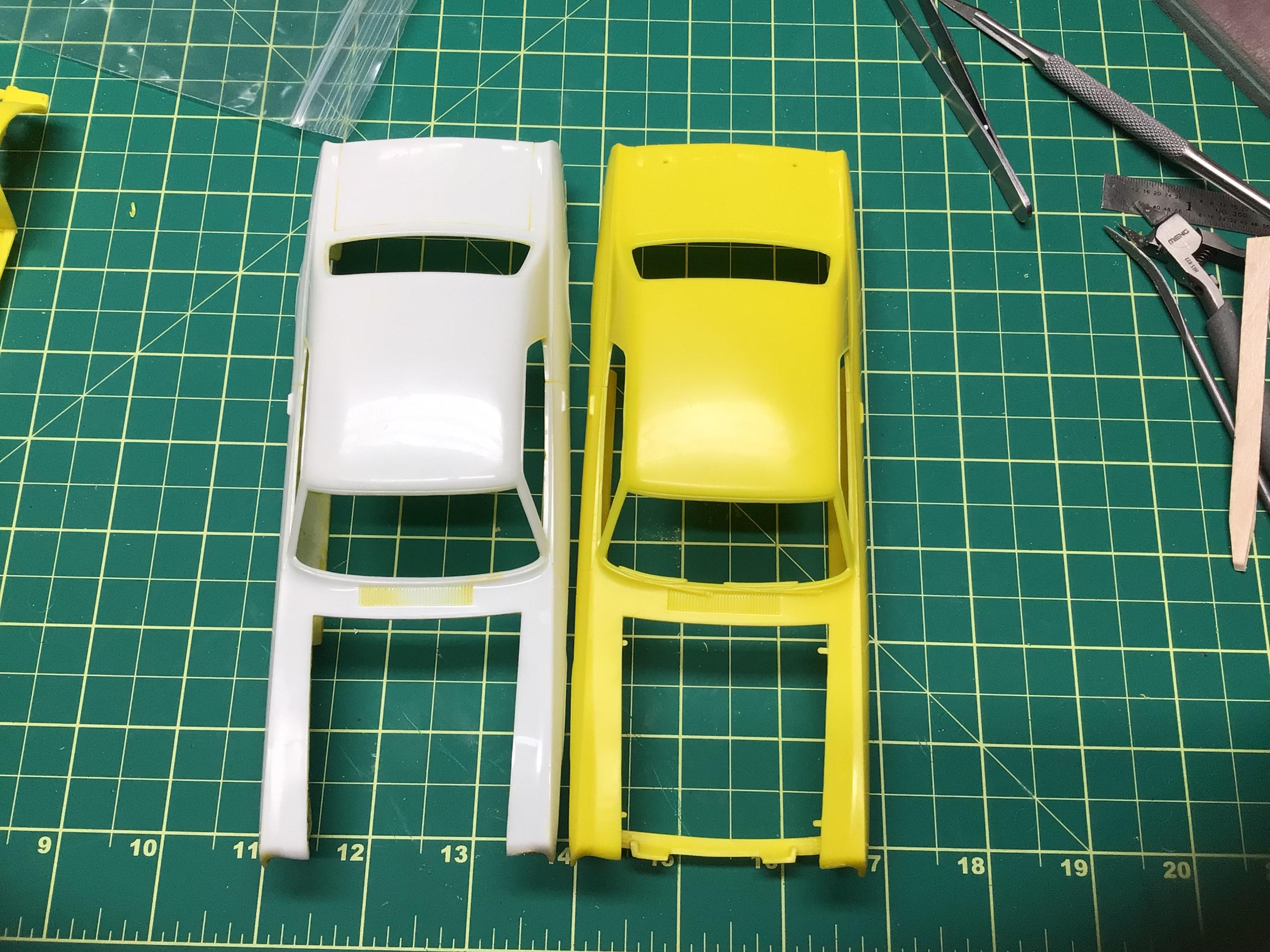 NOBLNG Posted Saturday at 09:30 PM Posted Saturday at 09:30 PM (edited) I built the engine for this a few years back and then put everything back in the box. Recently I picked up another body shell that is molded in white. I had thought they were identical, but just noticed that the white one does not have molded in wipers or holes for the rear spoiler. Can anyone tell me when that change was made? I’d rather use the white one as the drip rails are much more defined. All comments welcome as usual. Thanks.🙂 Edit: I notice that the instructions call for the hood scoop and spoiler to be flat black, but they should be body color. Edited Wednesday at 08:43 PM by NOBLNG 7