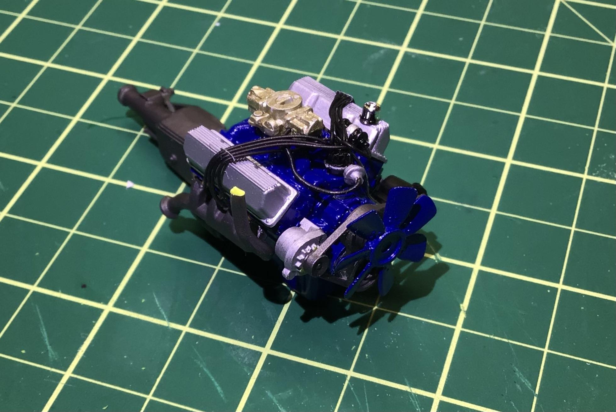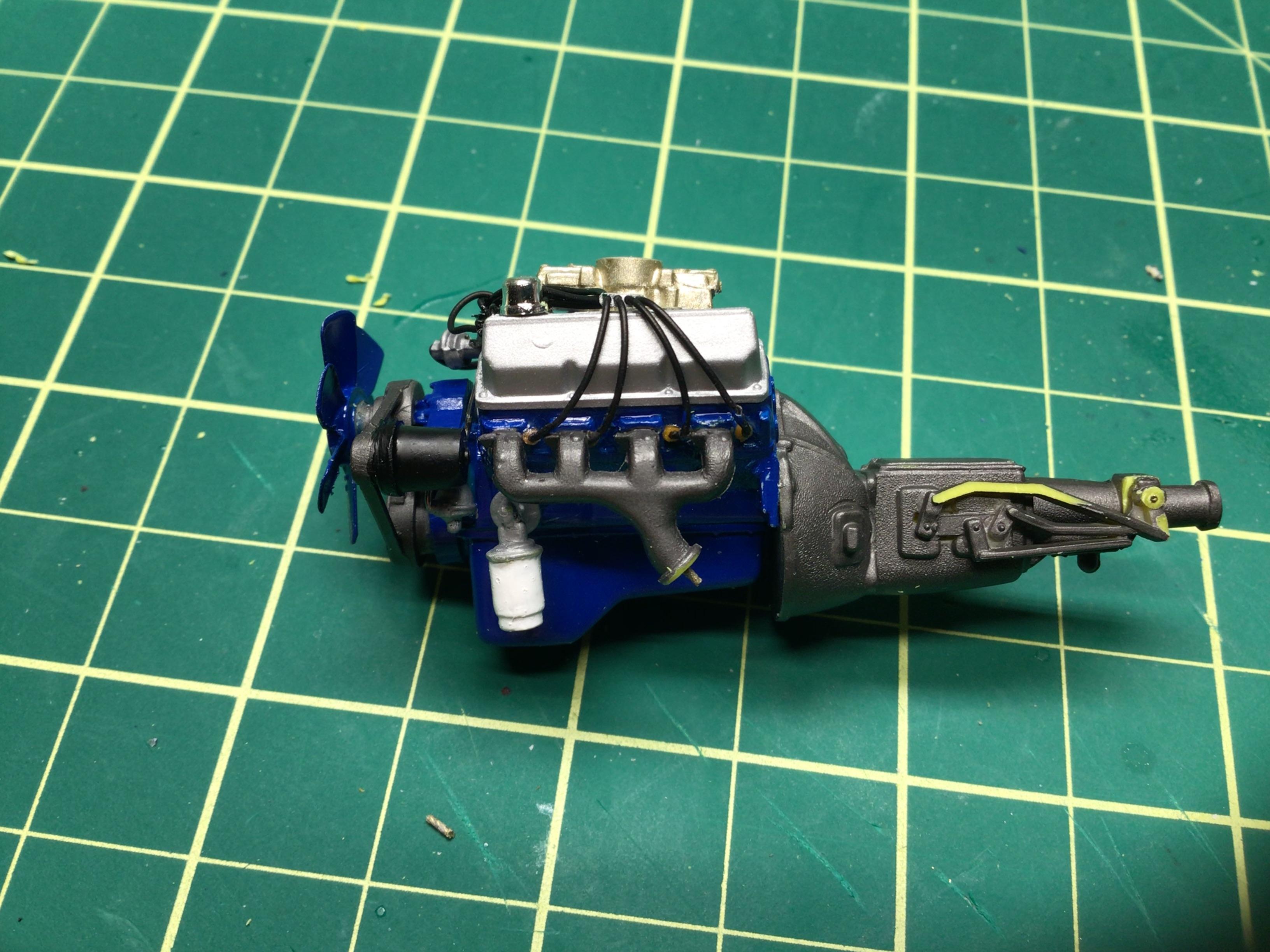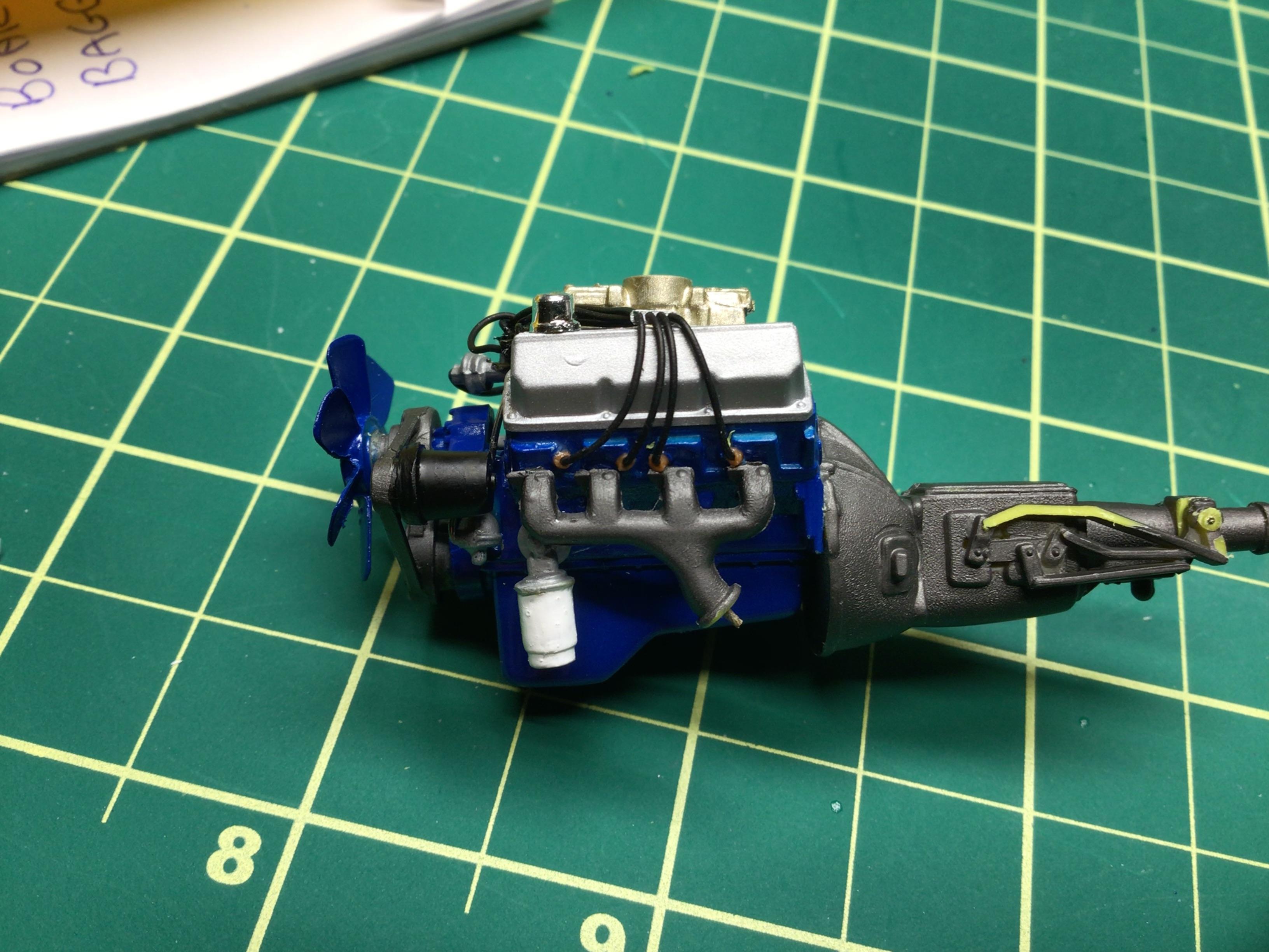 NOBLNG Posted Tuesday at 03:34 AM Author Posted Tuesday at 03:34 AM (edited) Well I went to trial fit the engine in place and discovered an error with my placement of the plug wires and exhaust manifolds.😬 You’d think I built this as a kid or before I had access to the internet, but it was probably about six years ago.😳 Anyways, I corrected it but there is still a bit of interference. The engine was sitting cock-eyed so I had to re-drill the hole in the oil pan and shave the shift linkage because it hits the trans tunnel.🥴 I will persevere. Edited Tuesday at 03:37 AM by NOBLNG 3