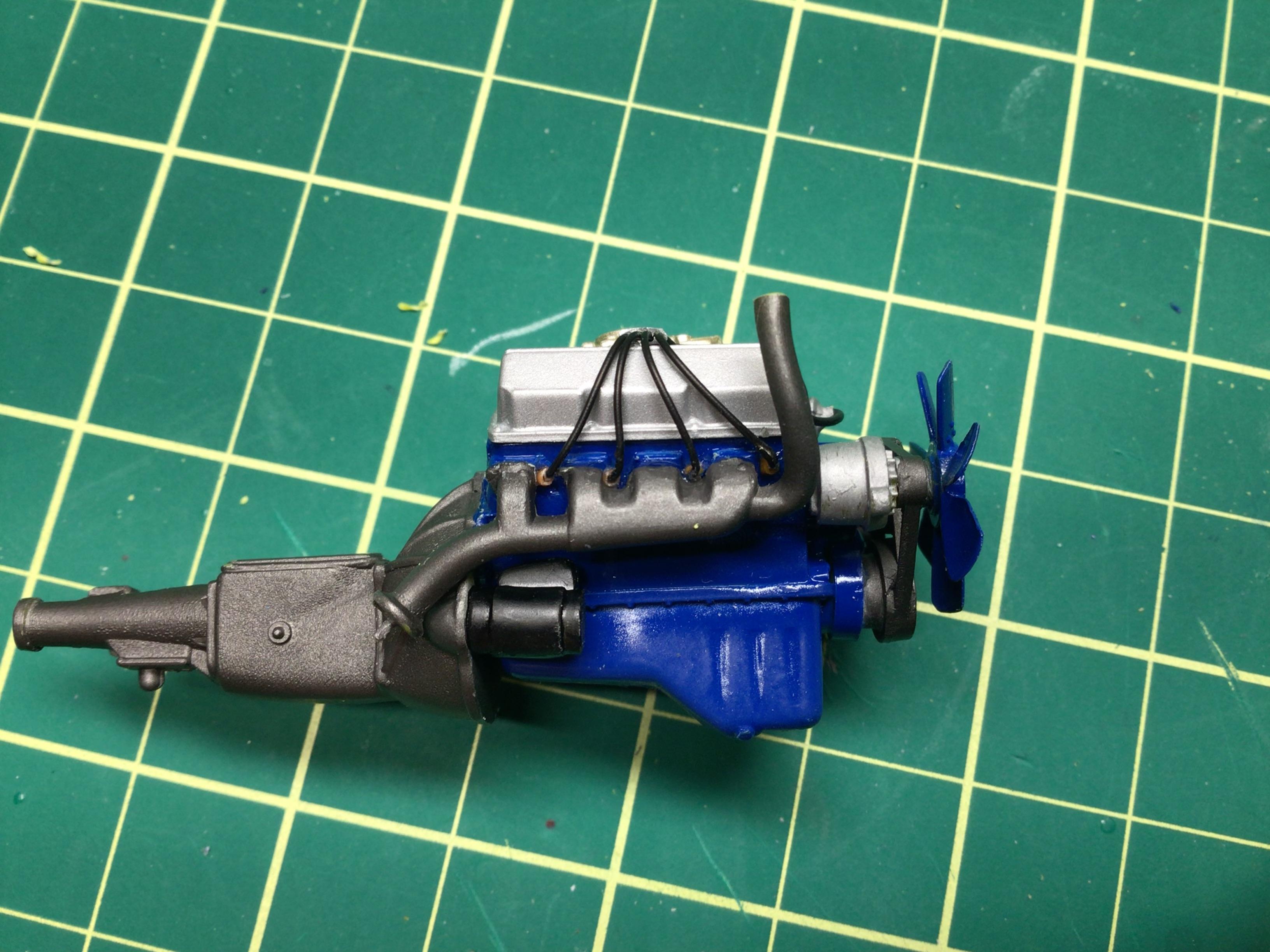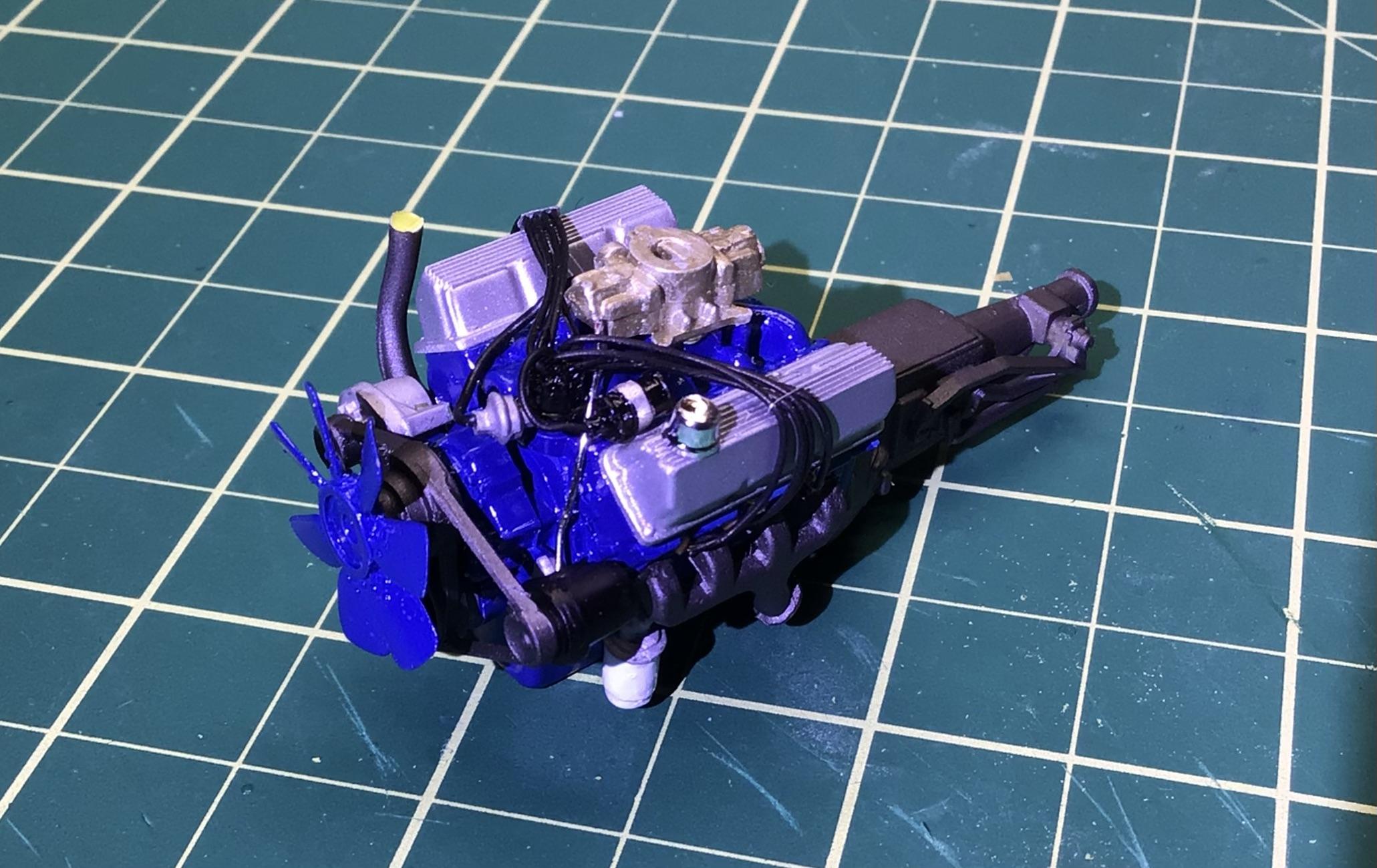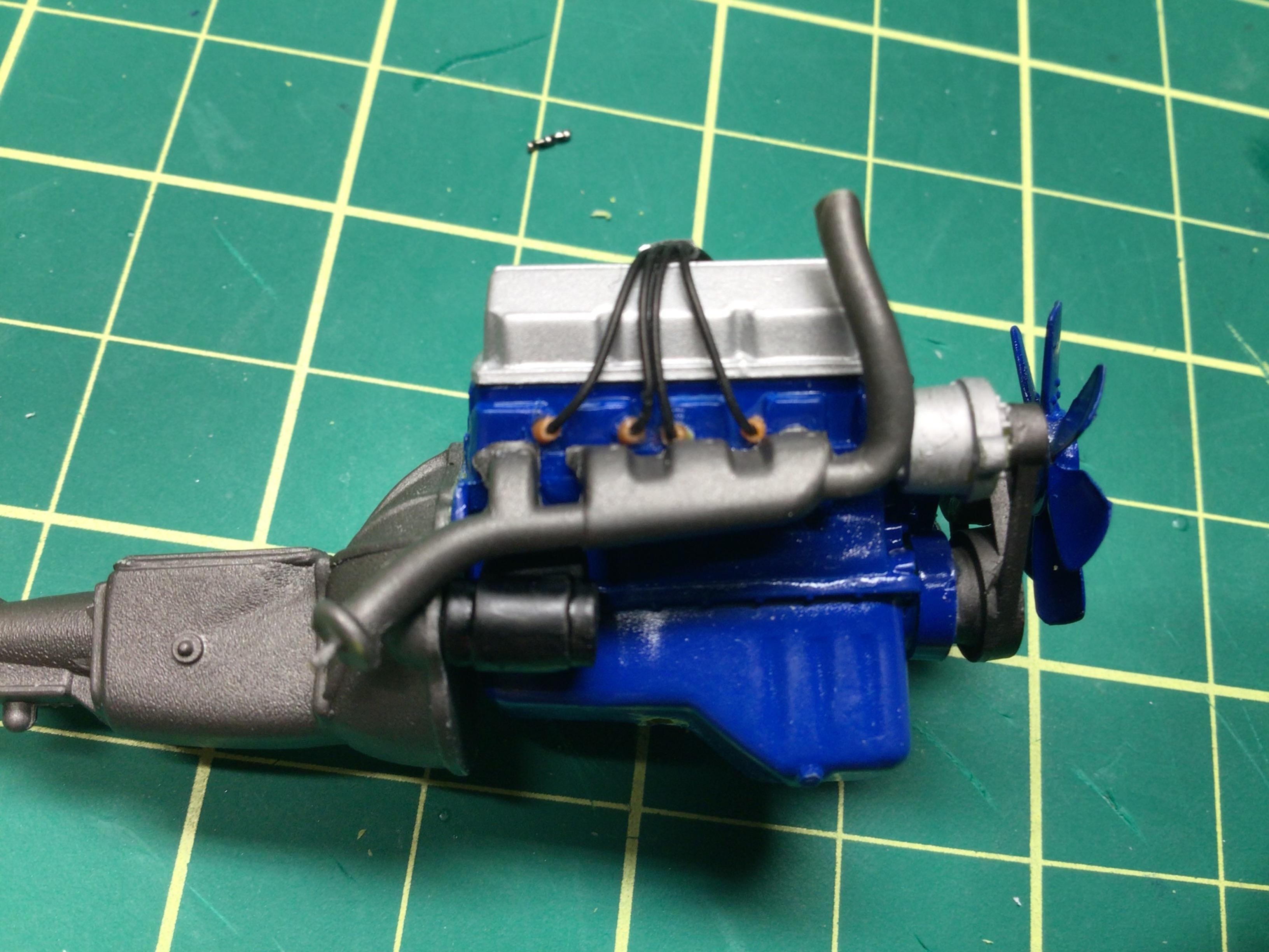 NOBLNG Posted Tuesday at 03:34 AM Author Posted Tuesday at 03:34 AM (edited) Well I went to trial fit the engine in place and discovered an error with my placement of the plug wires and exhaust manifolds.😬 You’d think I built this as a kid or before I had access to the internet, but it was probably about six years ago.😳 Anyways, I corrected it but there is still a bit of interference. The engine was sitting cock-eyed so I had to re-drill the hole in the oil pan and shave the shift linkage because it hits the trans tunnel.🥴 I will persevere. Edited Tuesday at 03:37 AM by NOBLNG 3