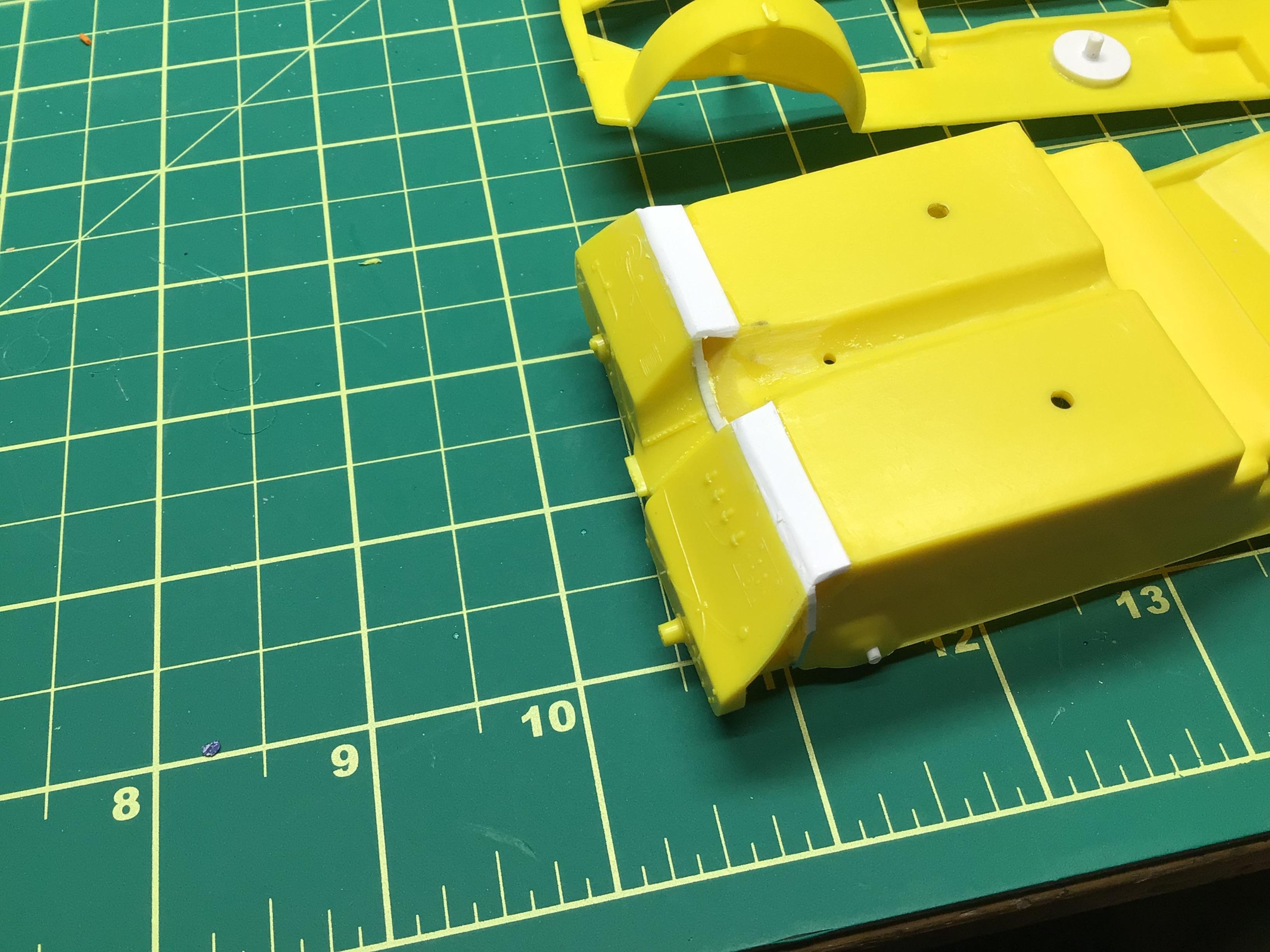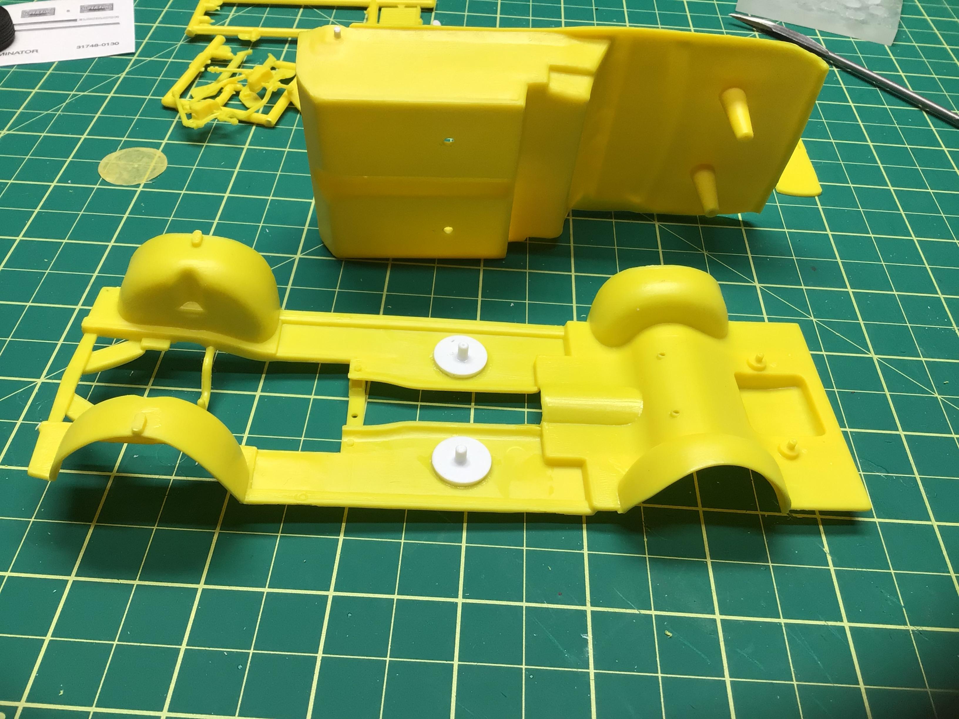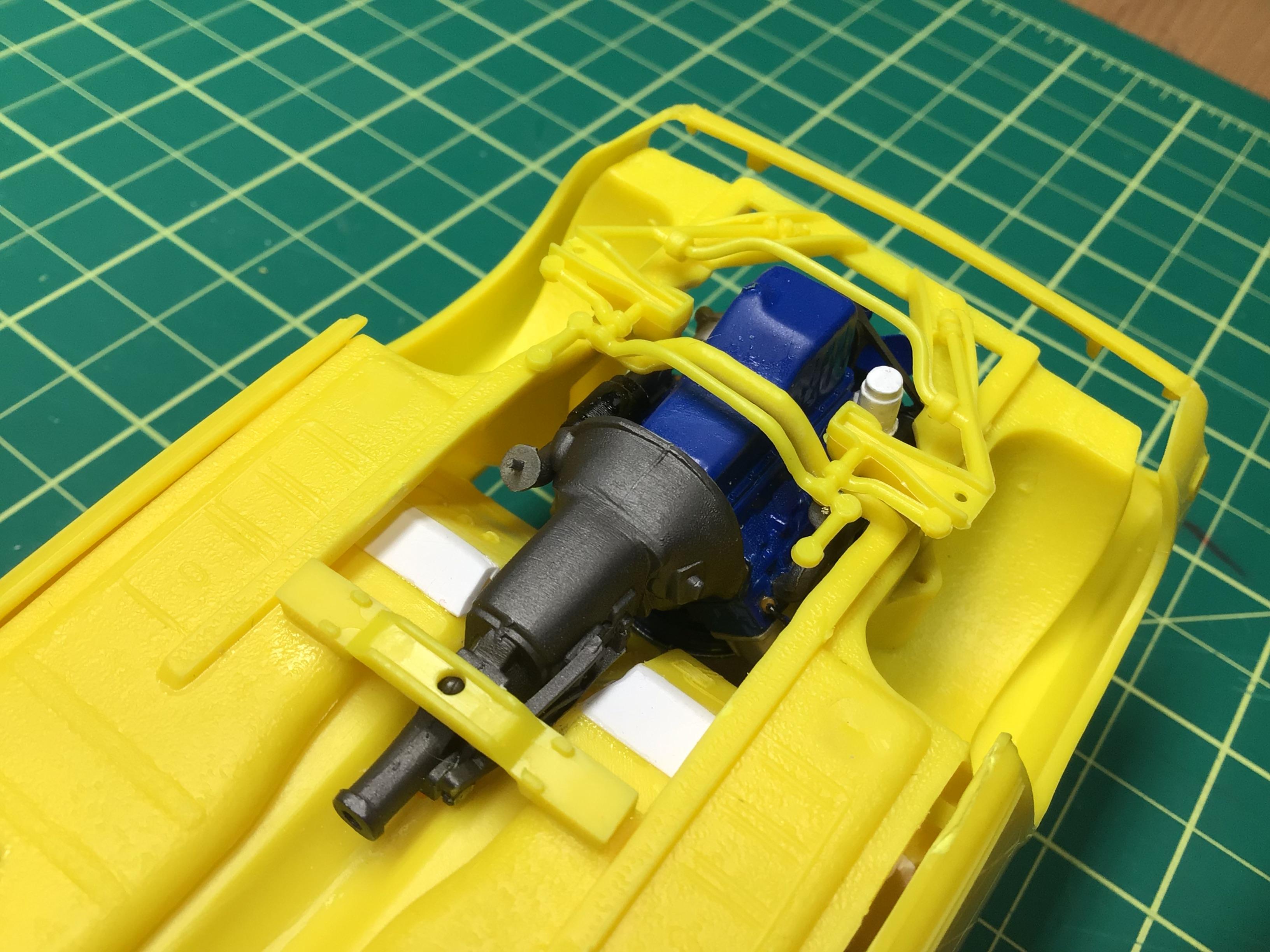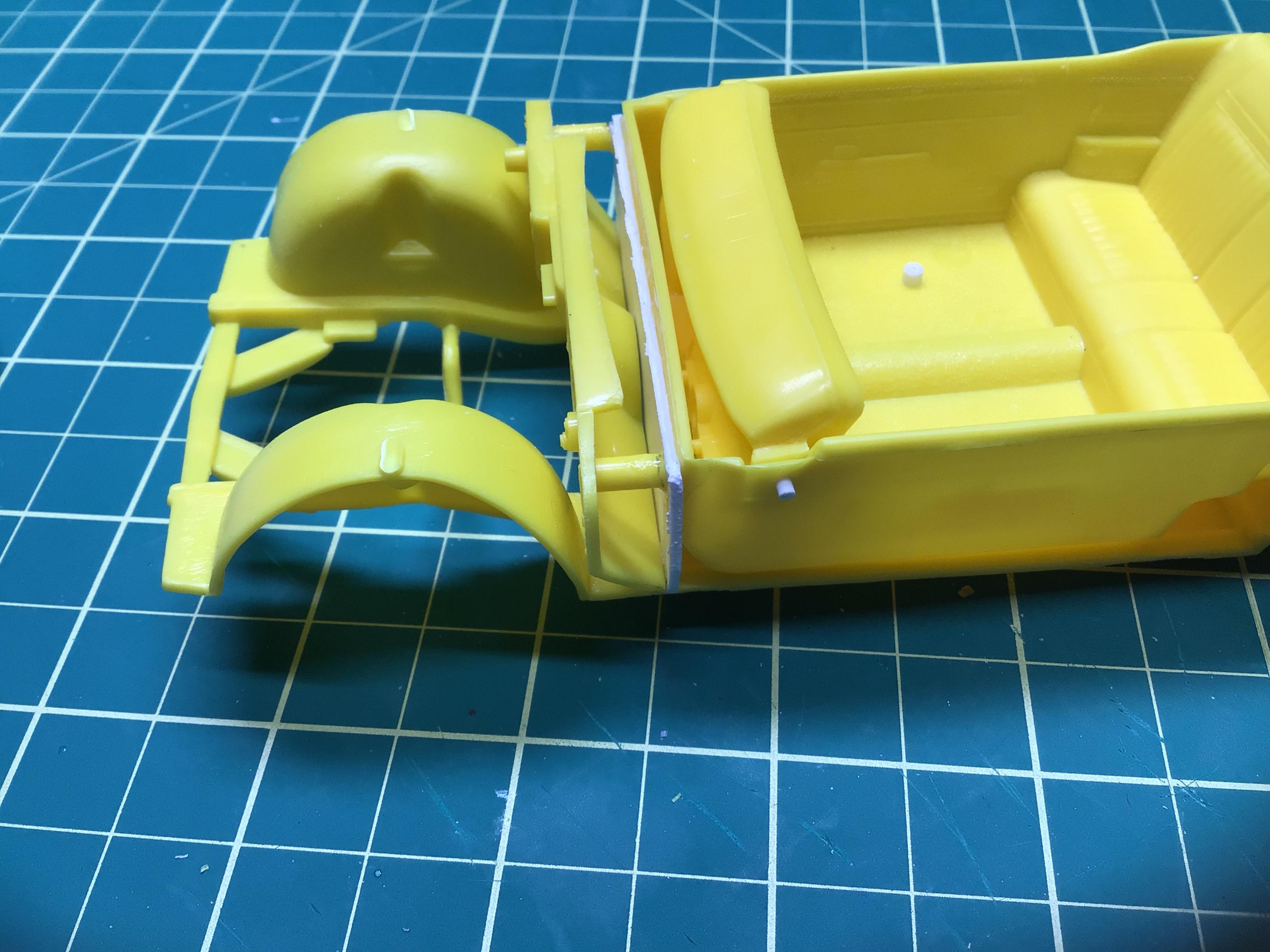 NOBLNG Posted Tuesday at 09:18 PM Author Posted Tuesday at 09:18 PM (edited) This thing has been fighting me every step of the way so far. I have removed the nubs on top of the front wheel wells and shortened the tub to chassis mounting pins so that the interior will sit right down on the floor pan. I have also moved the engine slightly forward since I think the braces in the engine bay will interfere with the air cleaner.🤯 The hood WILL close completely now, but I will have to recess the braces into the wheel wells. I guess I wouldn’t have had to do all this if I had glued the firewall to the body like the instructions suggest?🤔 It’s a shame that with all the re-issues of this kit that AMT didn’t see fit to update the chassis and interior because the body is really nice.😕 But….I think I am gaining the upper hand now. Thanks for bearing with me folks!🥵 Edited Tuesday at 11:03 PM by NOBLNG 3