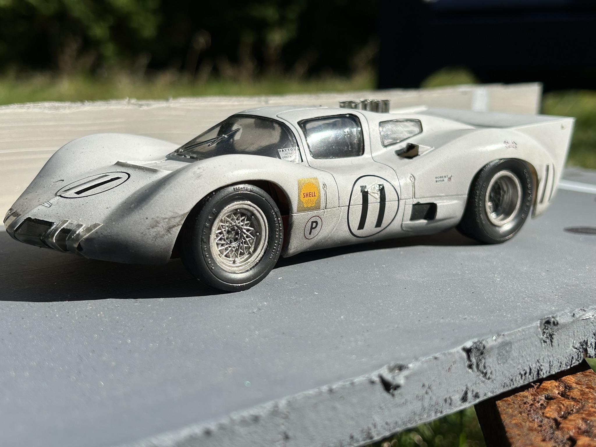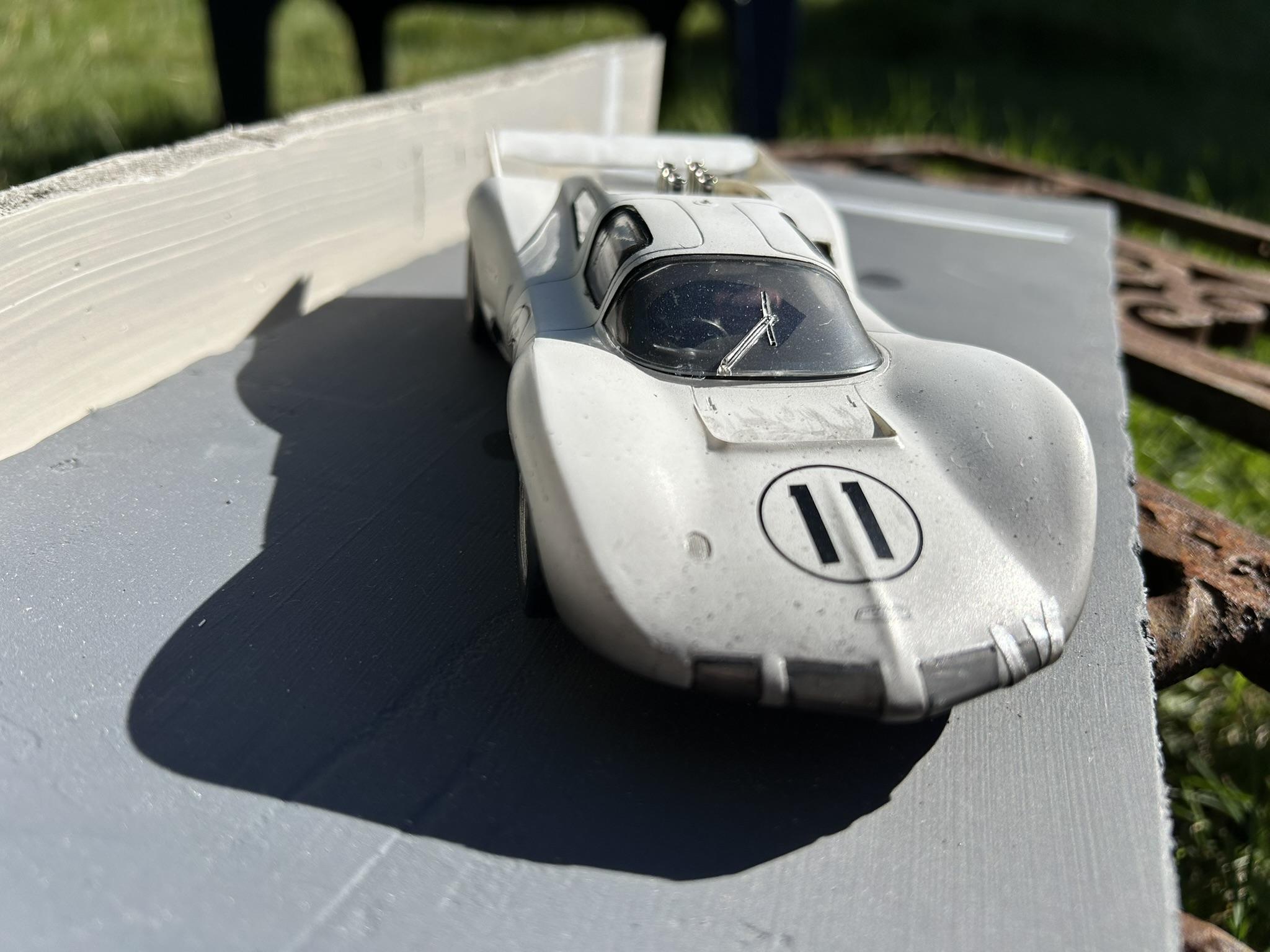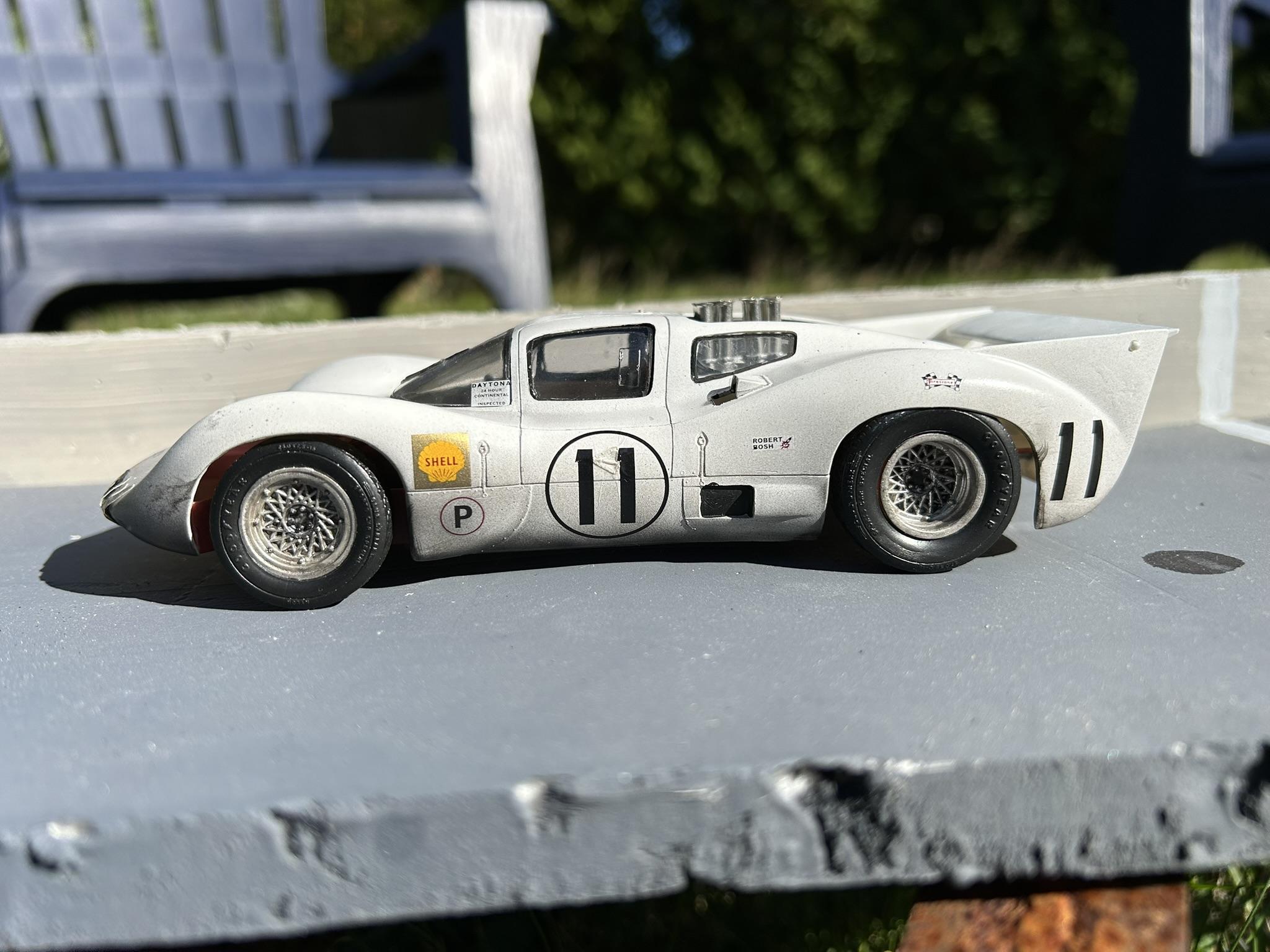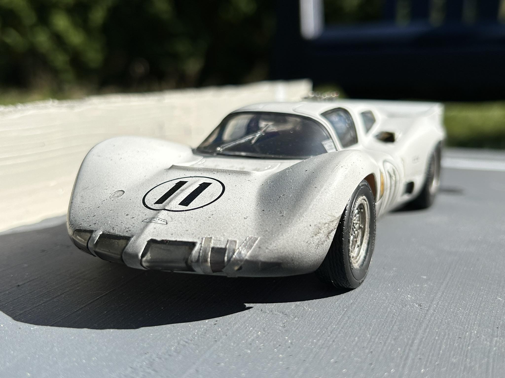 shoeman Posted Saturday at 09:58 PM Posted Saturday at 09:58 PM I finally finished this after many months. It's the old Monogram kit, really simple kit as mentioned before in other builds. I gave it the after an endurance race look. The kit decals were missing so I used some Starfighter's and mixed and matched, so it's no particular actual race version. I widened the kit wheels using a technique I learned here, sawed up a deeper dish donor wheel set and merged the two. I think that worded well. First attempt at scale duct tape too, that was fun. Next I'm finishing a GT40 I started over a year ago. 4