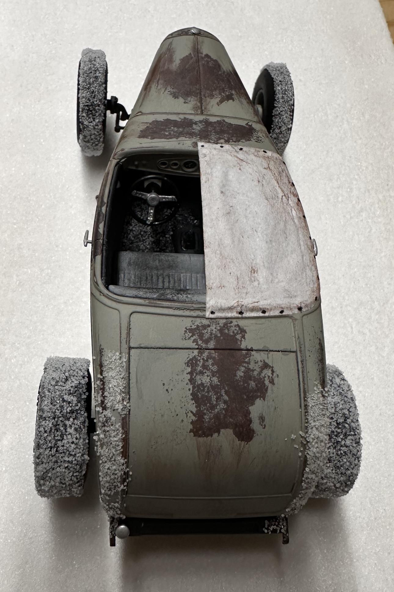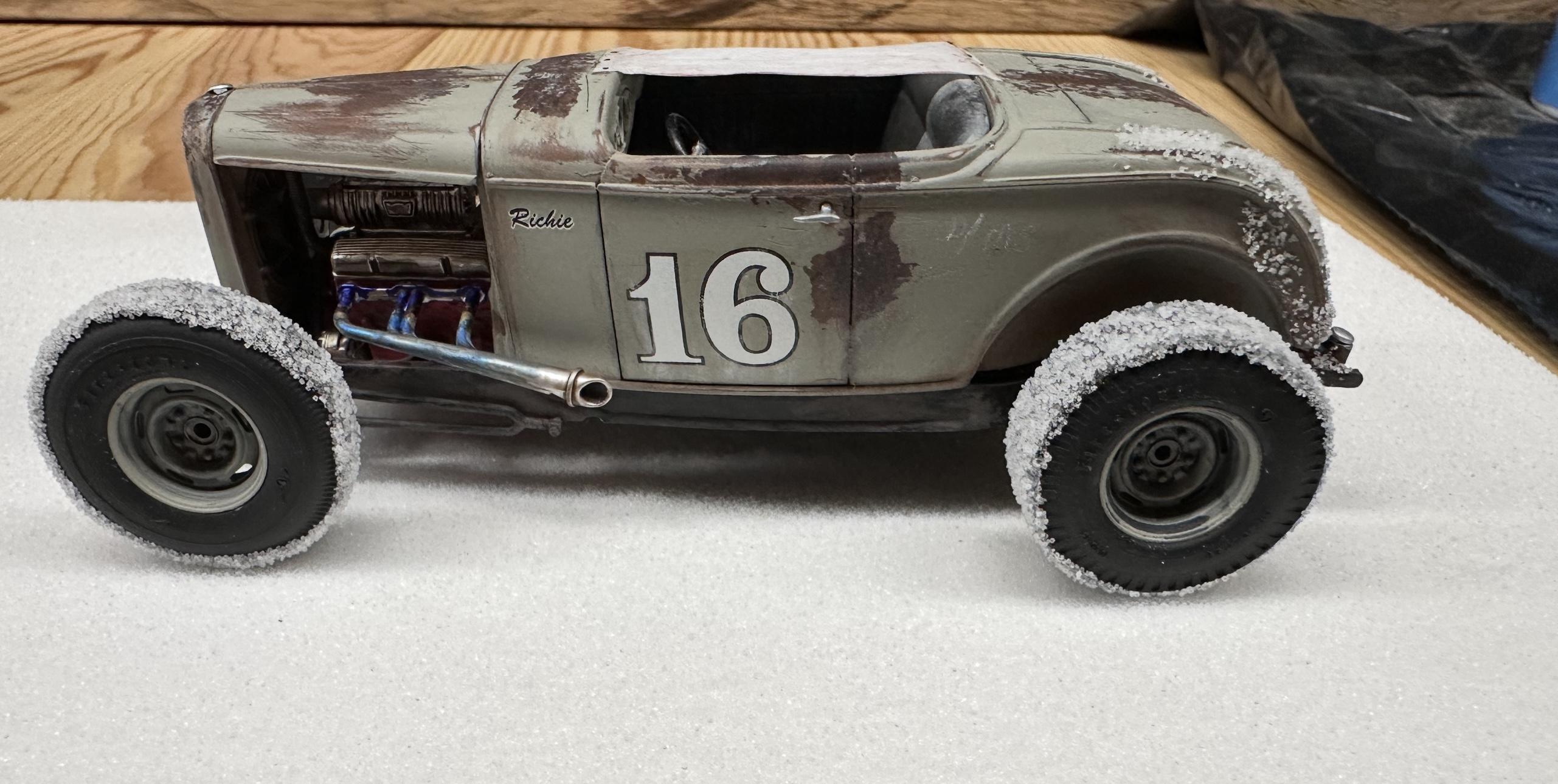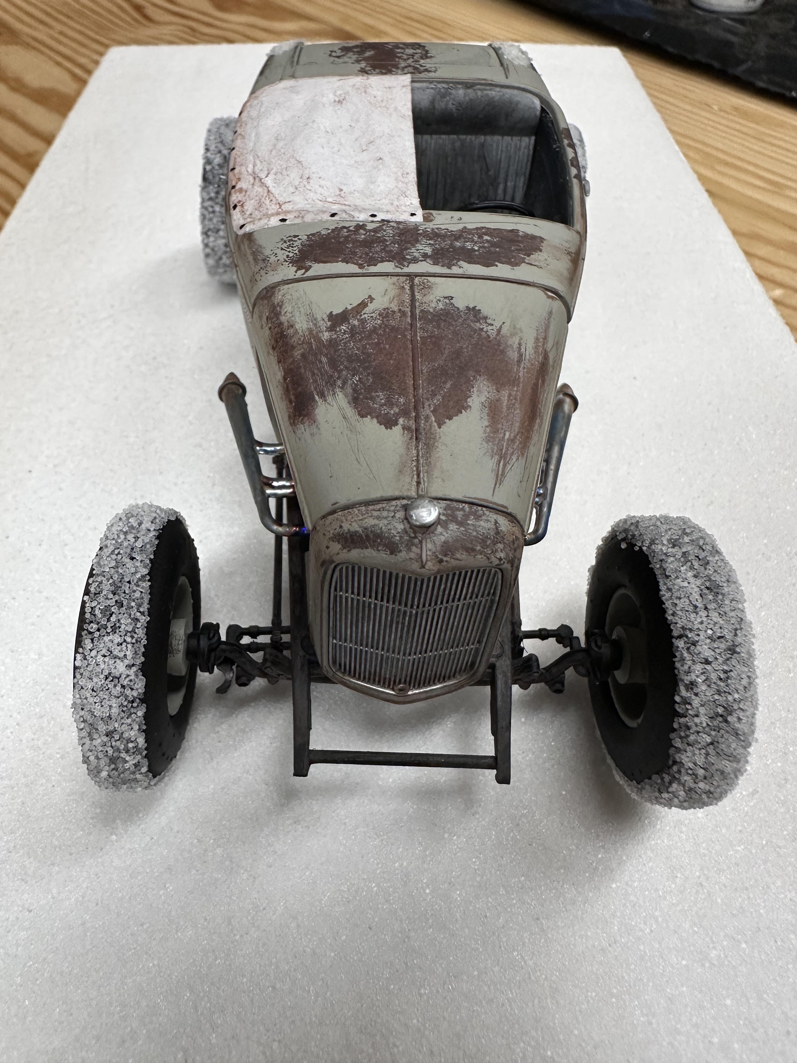 Glassparman Posted Thursday at 11:26 PM Posted Thursday at 11:26 PM This was my second attempt at salt chipping my paint. This is my rendition of an old Salt Flats racer that was pulled from a barn to go race. I wanted something better for the tonneau cover snaps but ended up just dotting with a marker. The cover is tissue paper coated in Mod Podge to hold its shape. I spread out a strip of glue and a strip of salt and rolled the tires through both. I didn’t like the large size of the front tires but they were a set and I figured back in the day, the non-sponsored racers grabbed what they could. 8