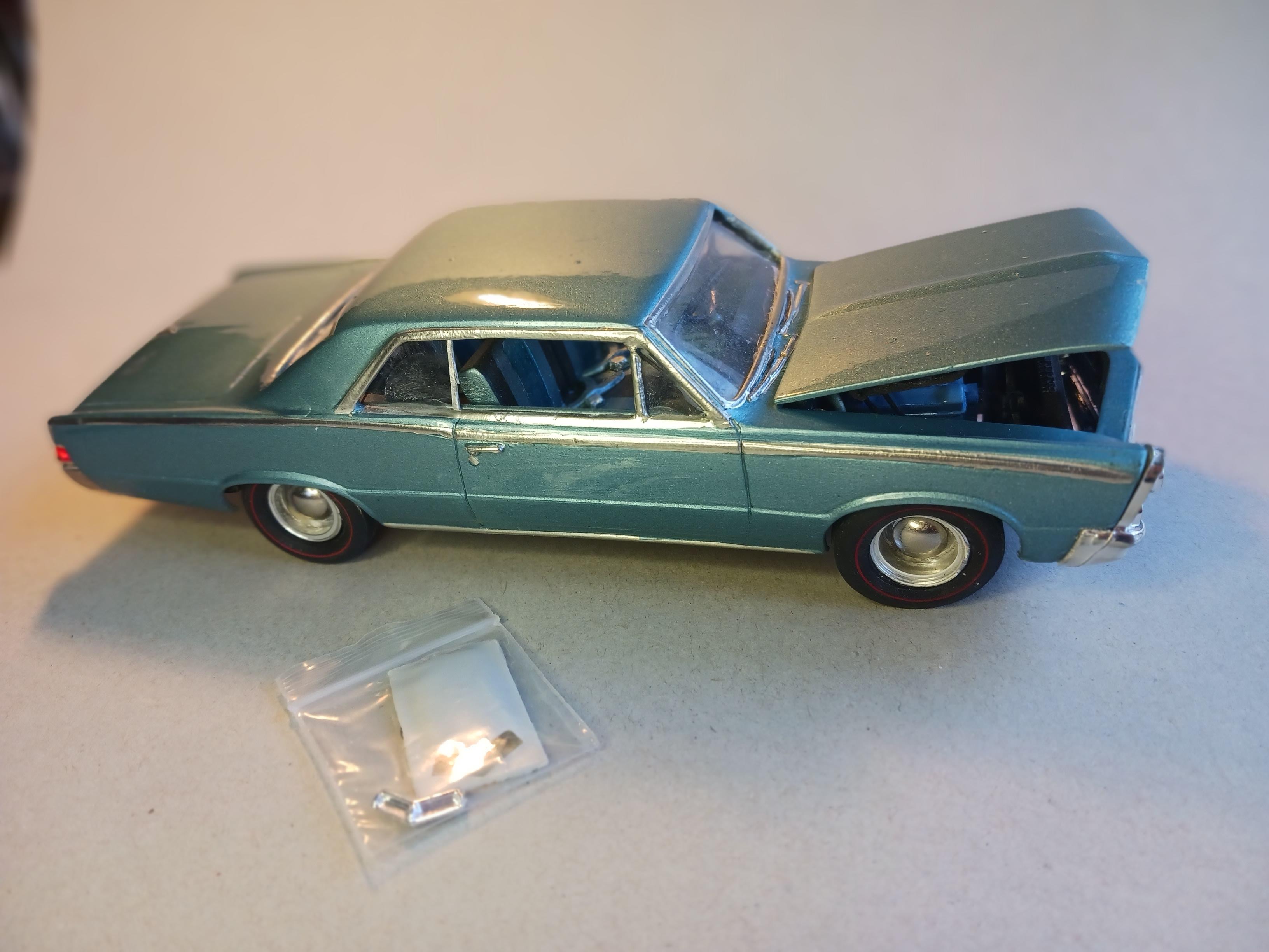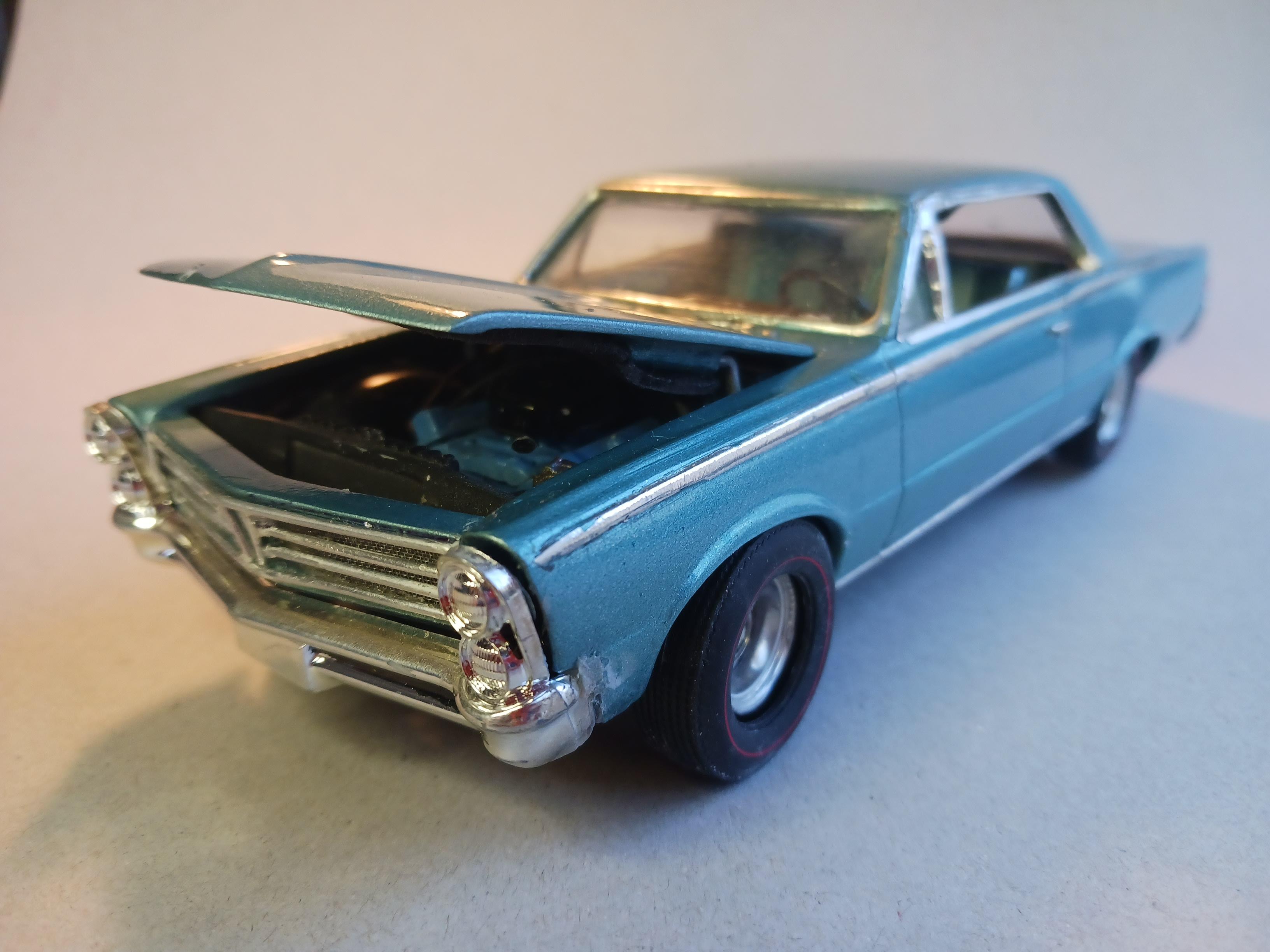 Wickersham Humble Posted Sunday at 08:28 PM Posted Sunday at 08:28 PM (edited) First, kudos to contributor Trent Christian for the neat conversion idea, and the very spiffy build; congrats! I did the GTO to Tempest conversion about 5-6 years ago to depict a favorite ride I had about 1967, before the Draft caught me in mid crazy youth, a '65 Tempest Custom 2-dr hardtop (326 base motor and 3-speed stick -- of course!) which I loved.* I'm always shocked at how mediocre my builds look in photos; guess that's reality, vs. my octogenarian eyes, huh? That year had a separate base model that didn't share the Lemans/GTO grille configuration; it looked (meant to, oc) cheaper -- but was still nice enough. My conversion wasn't hard under the hood; just build-down the Goat powerplant, and go with a single exhaust, etc. The 1965-65 basic models had a distinctive chrome (aluminum, actually) molding strip that ran over the fenders and door where the LeMans/GTO had a pinstripe, etc. and hard to get 'thin' enough! I just scribed a rectangle around the hood scoop, and filled the gap. Ironically, I lost it, had to make a replacement from scratch; found the original -- and then gave the repro to a fellow forum member who solicited one! Kismet! I wondered: were the Sprint/Tempest tail lights different from the LeMans that year? All the pics I've seen of Sprints have the base-line fan-shaped lens, etc. Also, I wondered if he mistook the windshield-washer cannister for an overflow reservoir? And is it the brake master-cylinder vacuum booster housing he names 'the brake drum'? I obviously had the same fit issue with the front grille/headlight/bumper assembly in my kit; not exemplary! Included are two shots of the 1/1 Poncho, plus my Ducati Scrambler from 1968 I hope he contributes more innovative builds, and keeps up the good research. The pics show engine compartment and interior detail to die for! Wick *Also done my first car, 1955 Chevy Delray rod in 1961, and 1951 Ford Club Coupe from 1964 -- I was a real throw-back, I guess! Cheap to keep! Edited Sunday at 08:37 PM by Wickersham Humble forgot detail 1
