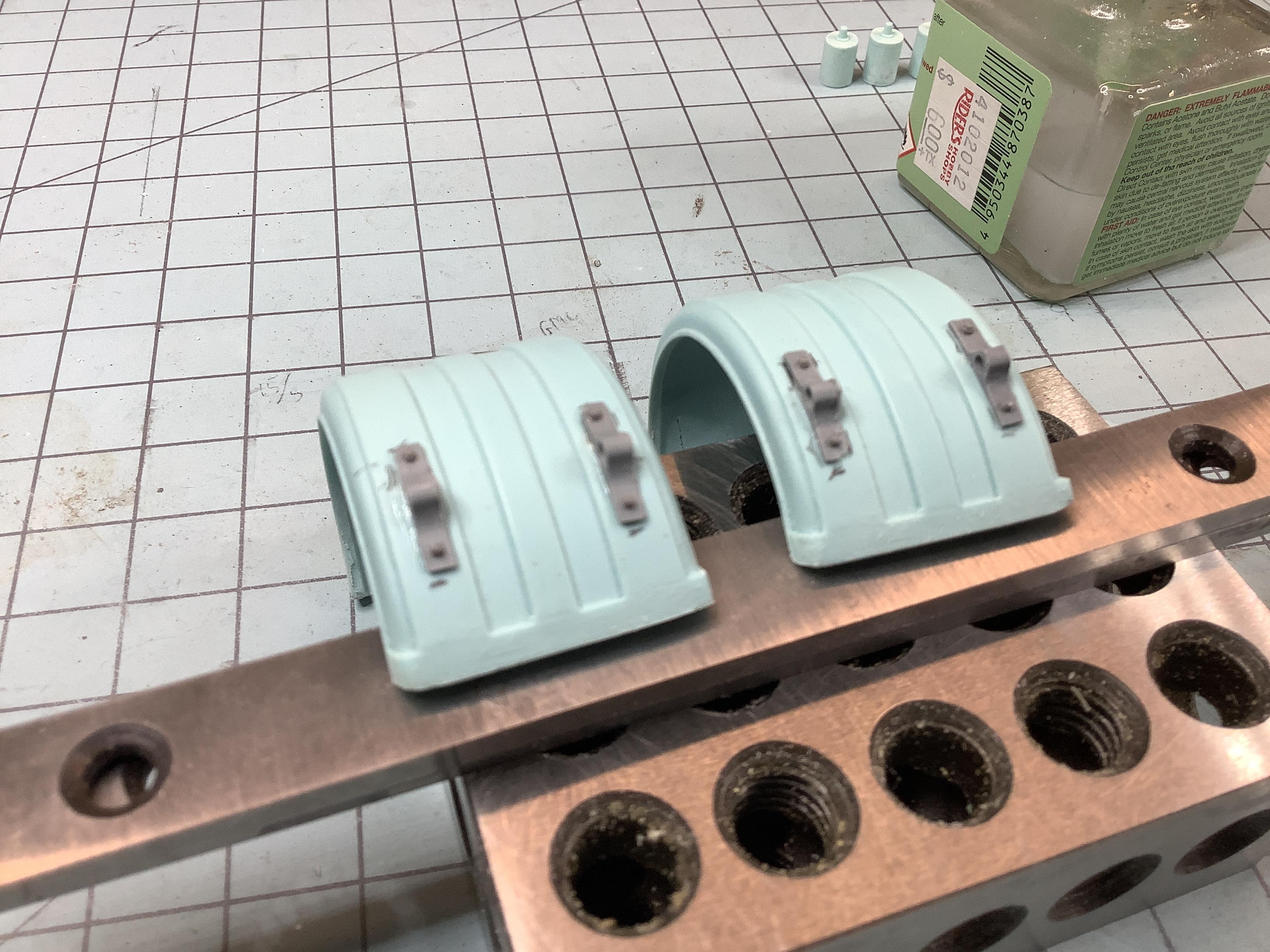 Gary Chastain Posted Saturday at 05:49 PM Author Posted Saturday at 05:49 PM Needed to make up 8 fender frame mounts (couldn’t find any in my junk), used the Ming bolts to add detail, got two offset fender rods for rear most mounts made due to rear tapered frame shape. Get the wheels built up and finish brakes, then can install rear fenders. 2