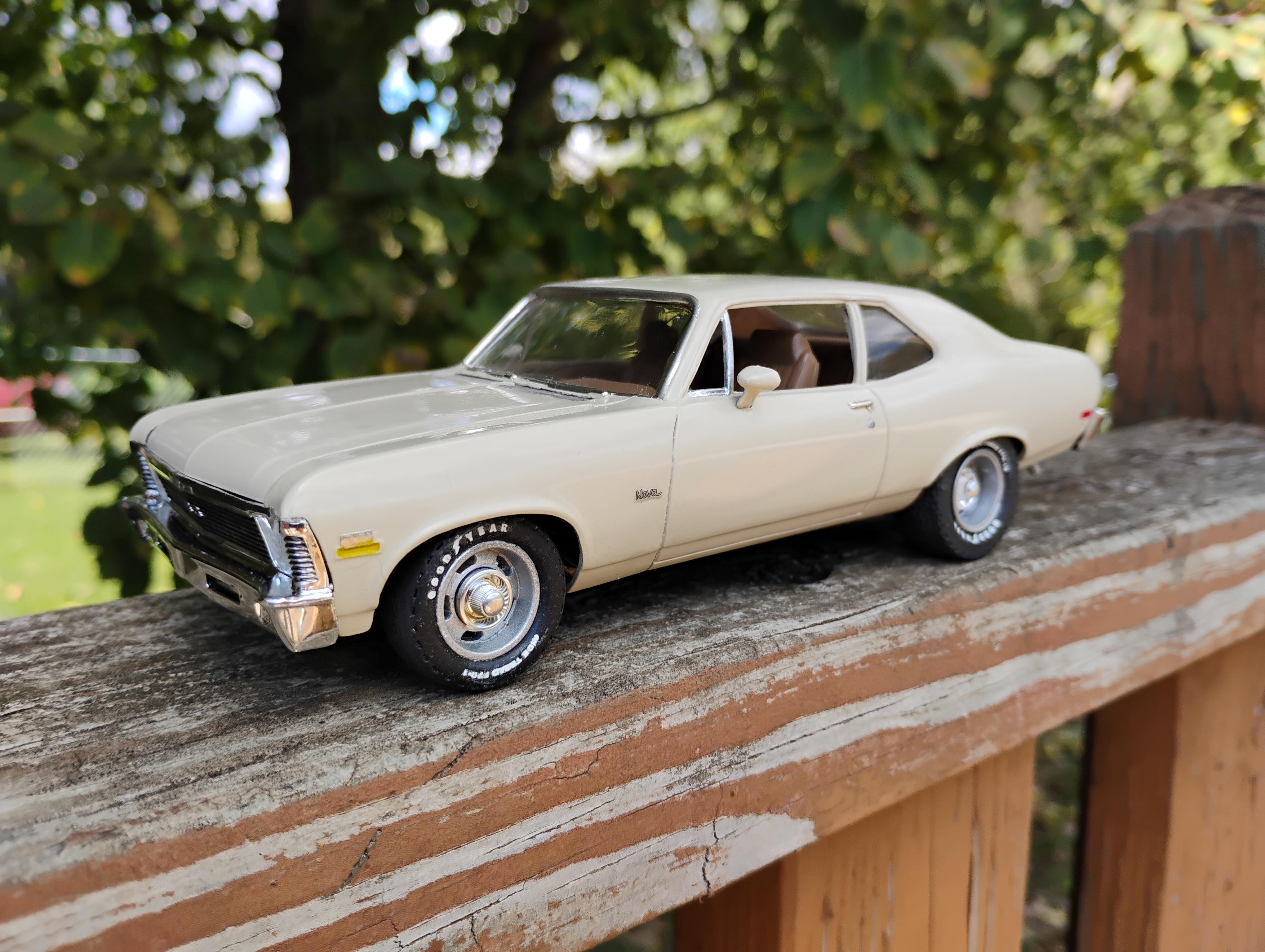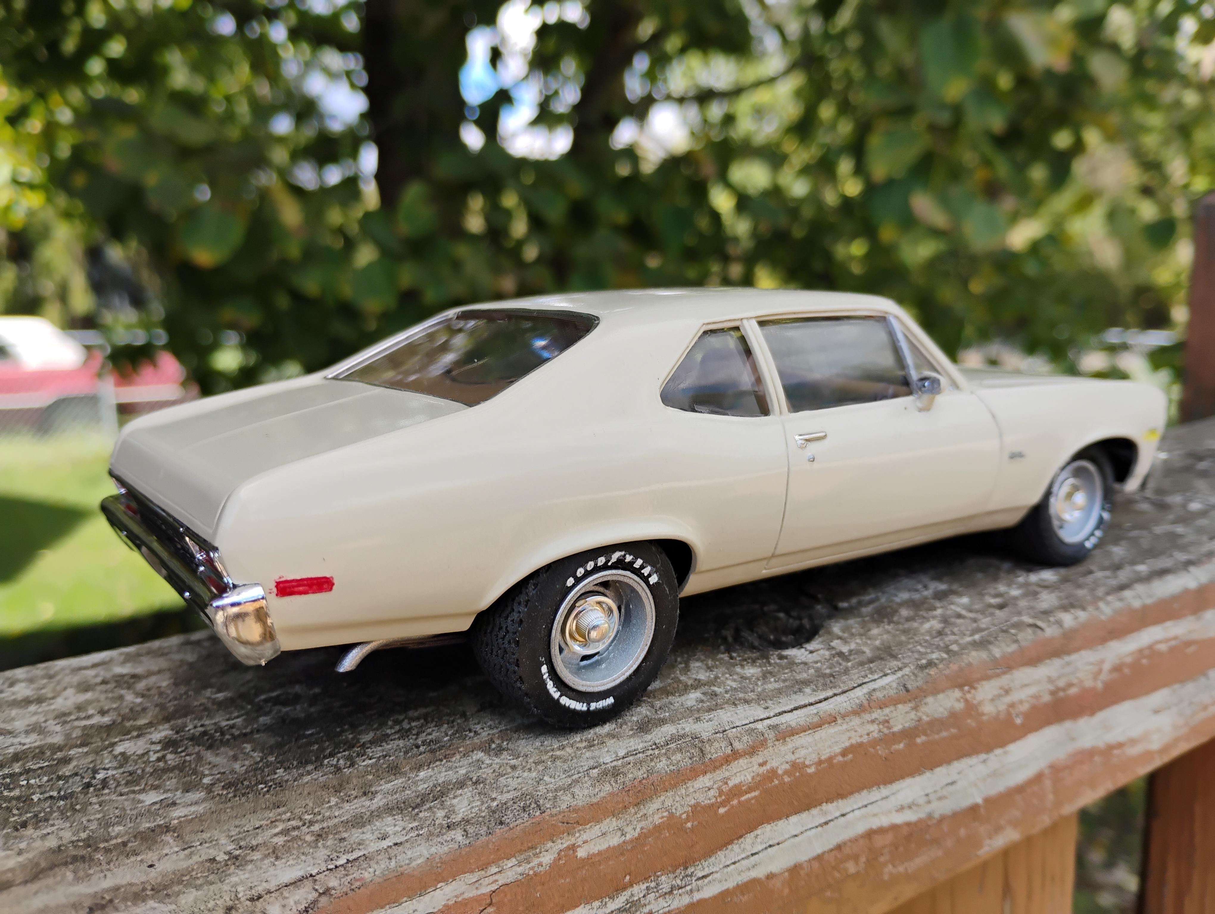 Sledsel Posted 11 hours ago Posted 11 hours ago (edited) After hearing a lot of complaints on a Facebook page about this kit I had to go get one and check it out. This was what I consider a quick build for me. Took a few weeks of an hour or so every few days. It is by no means perfect. It actually went together pretty good, there were a few issues but nothing that made me put it back in the box. My two biggest issues was the chassis not sitting straight when the interior was in. I shaved a little bit off the interior drive shaft hump, and a little off the top of the chassis plate in the same area. Also once the interior was in place the wheels weren't in the wheel wells correct. So therefore I shaved a little bit off of the rear of the interior tub and I shaved a little bit off the rear wheel wells so the chassis could move forward. Those were the biggest issues I had. The car is finished with Rust-Oleum gloss almond, no rubbing or buffing done. And the interior is Rust-Oleum nutmeg. I wanted this build to look somewhat like a sleeper so I had removed the rocker moldings, hood vents and decided no chrome around the door and quarter glass. I did add a few details to it and used a set of 1969 Chevelle wheels on it. (thank you to pulln4dejr for the trade) It needs a few post build touch-up but I am calling it done. I actually liked this kit and plan to get another. Edited 9 hours ago by Sledsel 11