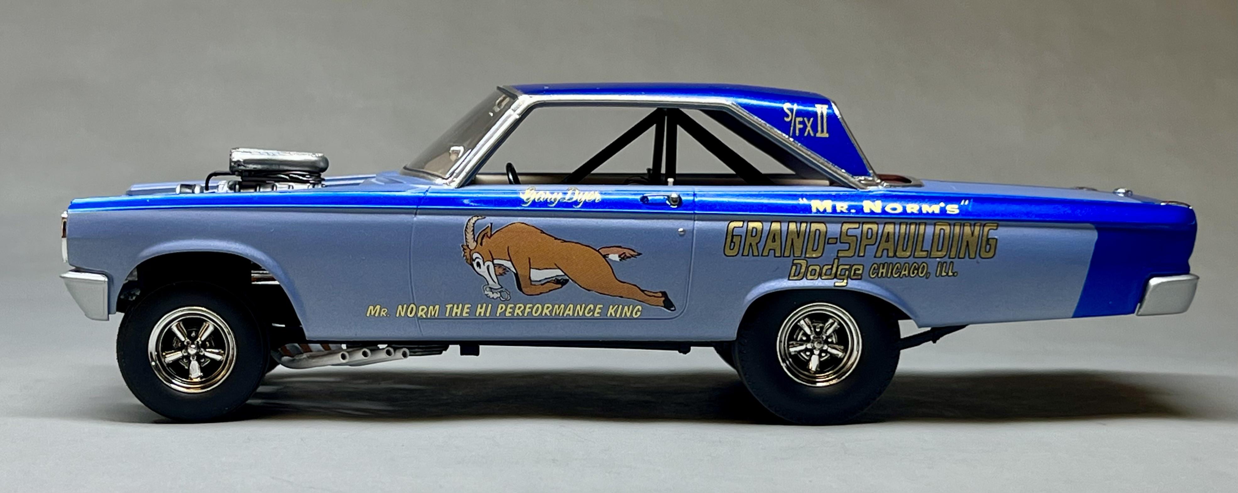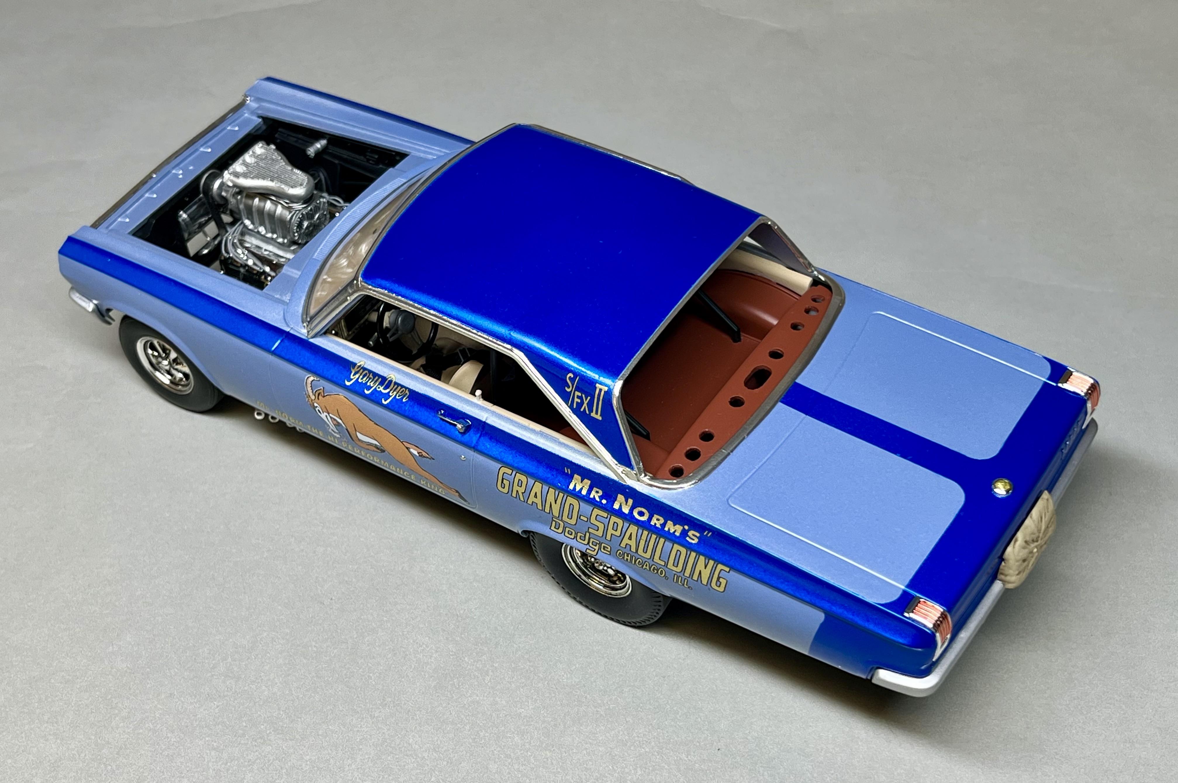 papajohn97 Posted Saturday at 02:50 AM Posted Saturday at 02:50 AM This one was the most challenging, the gutted supercharged NHRA rule-breaking match racer that Gary Dyer briefly held the 1/4 mile record for door slammers in Oct '65 at Lions. I had to scratch-build a straight axle for the front end, probably not accurate but good enough, grafted a resin AT to block and the blower, manifold and bug catcher/ injector are resin parts from Speed City. I also scratch-built the headers and fuel pump and had to do major surgery (after painting and decaling, I hate it when that happens) to get the aluminum nitro fuel tank to fit in front of engine bay. Paints used were ScaleFinishes HOC PBC36 TruBlue base lacquer over Tamiya Pearl Light Blue lacquer. Decals were from Fremont Racing Specialties. Really pleased with how this one came out, it's my favorite of the five. Thanks for looking! Cheers, John 15