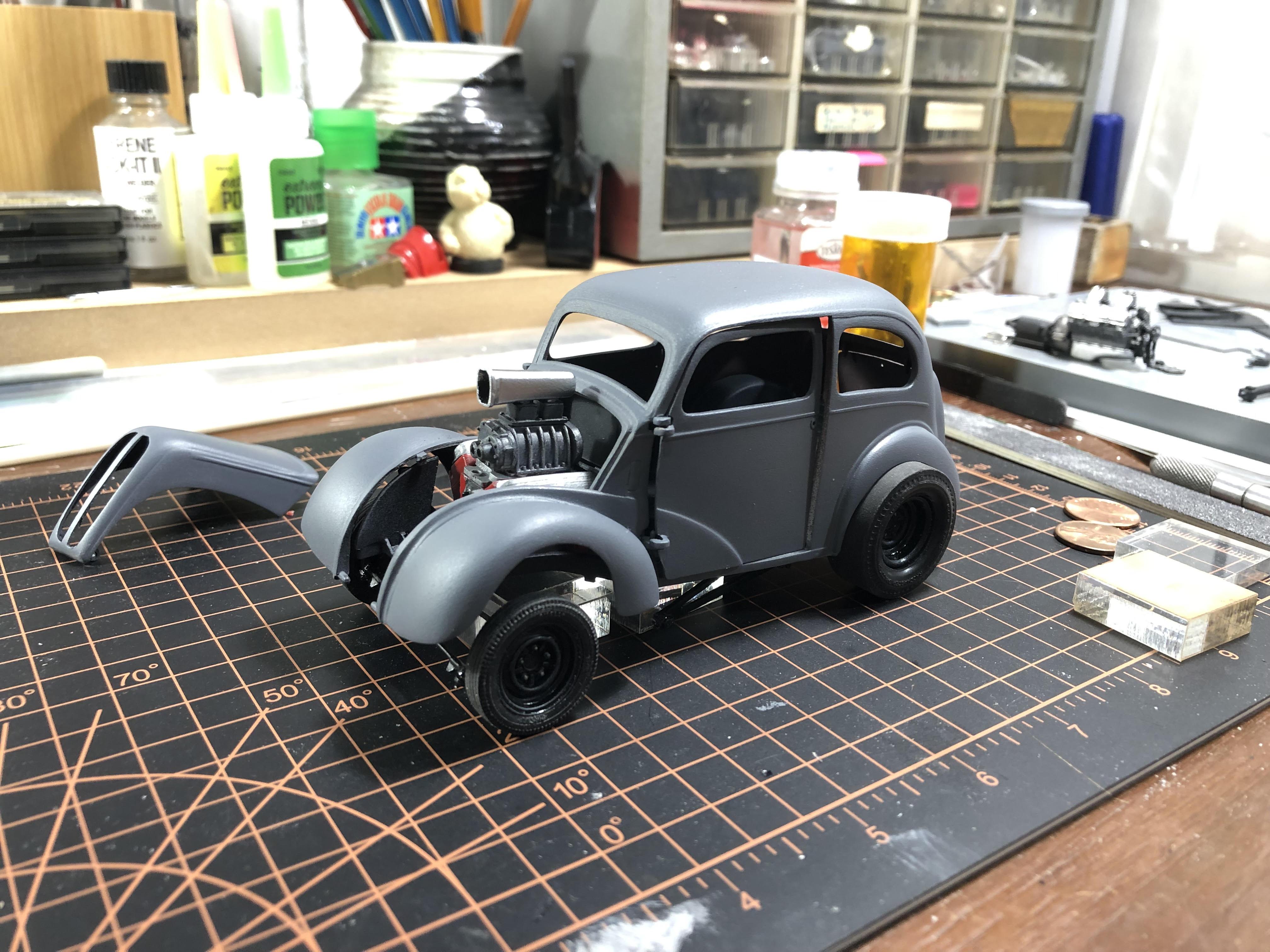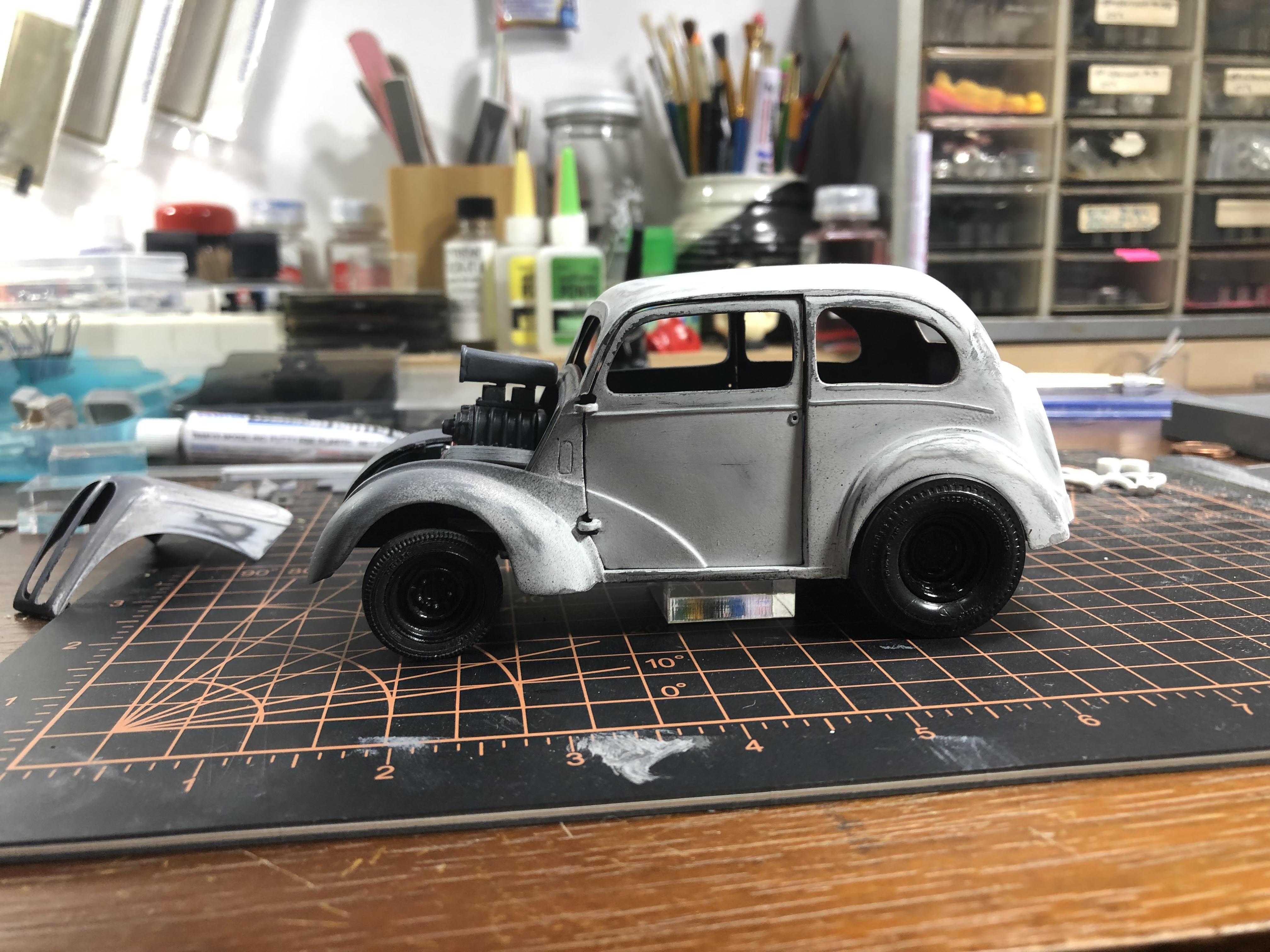 dust collectors Posted Sunday at 04:18 PM Posted Sunday at 04:18 PM This is a long stalled project that I recently decided to revisit. Motor is the blown Olds from the amt willies. Wheels are parts box steelies and rear pie crust slicks are from the Tosca Ford Fairlane kit if I'm not mistaken. Plans are to finish it in primer with a gutted interior to resemble a low buck build from the early sixties. Not going to go crazy on this one just going to have some fun and hopefully build some momentum as winter approaches. Thanks for looking. 3 1