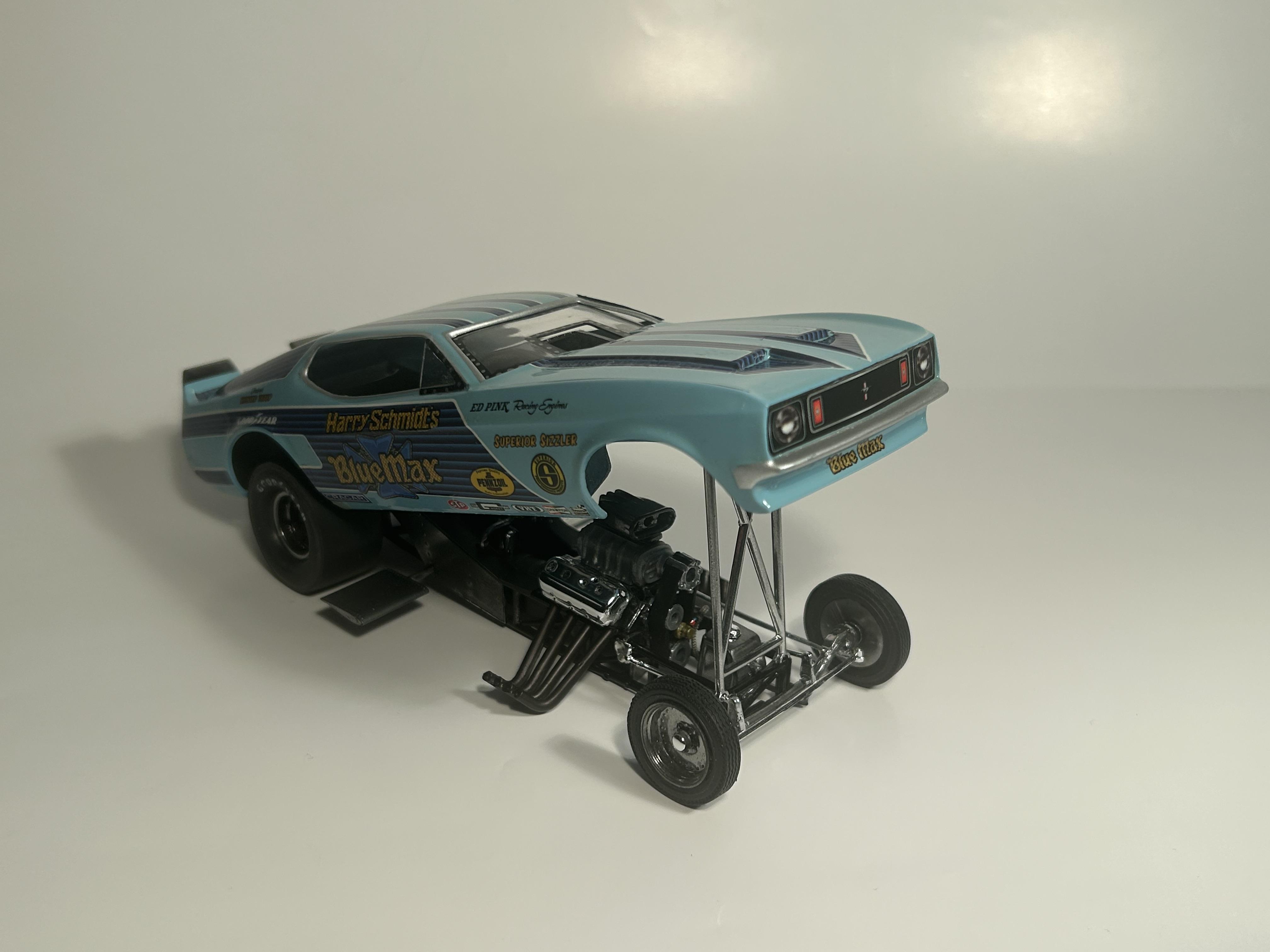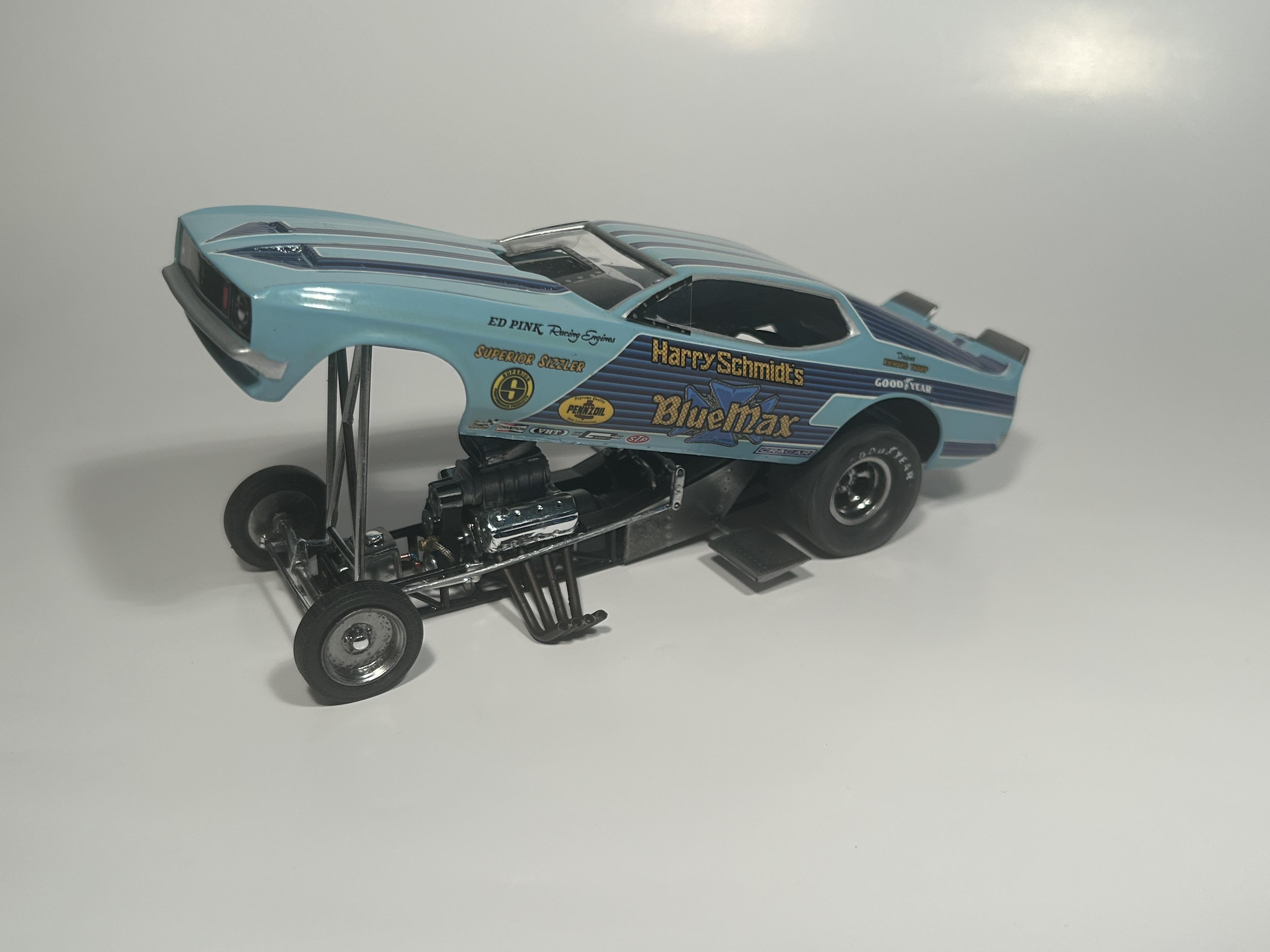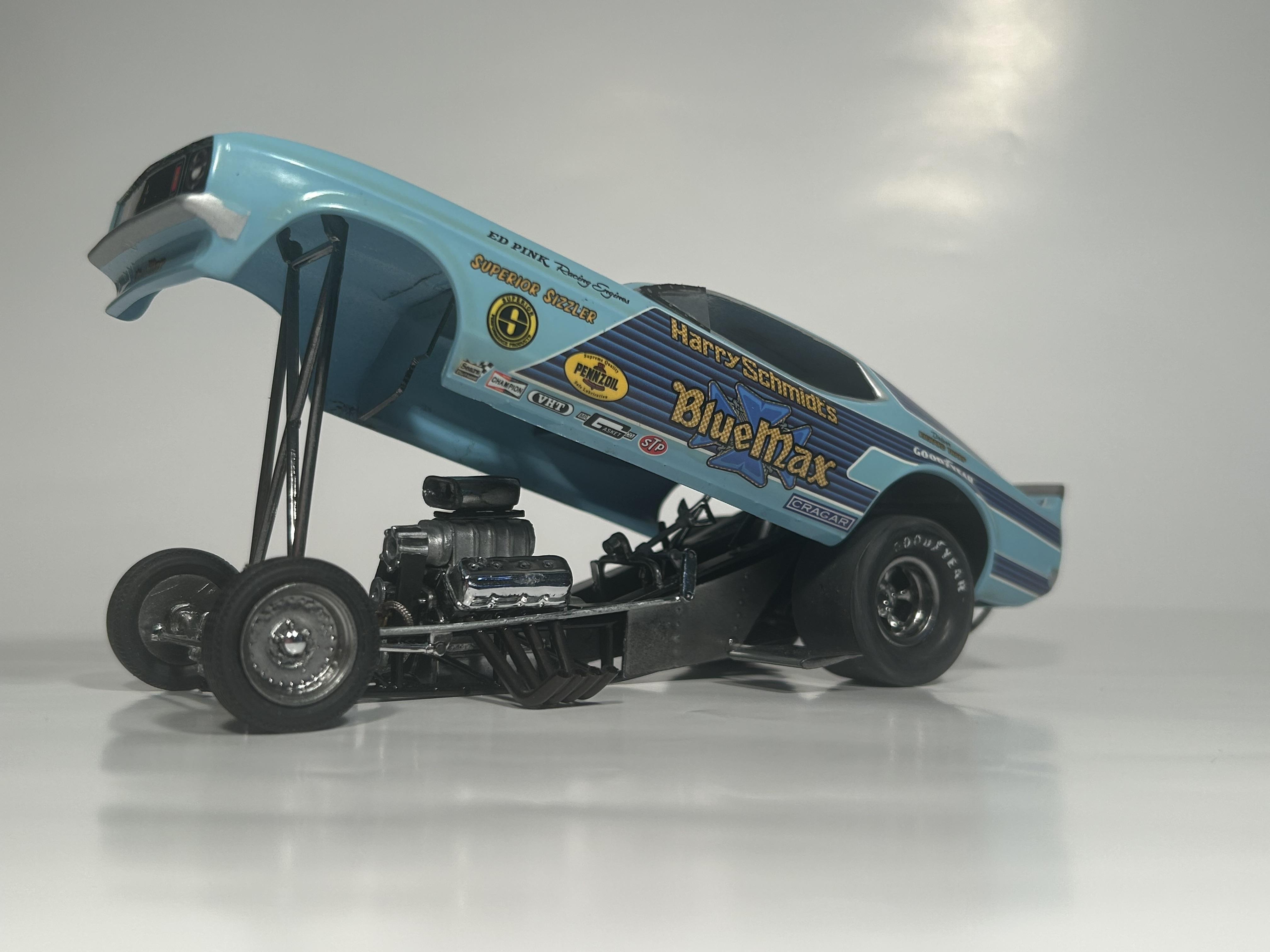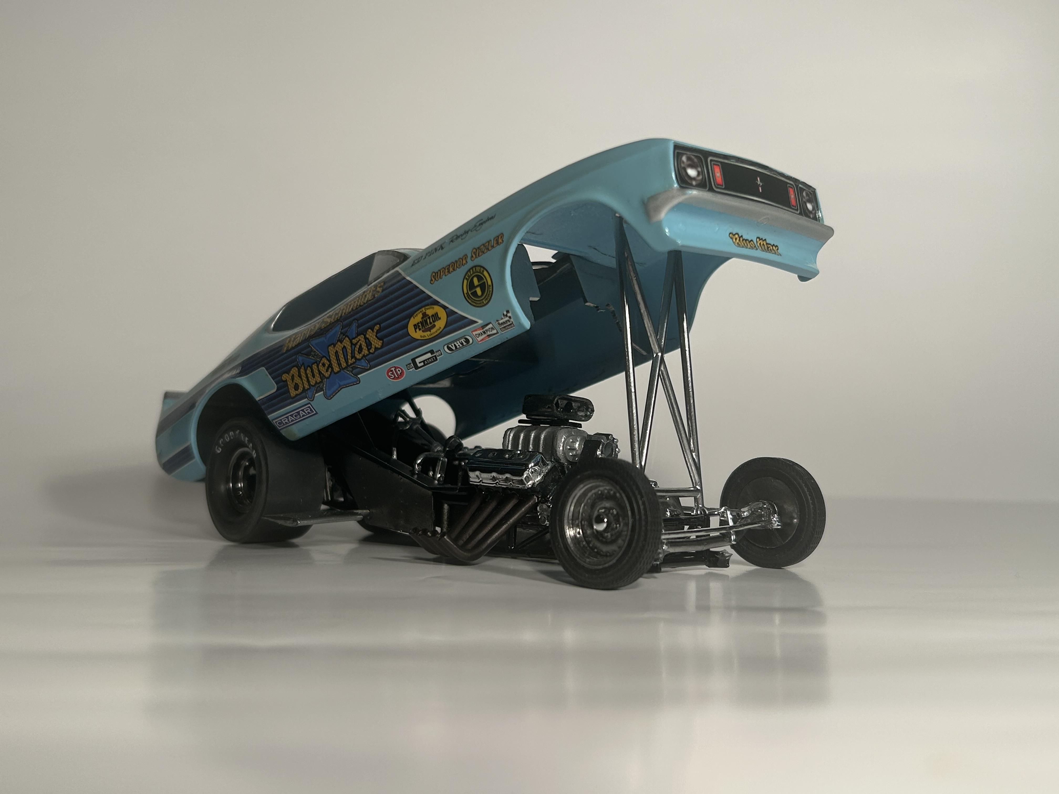 nickfzr61 Posted 19 hours ago Posted 19 hours ago (edited) My 1/25 scale MPC Blue Max funny car. Built OOB with the kit decals. I was going to add ignition wires and fuel lines but there wasn’t enough clearance to close the body. I had to remove the valve cover breathers to get the clam shell to close. Instructions were vague and took some trial and error. Also cut off the hinge for the body and moved it forward. I narrowed the front axle and the front wheels are from my parts box. The wing style spoiler was too low when mounted to the bottom of the chassis as the directions showed it so I cut it in half and drilled holes on each side of the driver’s compartment and glued it in on each side. Also added side glass. Edited 19 hours ago by nickfzr61 3