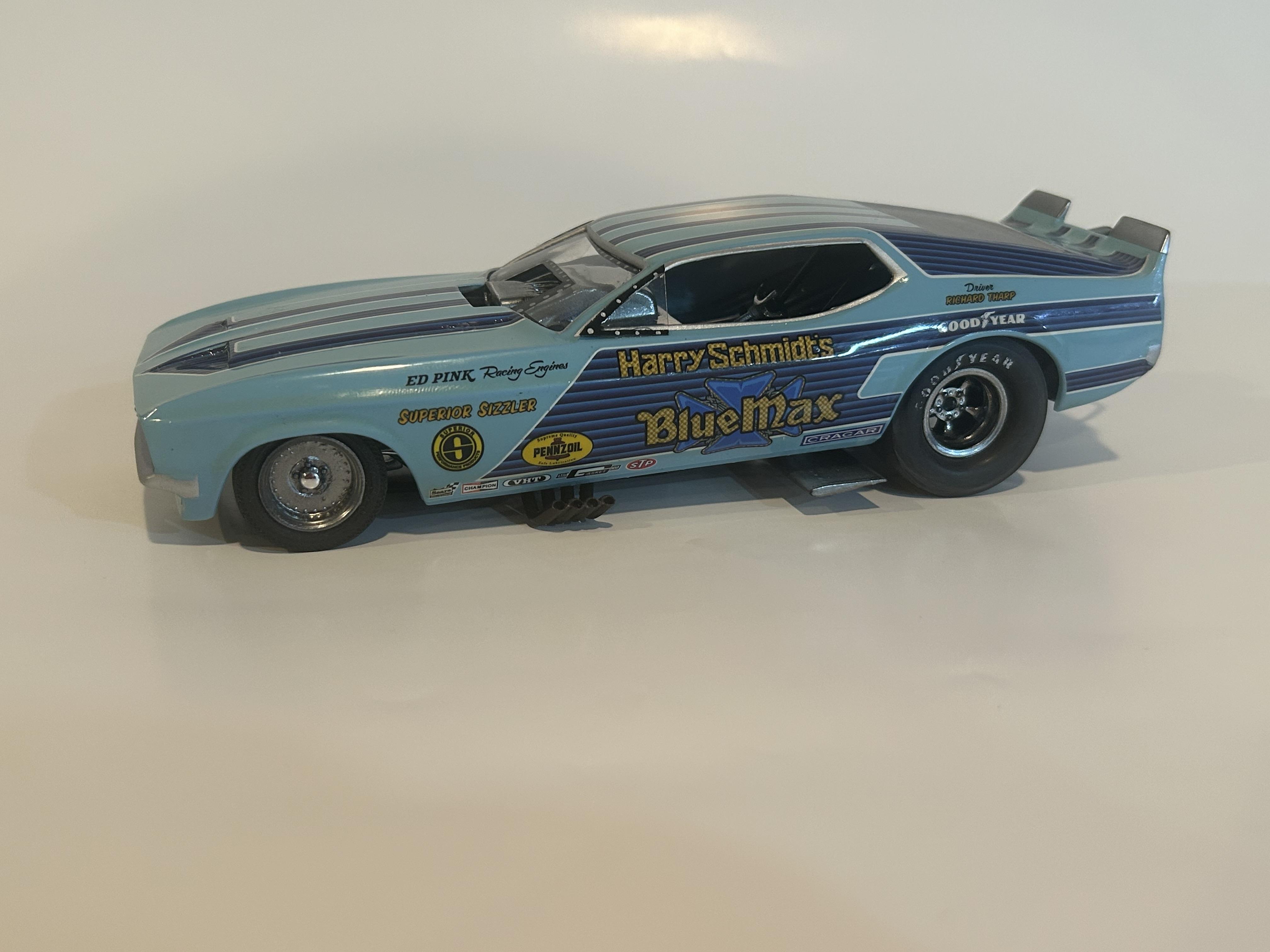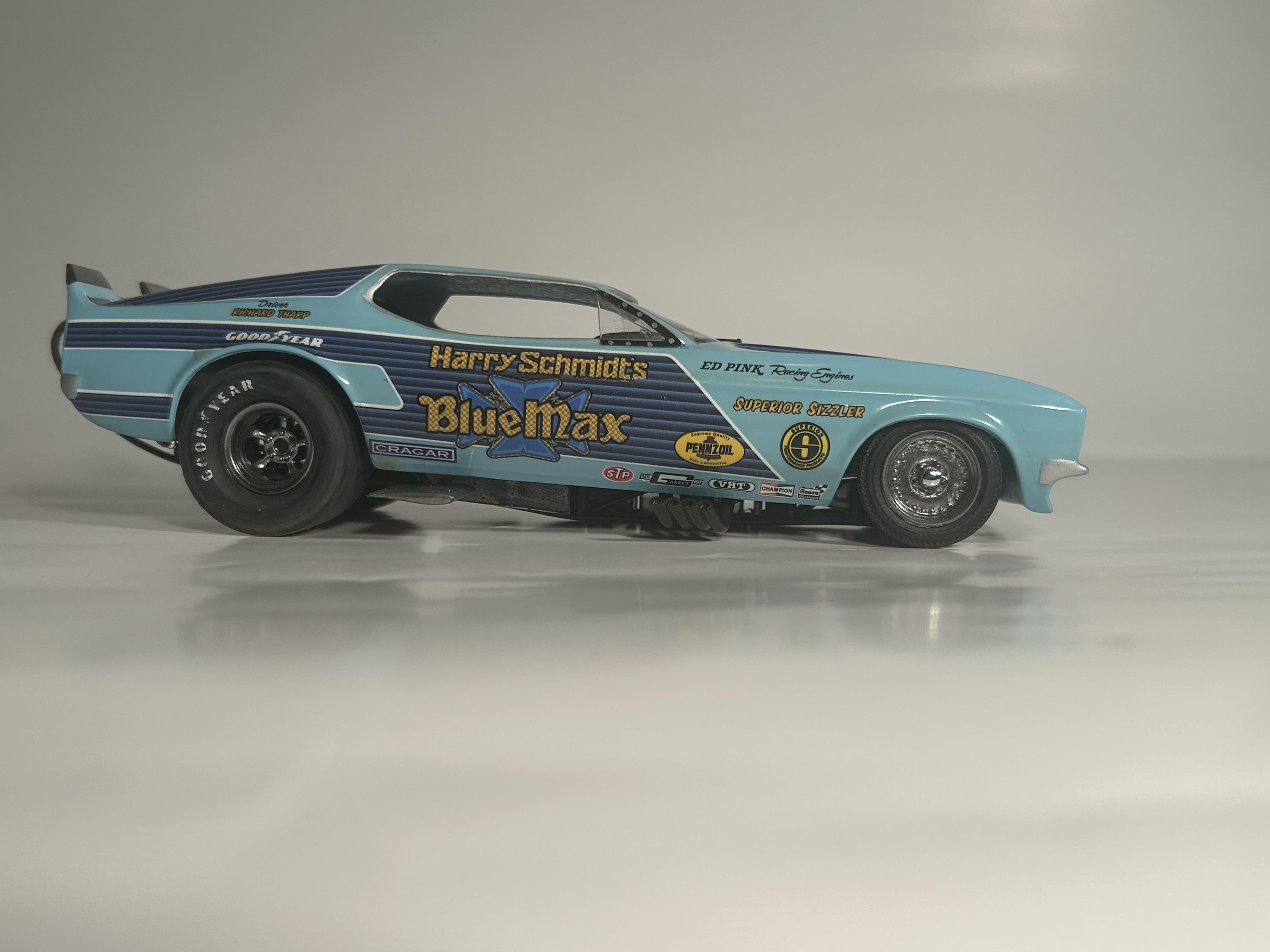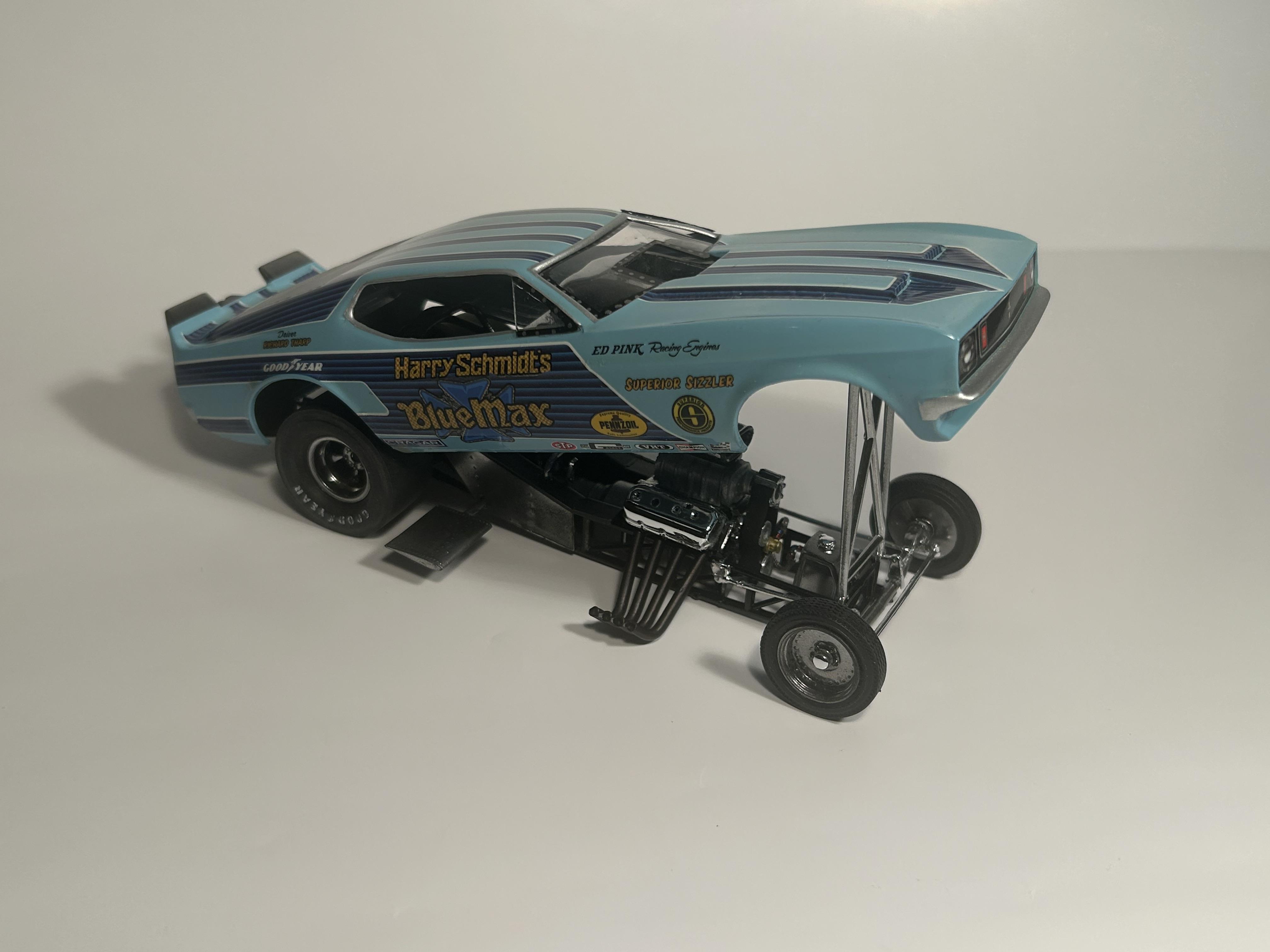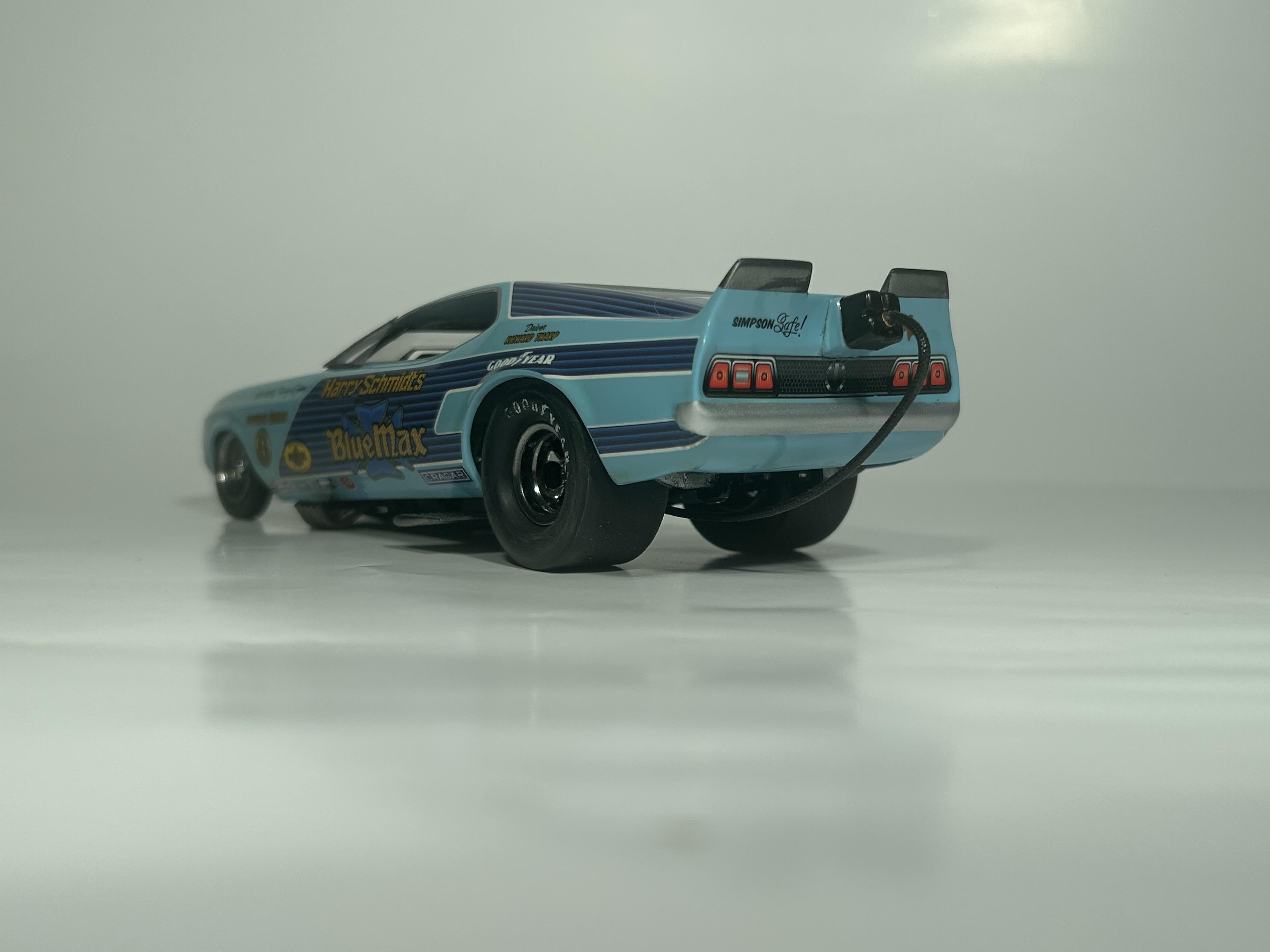 nickfzr61 Posted 19 hours ago Posted 19 hours ago (edited) My 1/25 scale MPC Blue Max funny car. Built OOB with the kit decals. I was going to add ignition wires and fuel lines but there wasn’t enough clearance to close the body. I had to remove the valve cover breathers to get the clam shell to close. Instructions were vague and took some trial and error. Also cut off the hinge for the body and moved it forward. I narrowed the front axle and the front wheels are from my parts box. The wing style spoiler was too low when mounted to the bottom of the chassis as the directions showed it so I cut it in half and drilled holes on each side of the driver’s compartment and glued it in on each side. Also added side glass. Edited 19 hours ago by nickfzr61 3