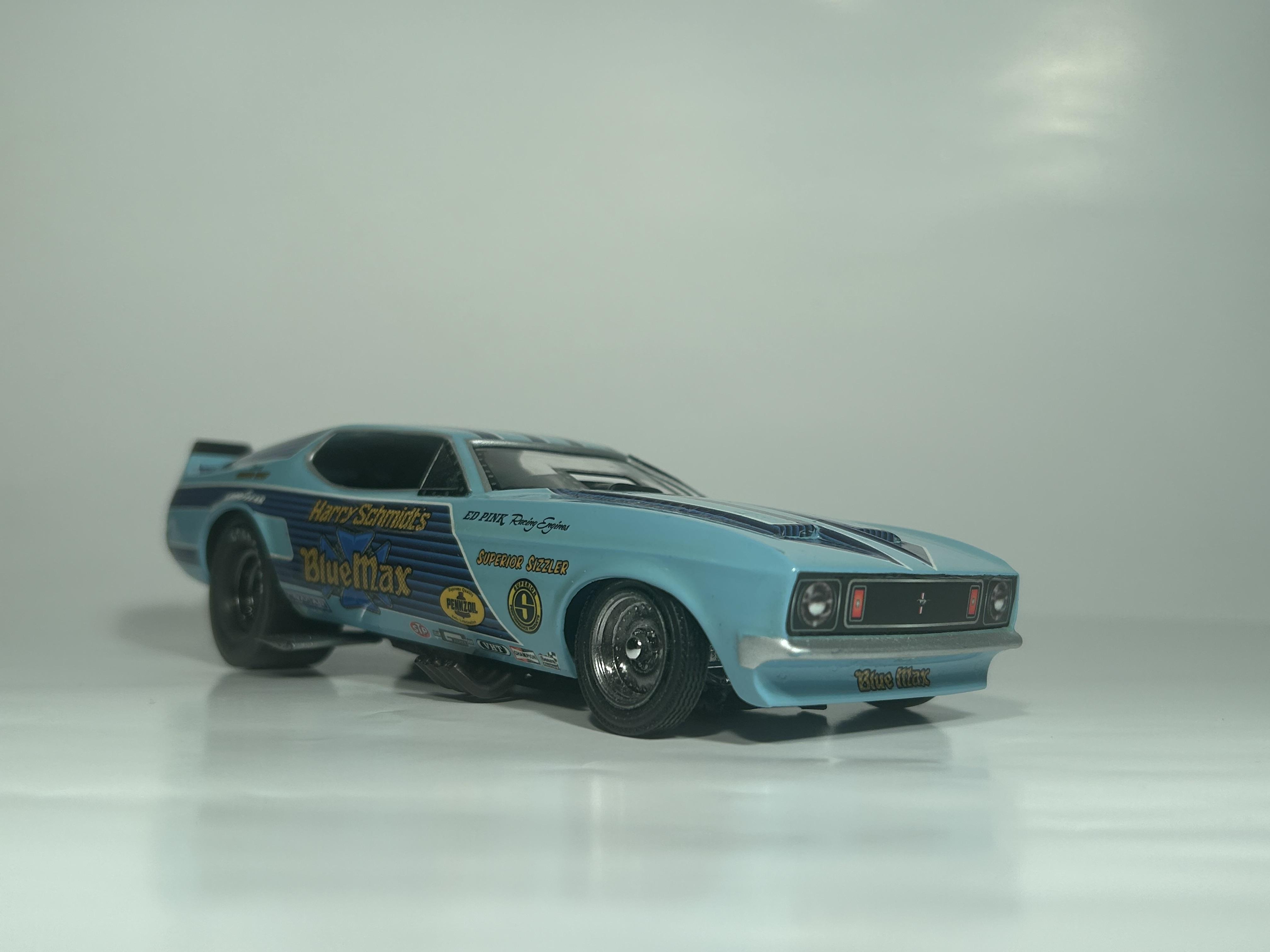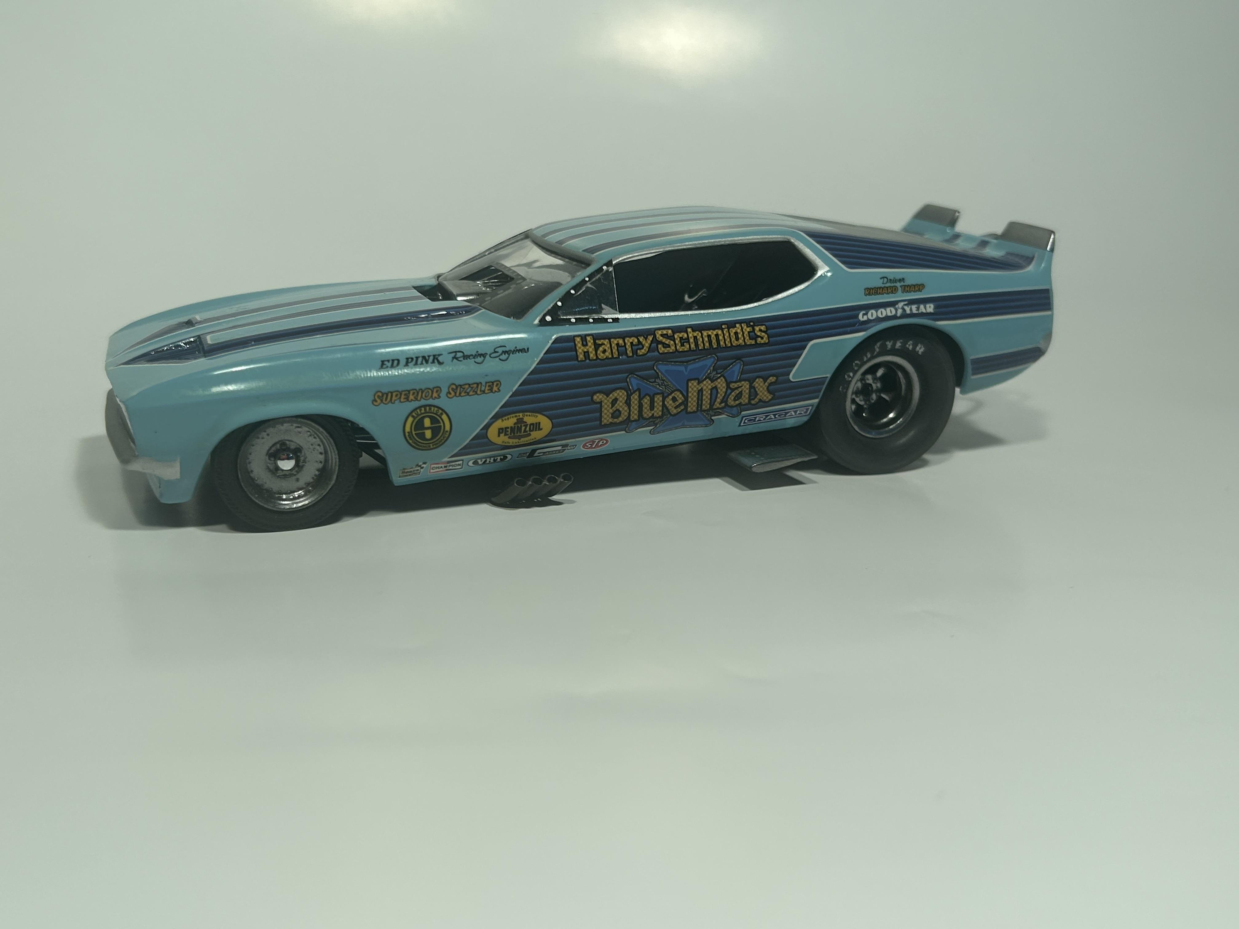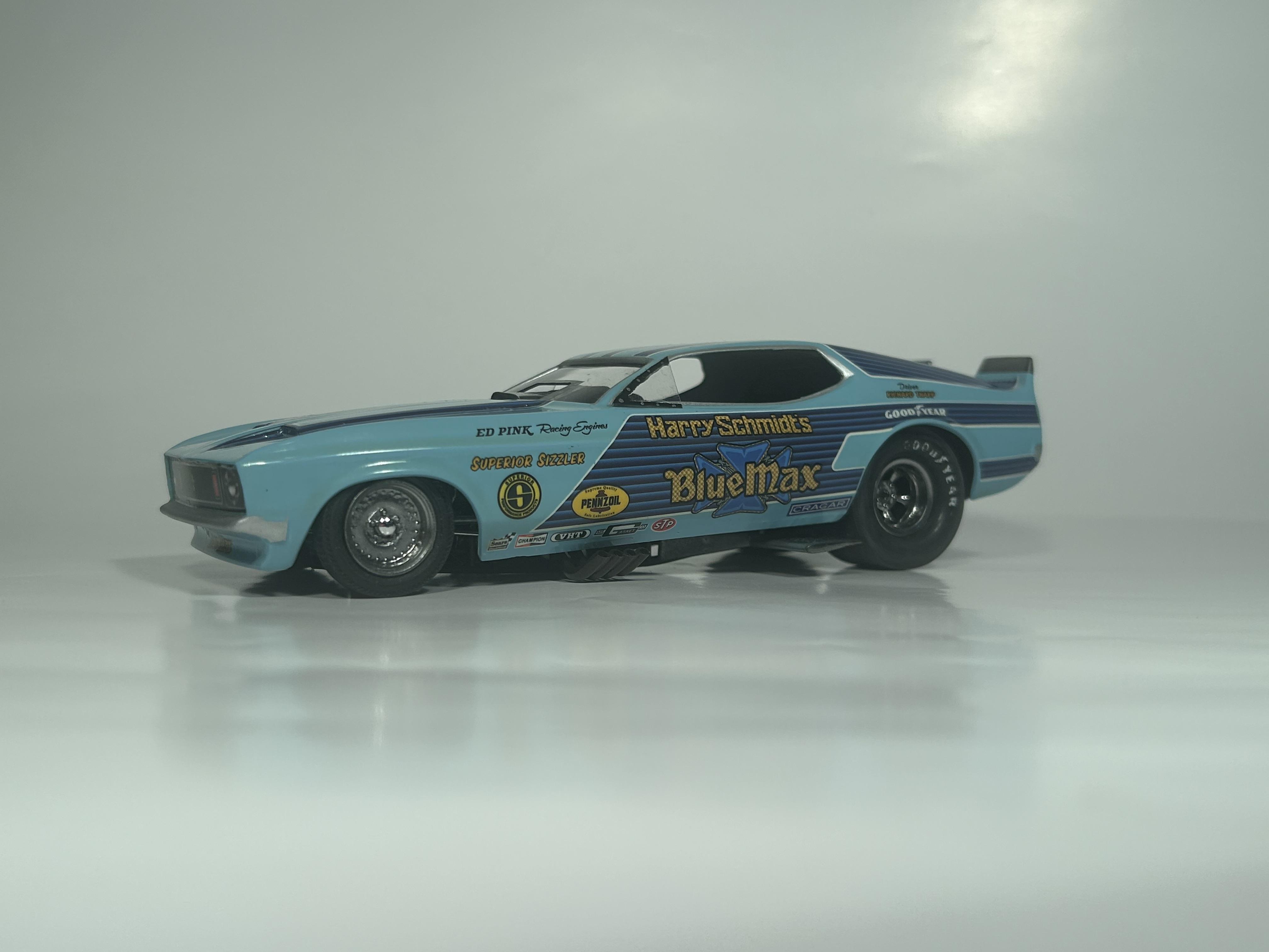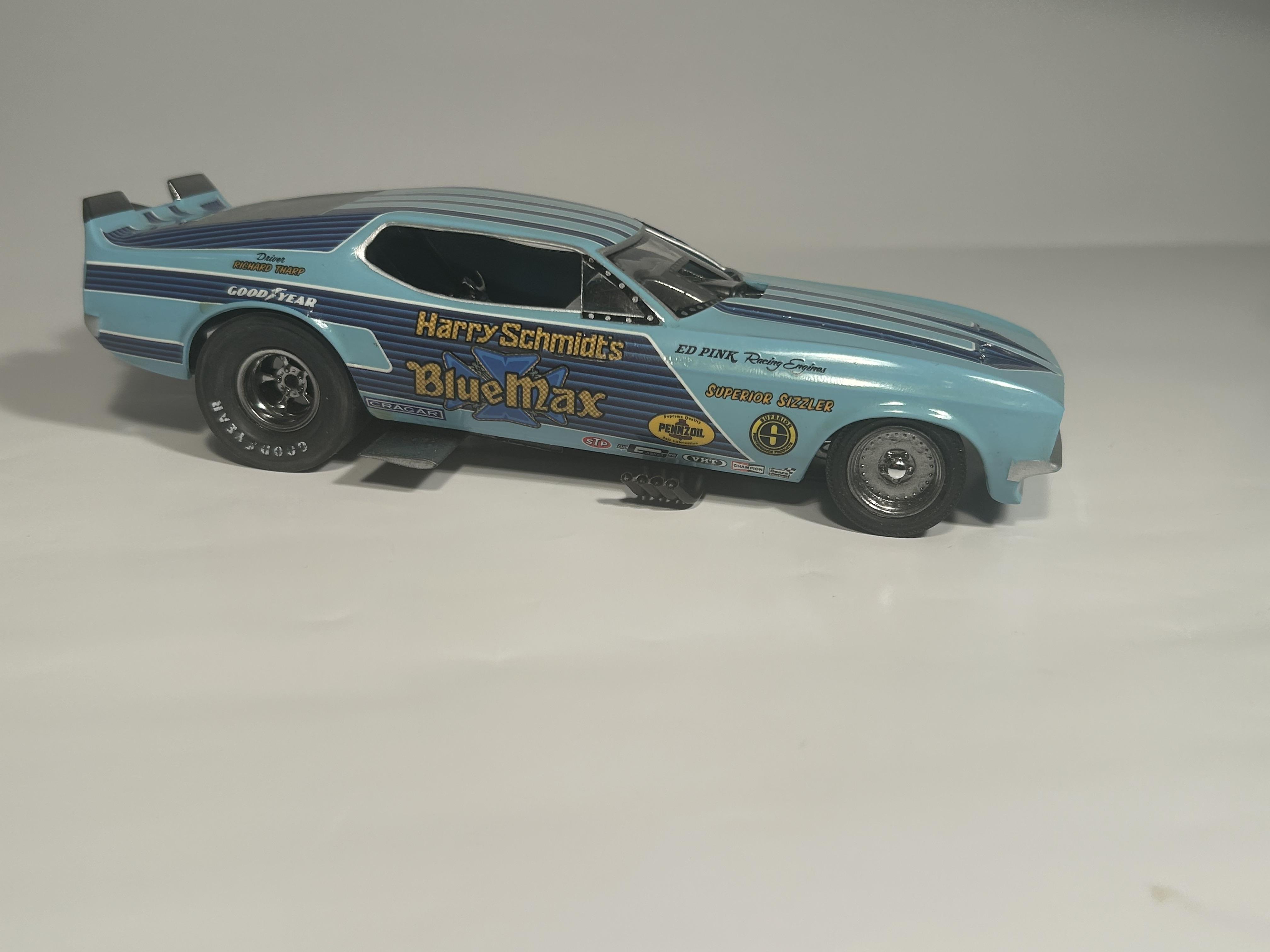 nickfzr61 Posted 19 hours ago Posted 19 hours ago (edited) My 1/25 scale MPC Blue Max funny car. Built OOB with the kit decals. I was going to add ignition wires and fuel lines but there wasn’t enough clearance to close the body. I had to remove the valve cover breathers to get the clam shell to close. Instructions were vague and took some trial and error. Also cut off the hinge for the body and moved it forward. I narrowed the front axle and the front wheels are from my parts box. The wing style spoiler was too low when mounted to the bottom of the chassis as the directions showed it so I cut it in half and drilled holes on each side of the driver’s compartment and glued it in on each side. Also added side glass. Edited 19 hours ago by nickfzr61 3