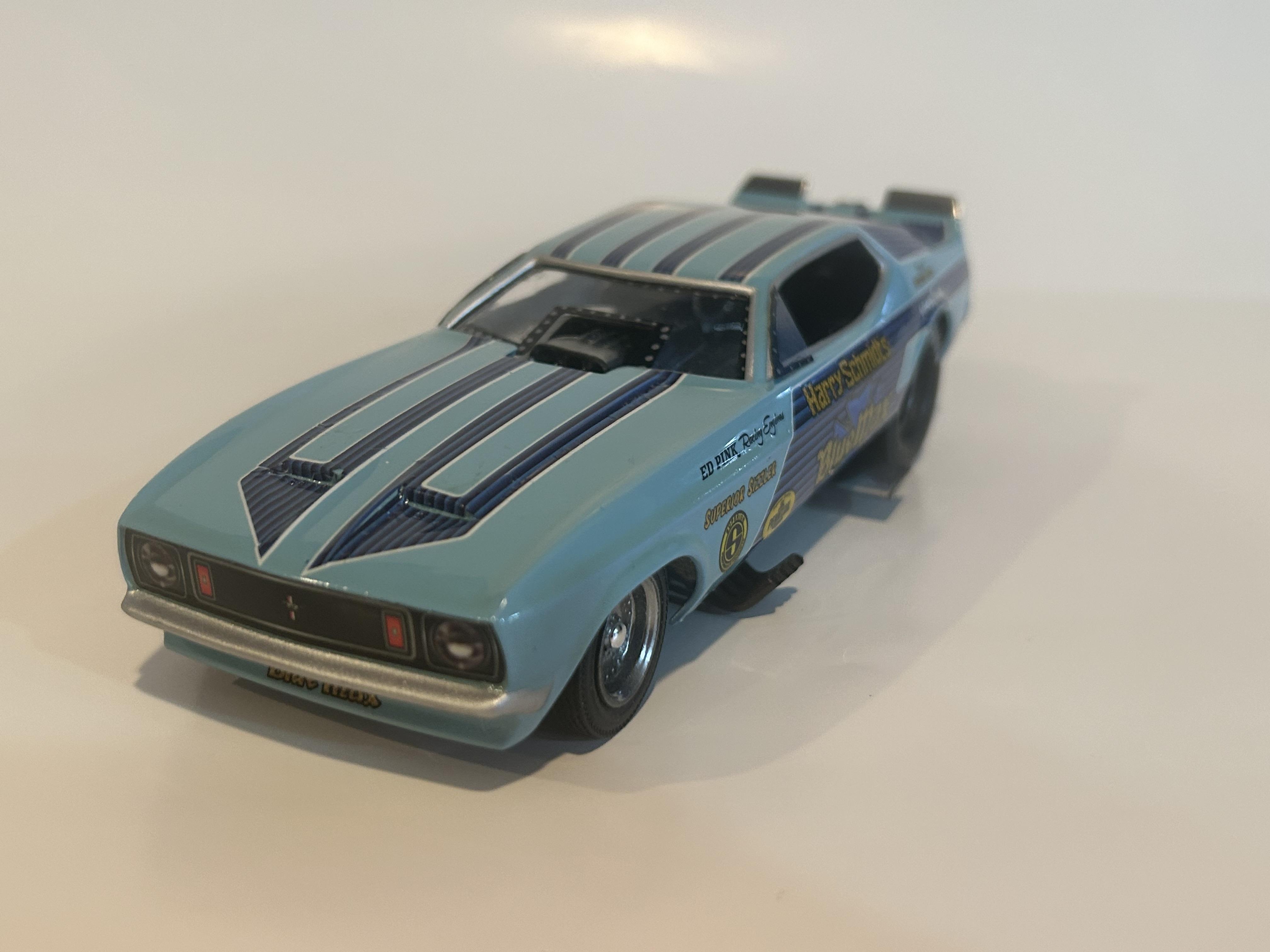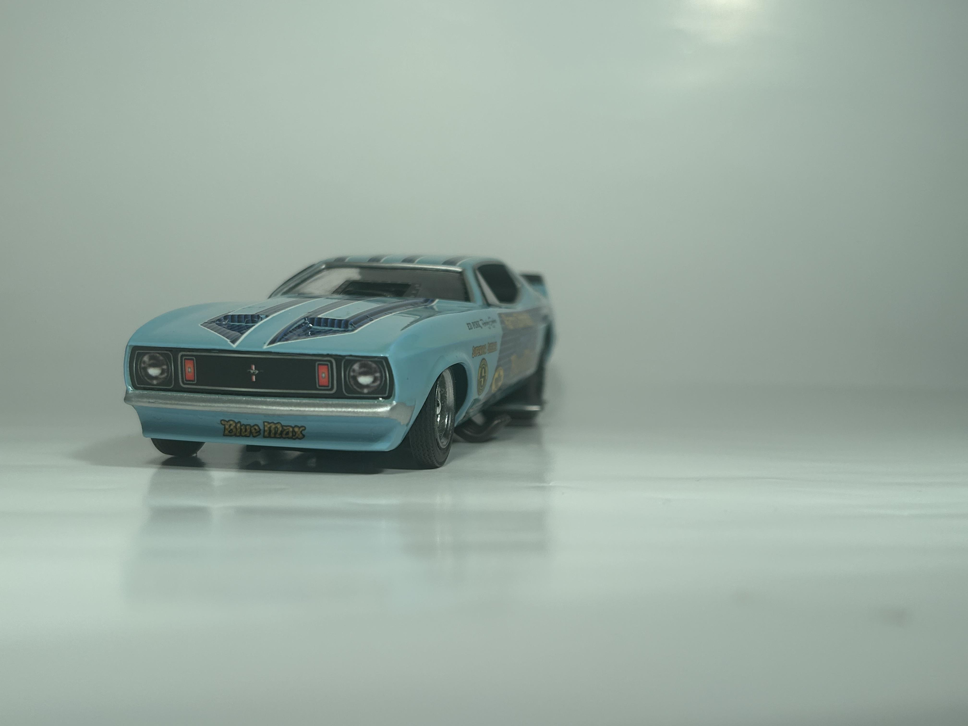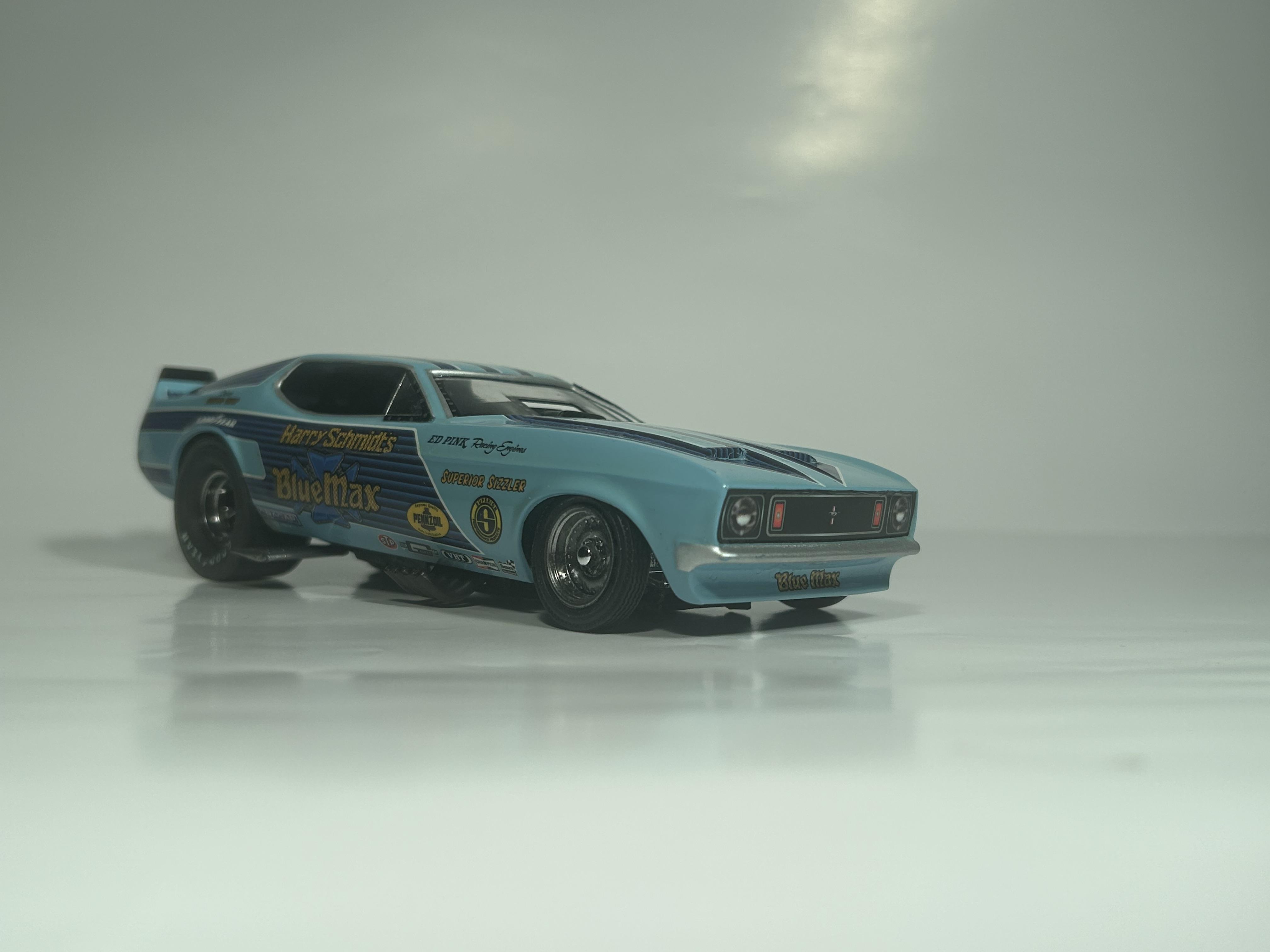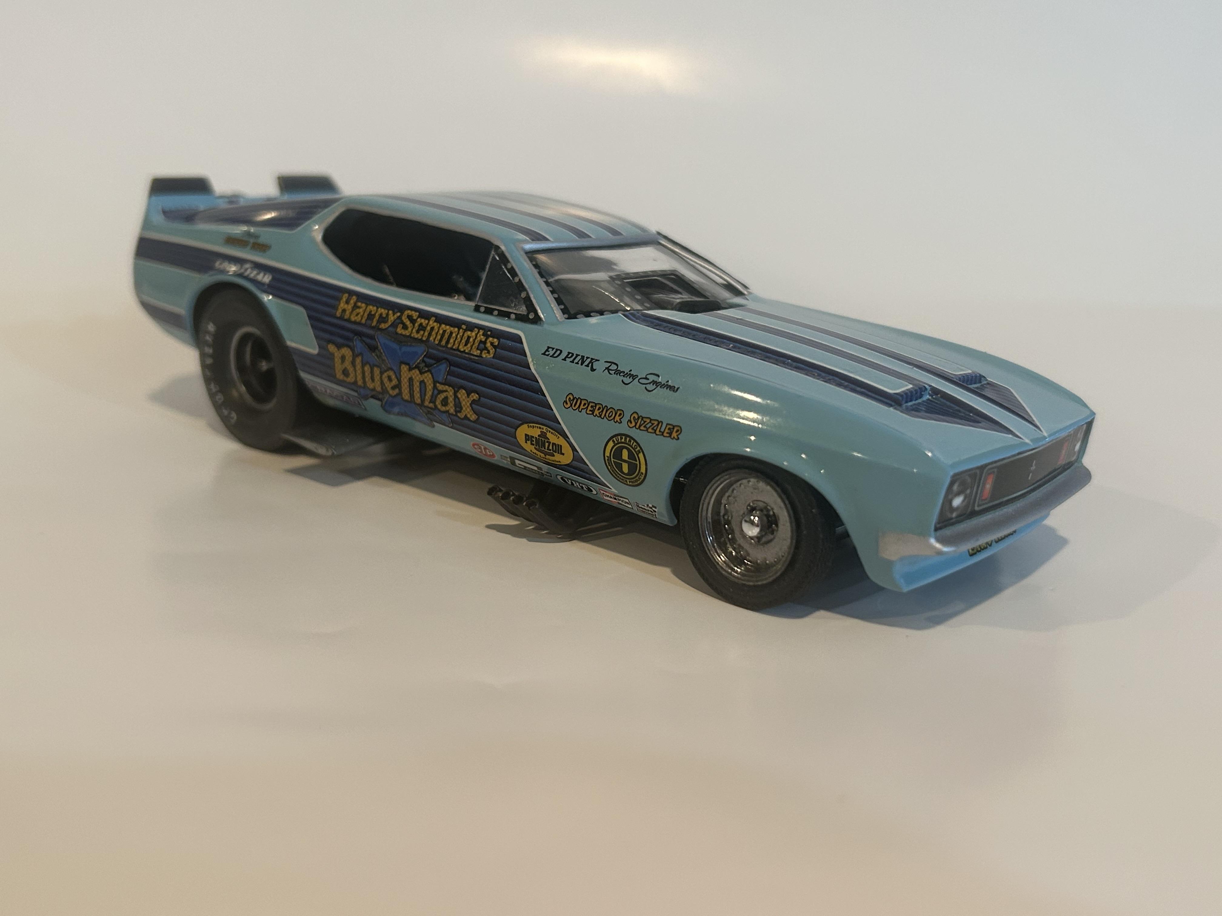 nickfzr61 Posted 19 hours ago Posted 19 hours ago (edited) My 1/25 scale MPC Blue Max funny car. Built OOB with the kit decals. I was going to add ignition wires and fuel lines but there wasn’t enough clearance to close the body. I had to remove the valve cover breathers to get the clam shell to close. Instructions were vague and took some trial and error. Also cut off the hinge for the body and moved it forward. I narrowed the front axle and the front wheels are from my parts box. The wing style spoiler was too low when mounted to the bottom of the chassis as the directions showed it so I cut it in half and drilled holes on each side of the driver’s compartment and glued it in on each side. Also added side glass. Edited 19 hours ago by nickfzr61 3