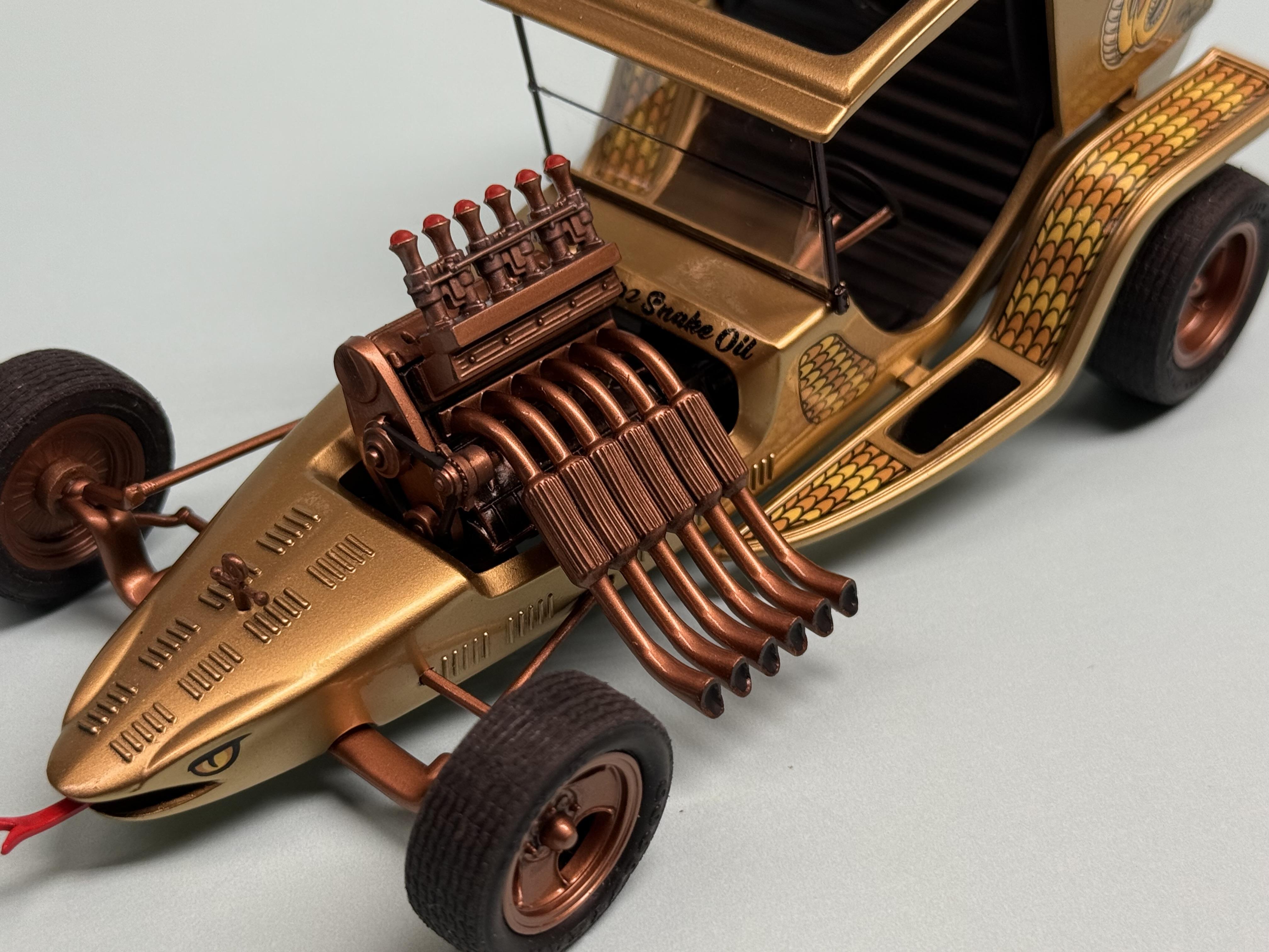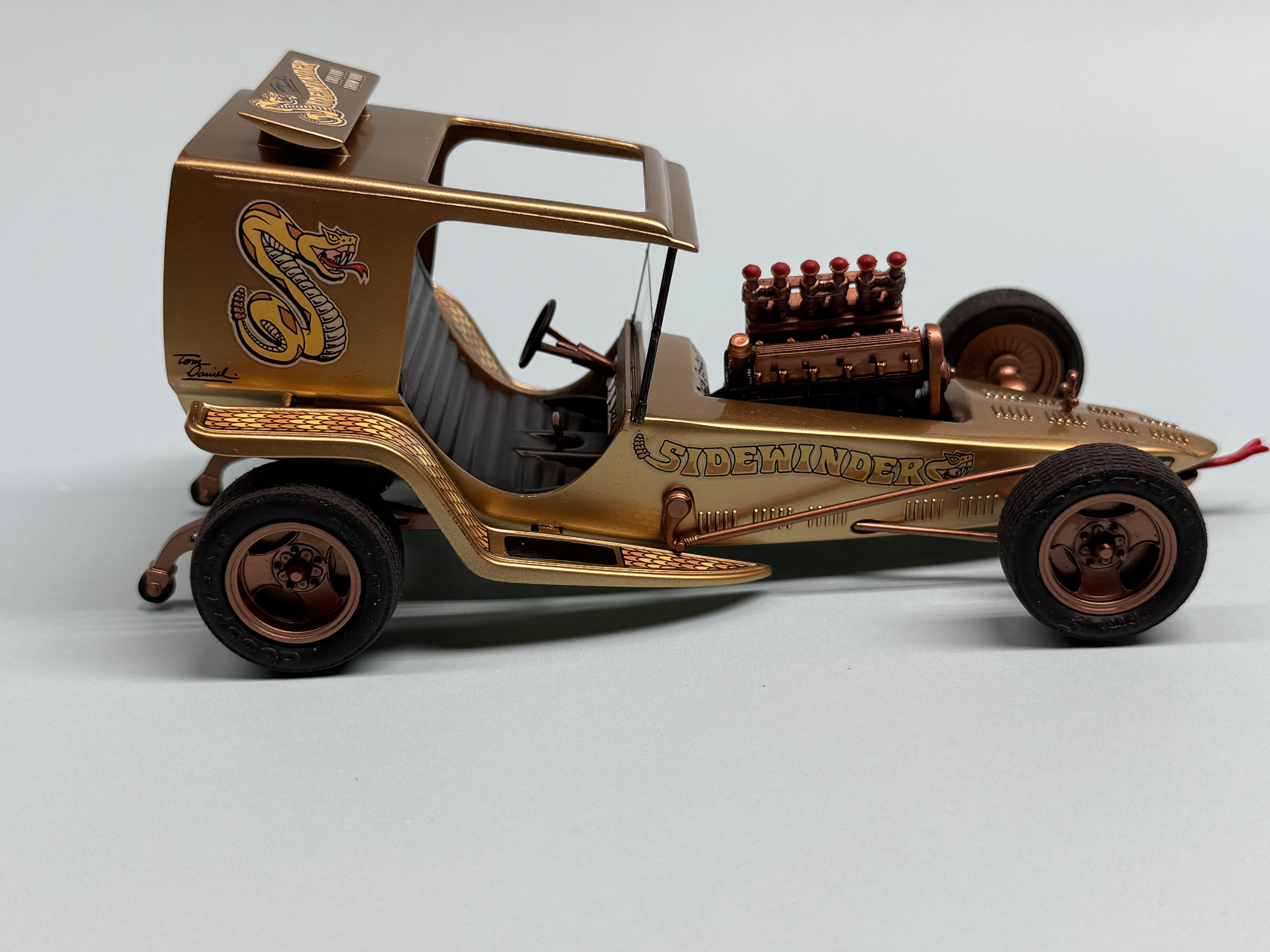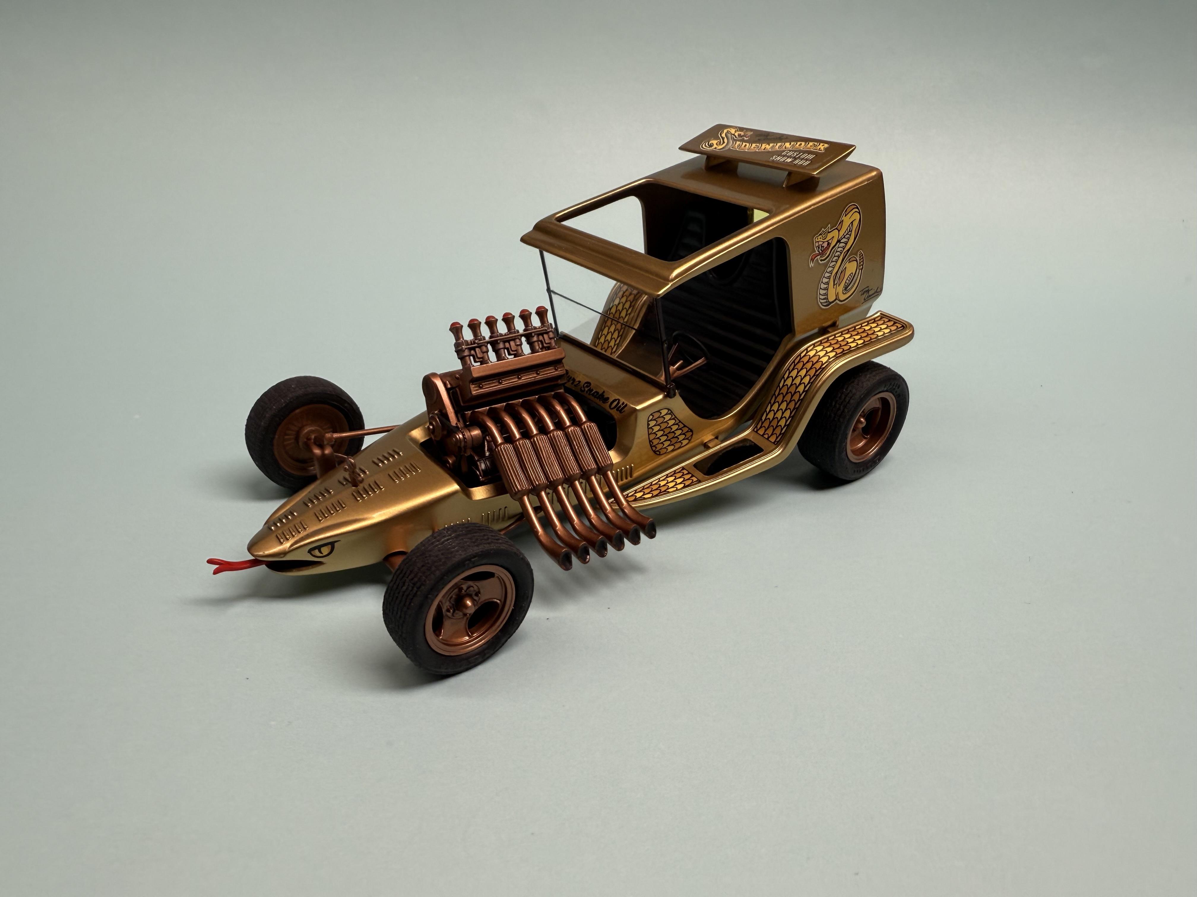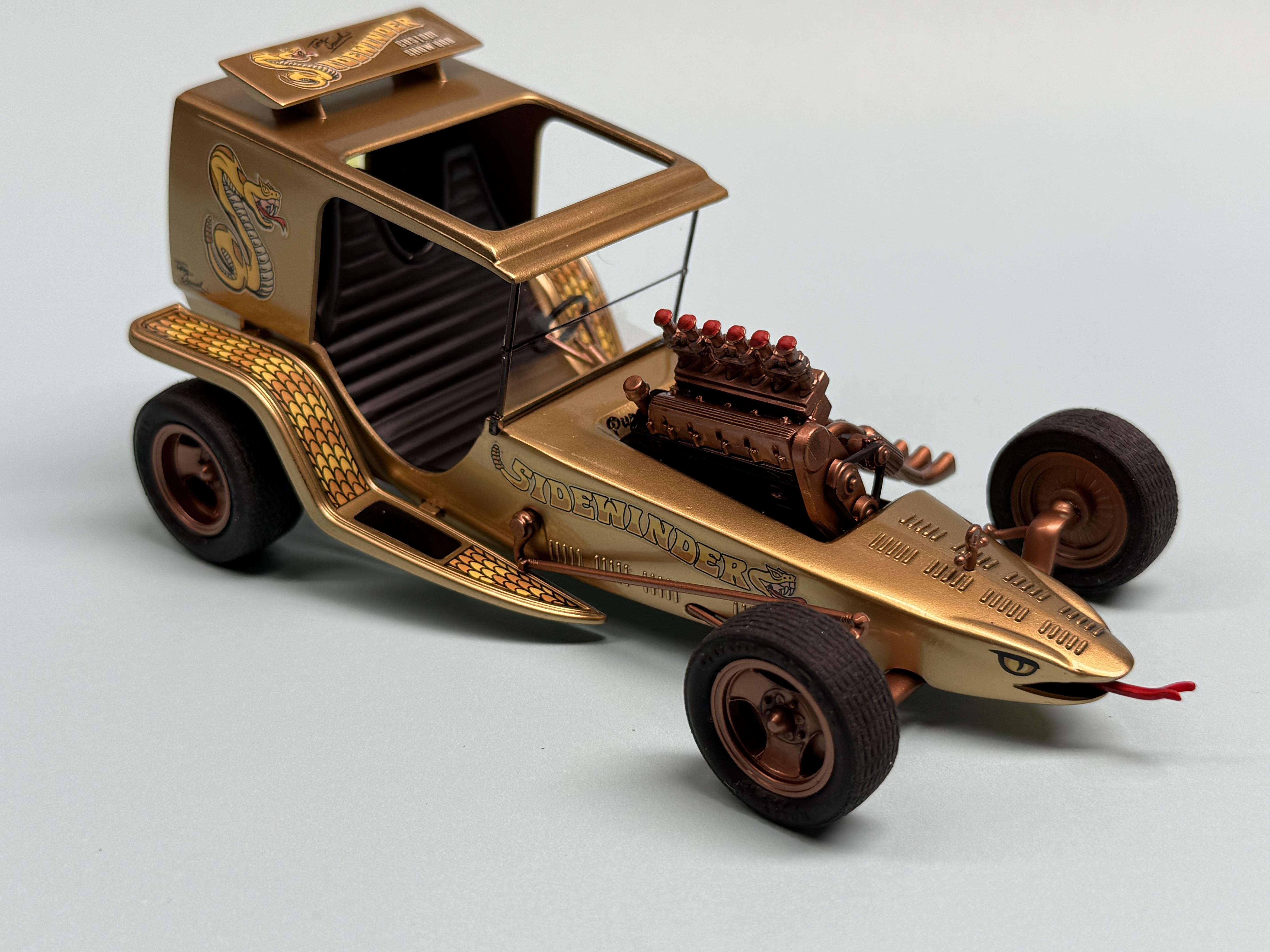 Silvercreeker Posted Tuesday at 09:01 PM Posted Tuesday at 09:01 PM The Sidewinder is done. This was built for Box Stock class and I copied the box art as close as possible. As is with Box Stock, I added nothing that did not come in the box. All body seams were molded together before paint. Color is Alclad Pale Gold. All chrome was stripped and painted Alclad Copper. A simple build to go along with the much more involved Sidewinder “Snake Bitten” built at the same time. Happy Halloween! 5