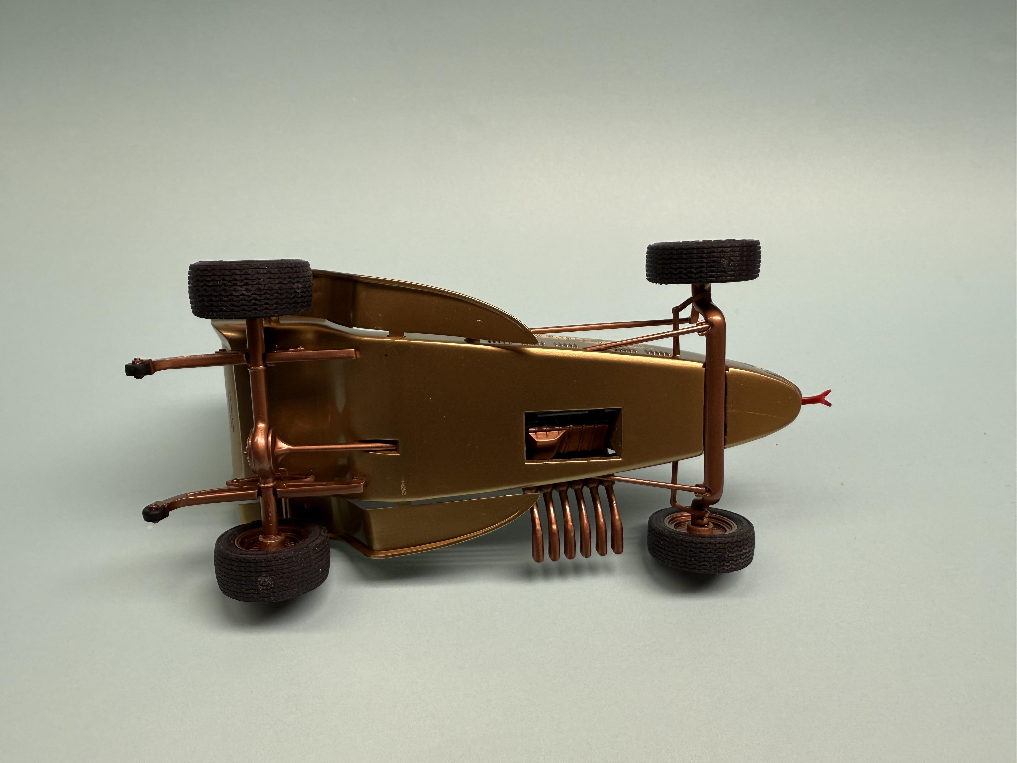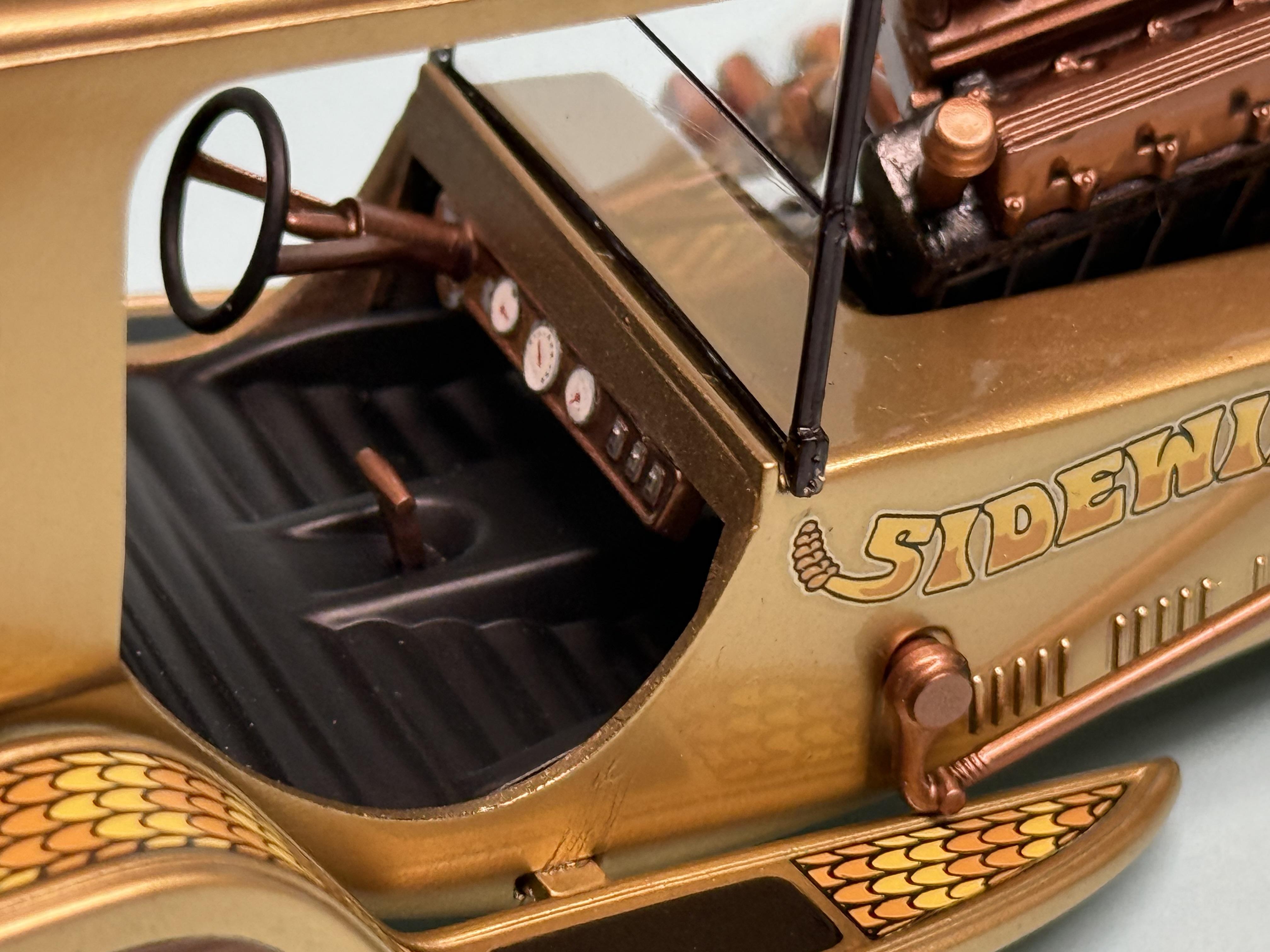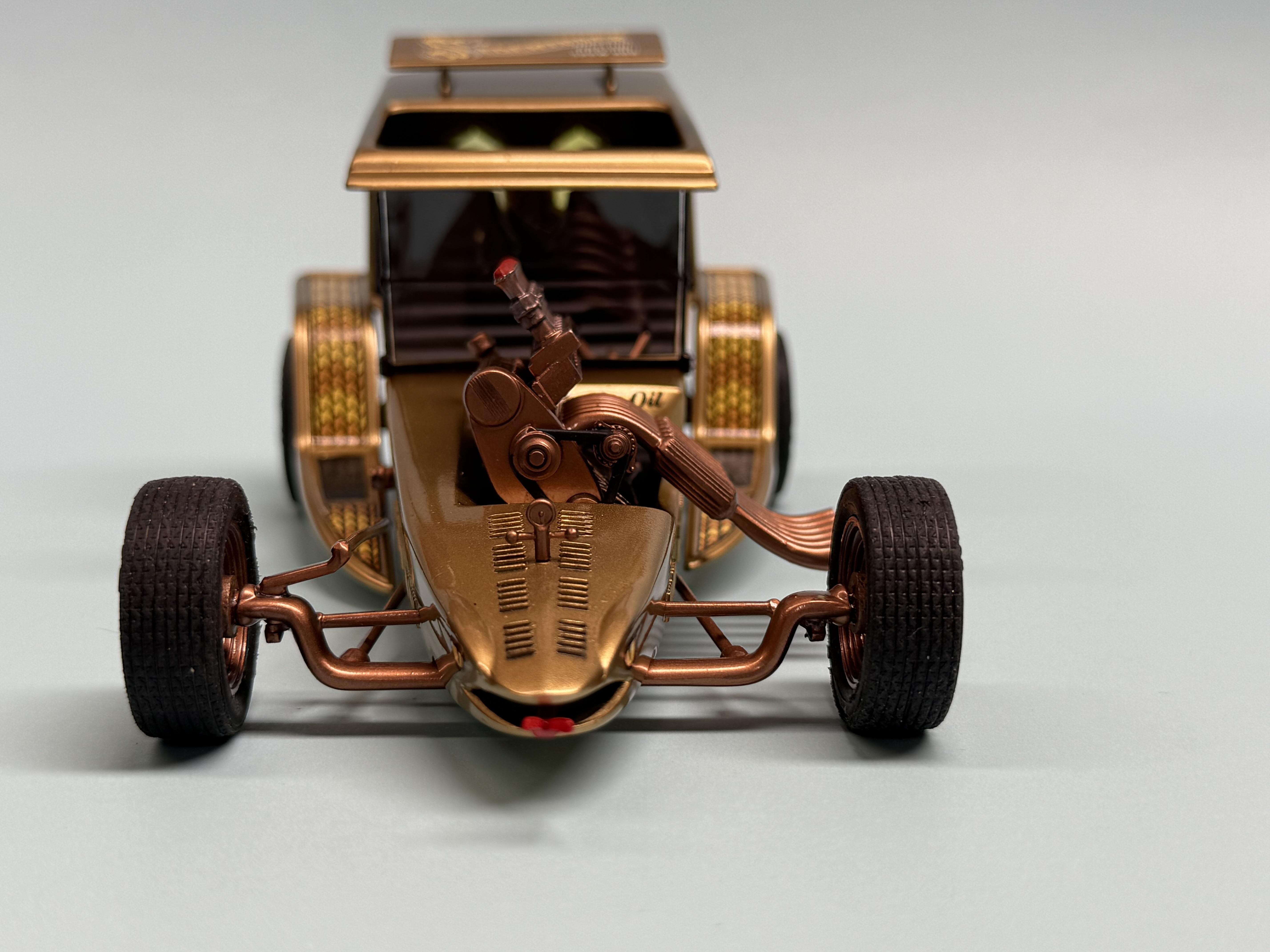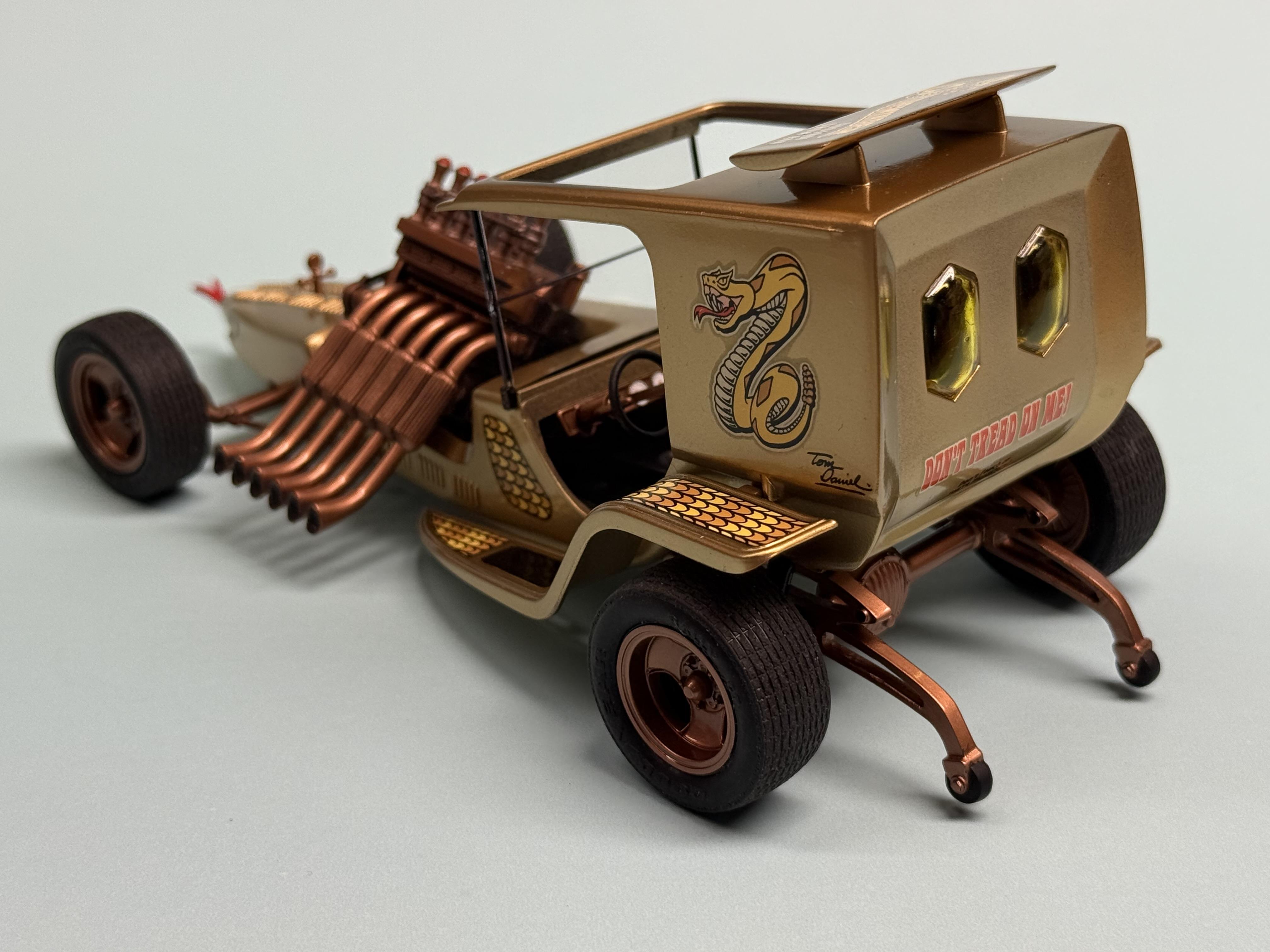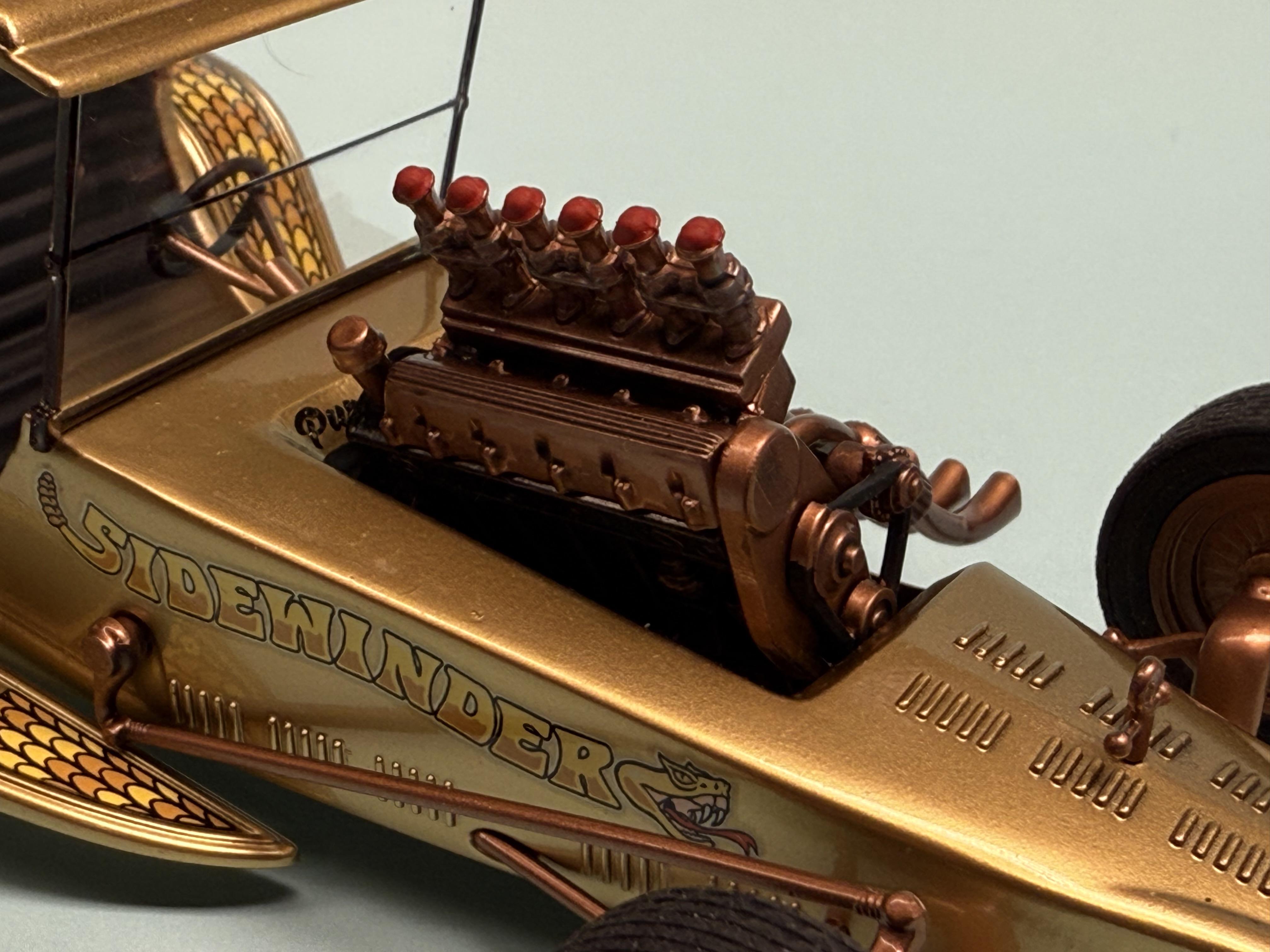 Silvercreeker Posted Tuesday at 09:01 PM Posted Tuesday at 09:01 PM The Sidewinder is done. This was built for Box Stock class and I copied the box art as close as possible. As is with Box Stock, I added nothing that did not come in the box. All body seams were molded together before paint. Color is Alclad Pale Gold. All chrome was stripped and painted Alclad Copper. A simple build to go along with the much more involved Sidewinder “Snake Bitten” built at the same time. Happy Halloween! 5