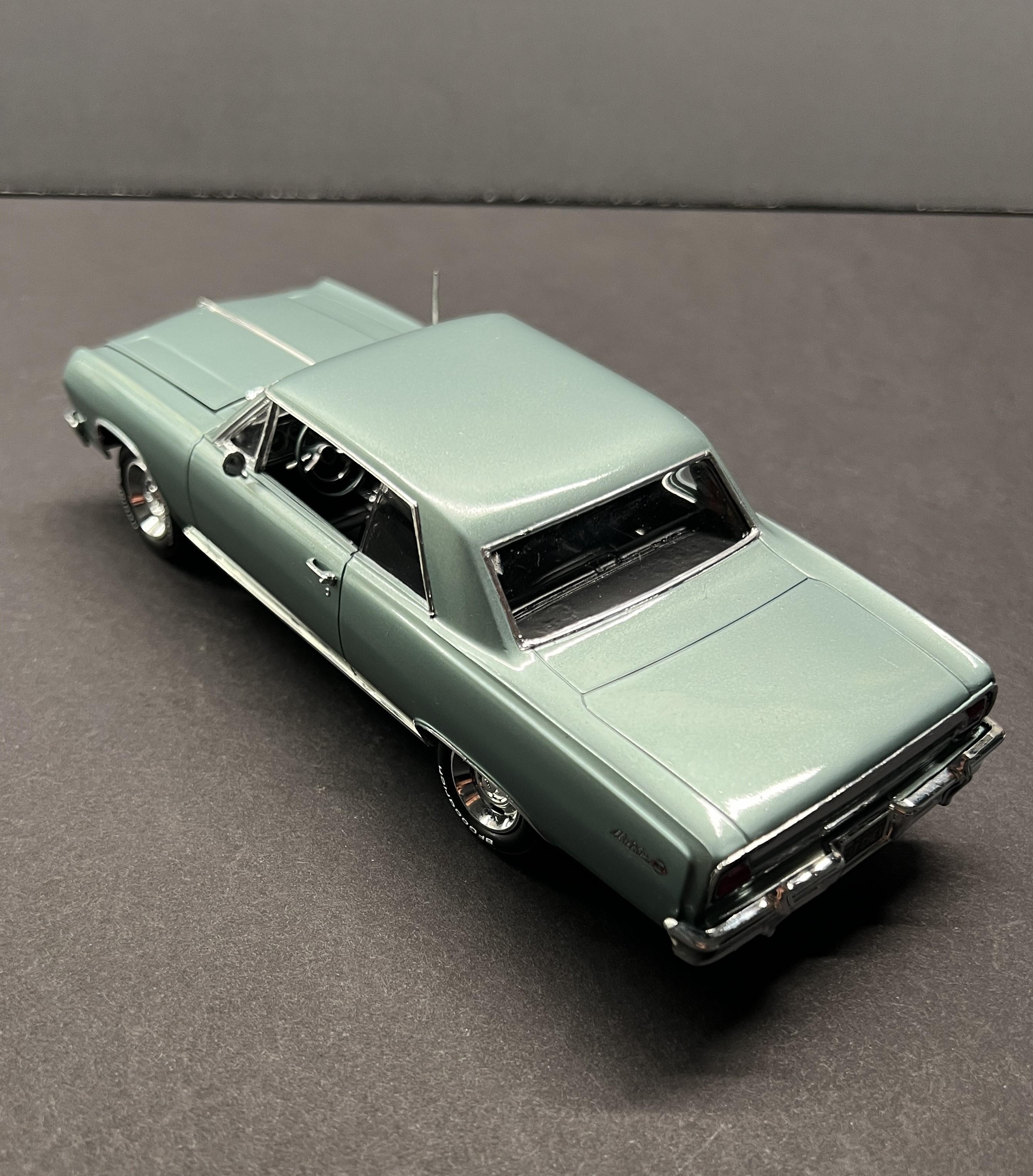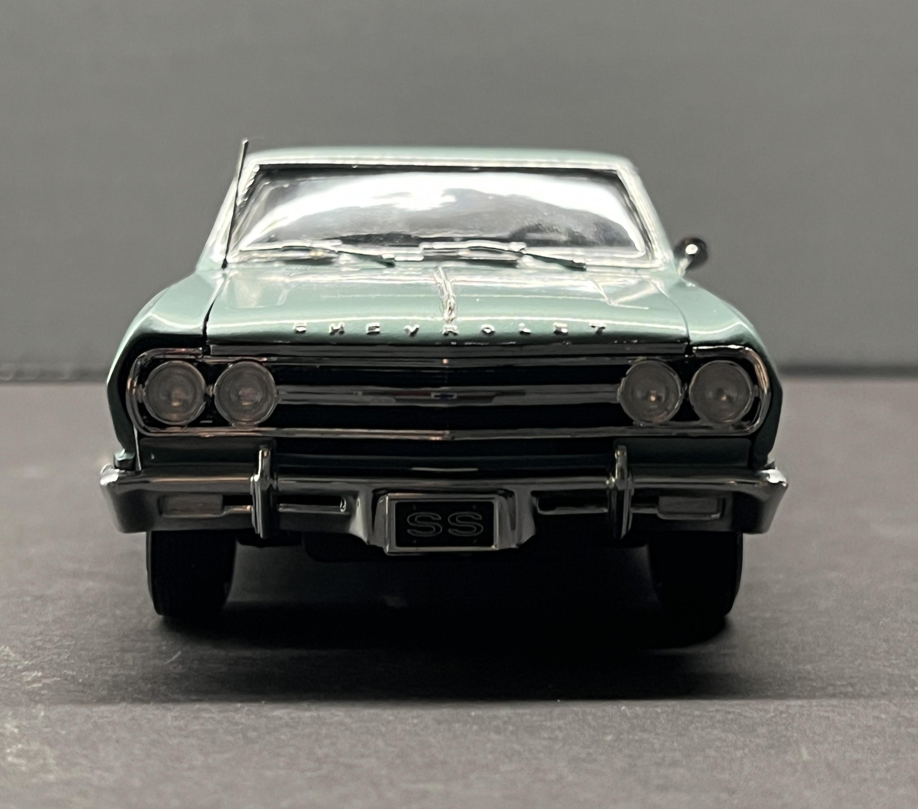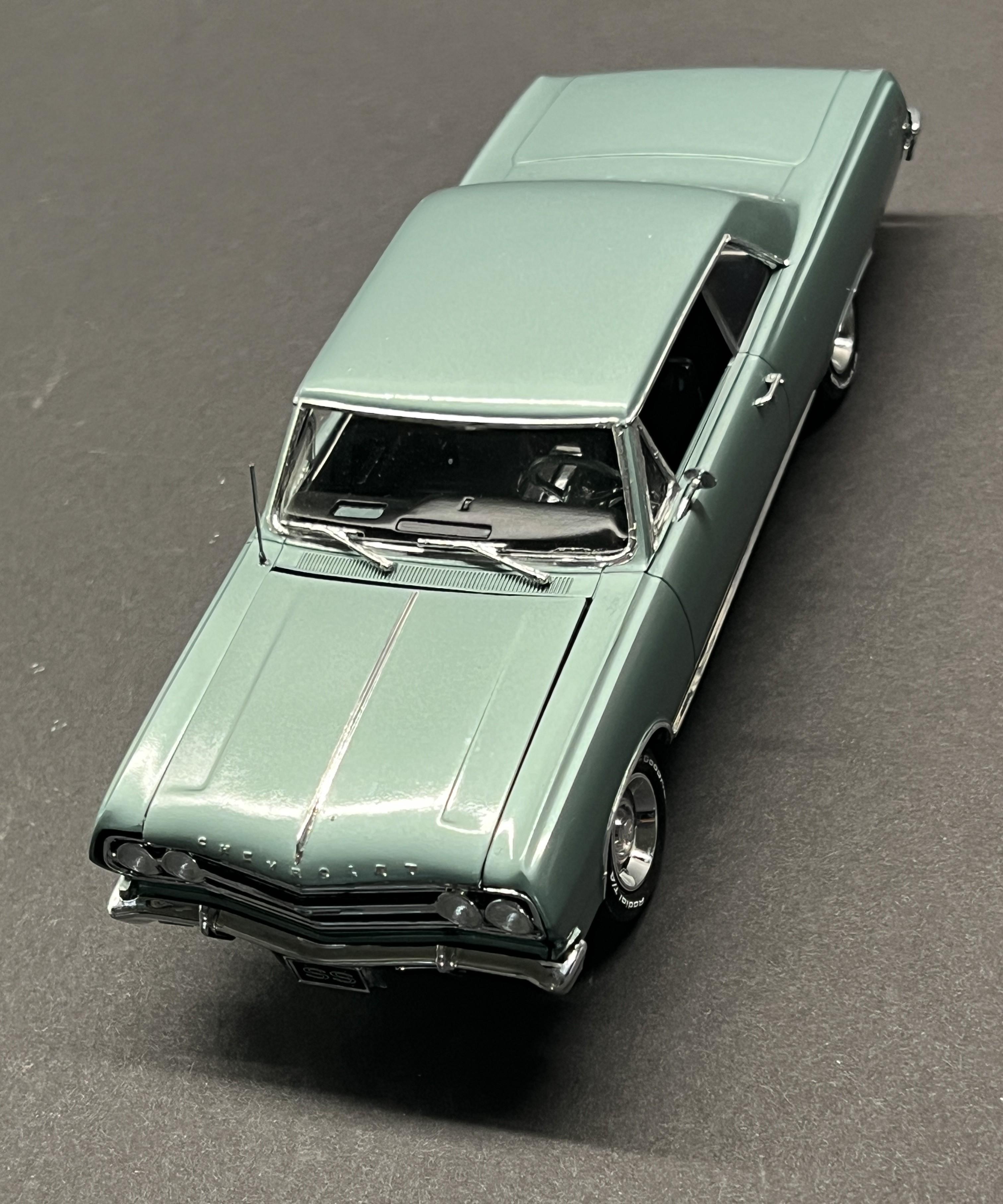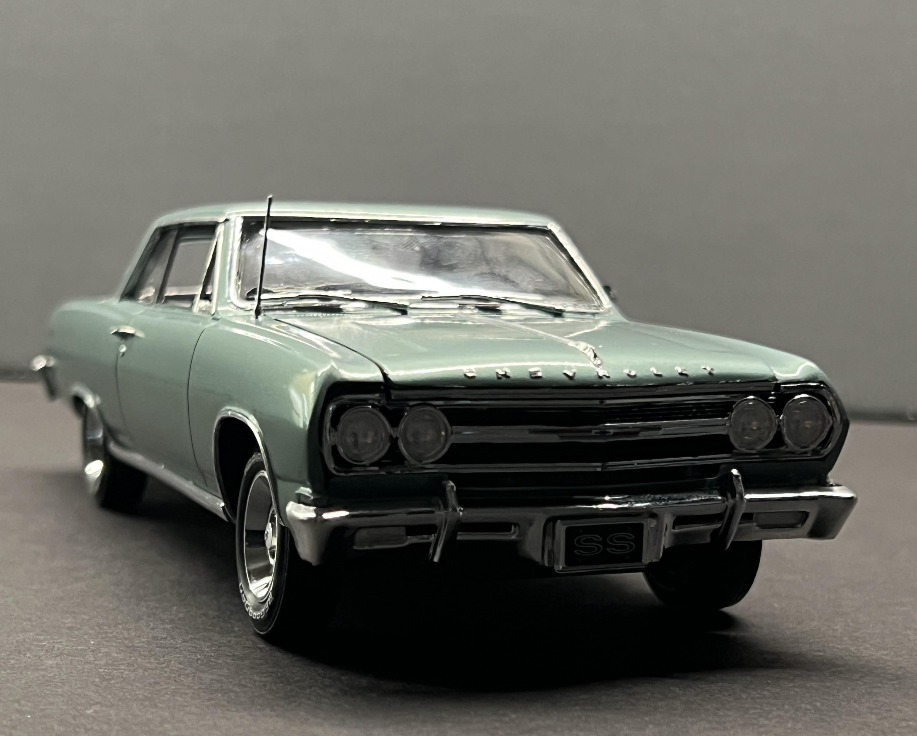 rastta Posted Tuesday at 09:45 PM Posted Tuesday at 09:45 PM This one was a bit of a challenge as I had to build an almost stock SBC version of a 65 SS using the AMT kit that came with the big block. Luckily he had left over paint so I was able to air brush that. The biggest challenge was the rear end, as it's completely different on the regular SS not the Z16. That and the fact that the small block has a spacer between the radiator and the support to move it back to the motor. I did add some stuff to the model that aren't on his car yet, such as the bumper guards, wheel opening chrome, windshield wipers and washer tank. Those are in the works. Overall I'm happy and he's stoked so that's all that matters. Made the license plate decal and had the SS one from my stash. Here's a couple pictures of his car and then the model version follows. 9