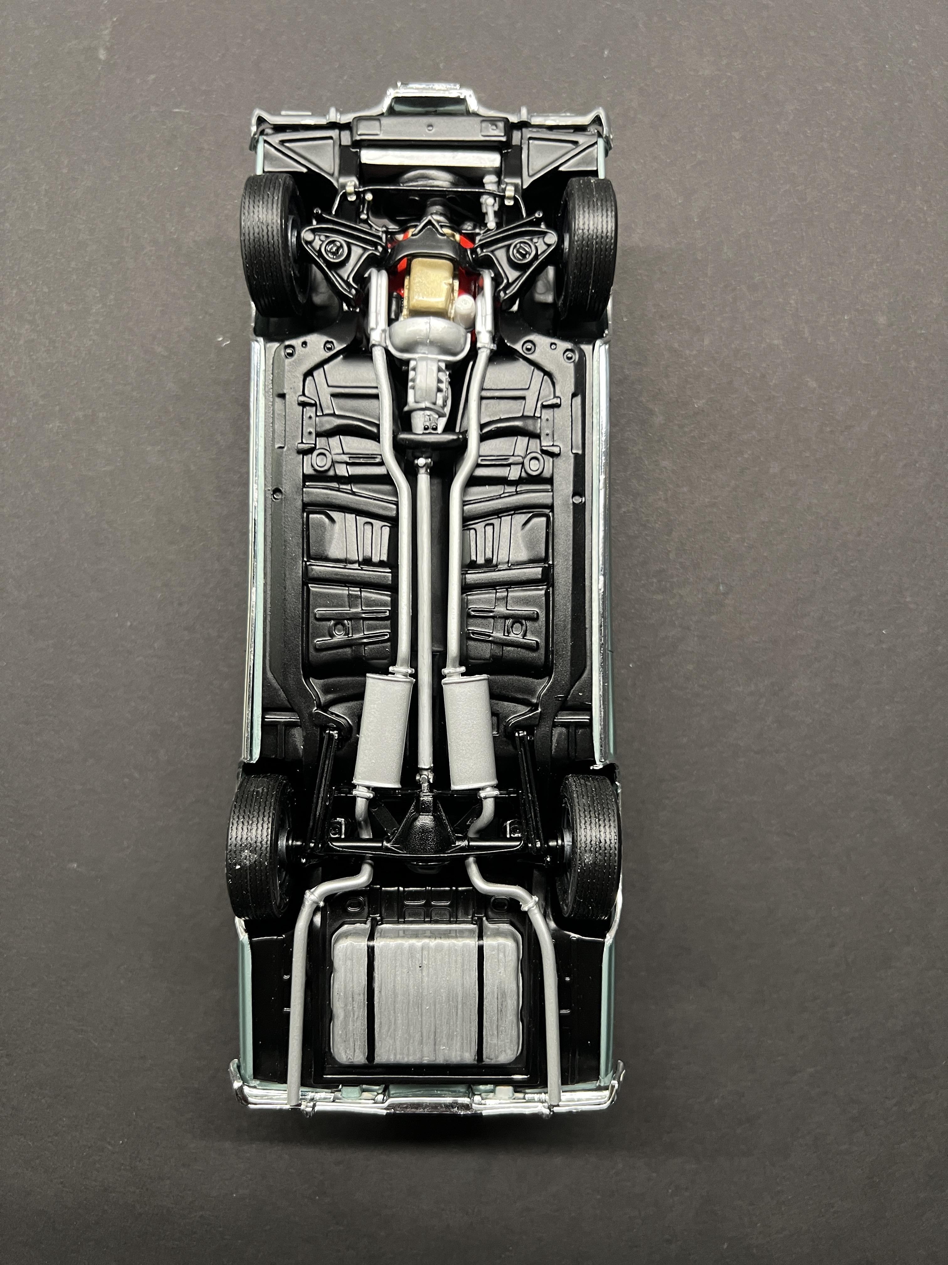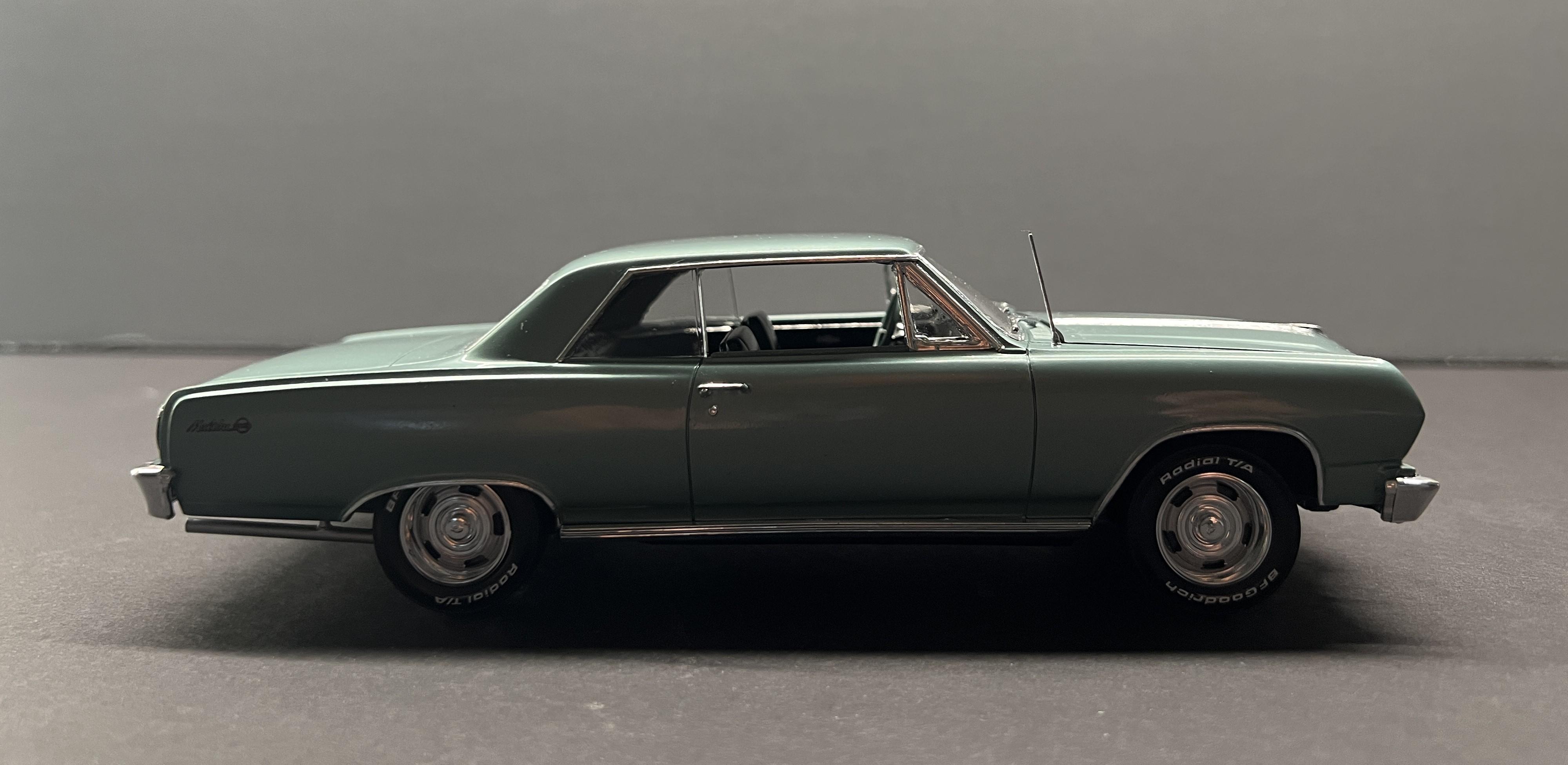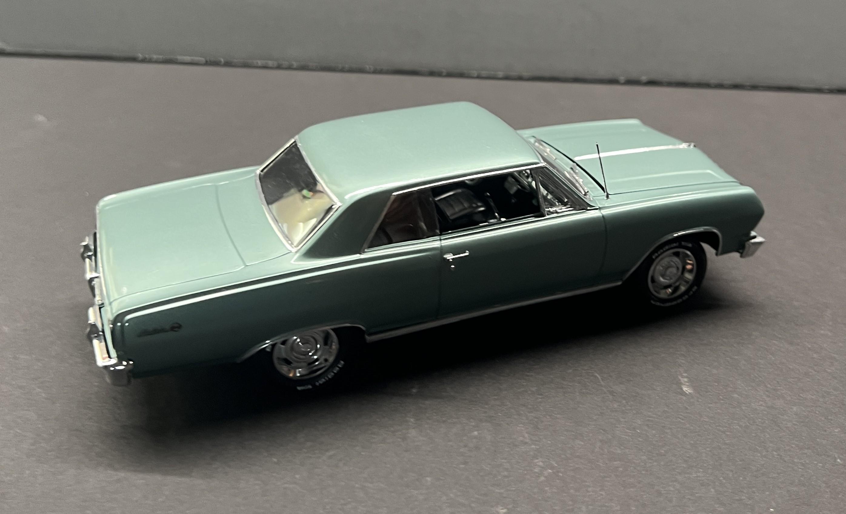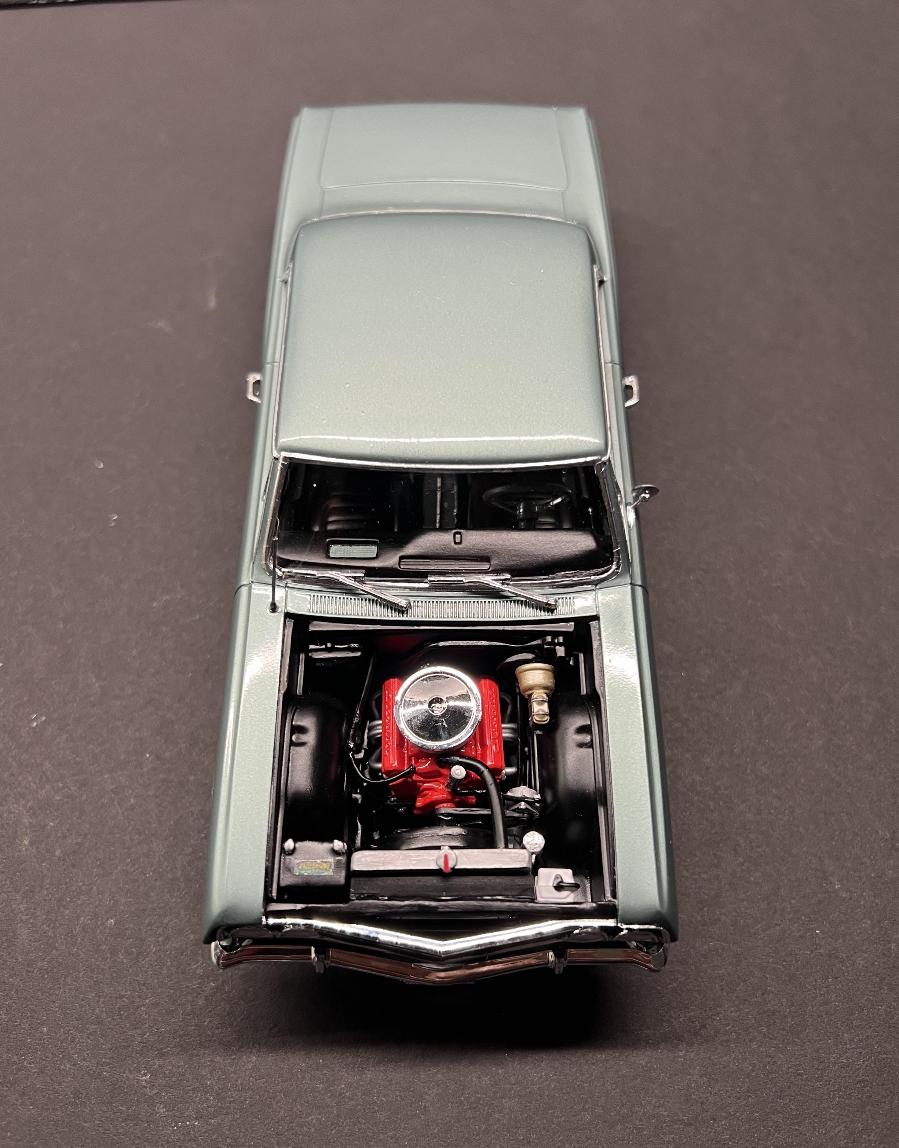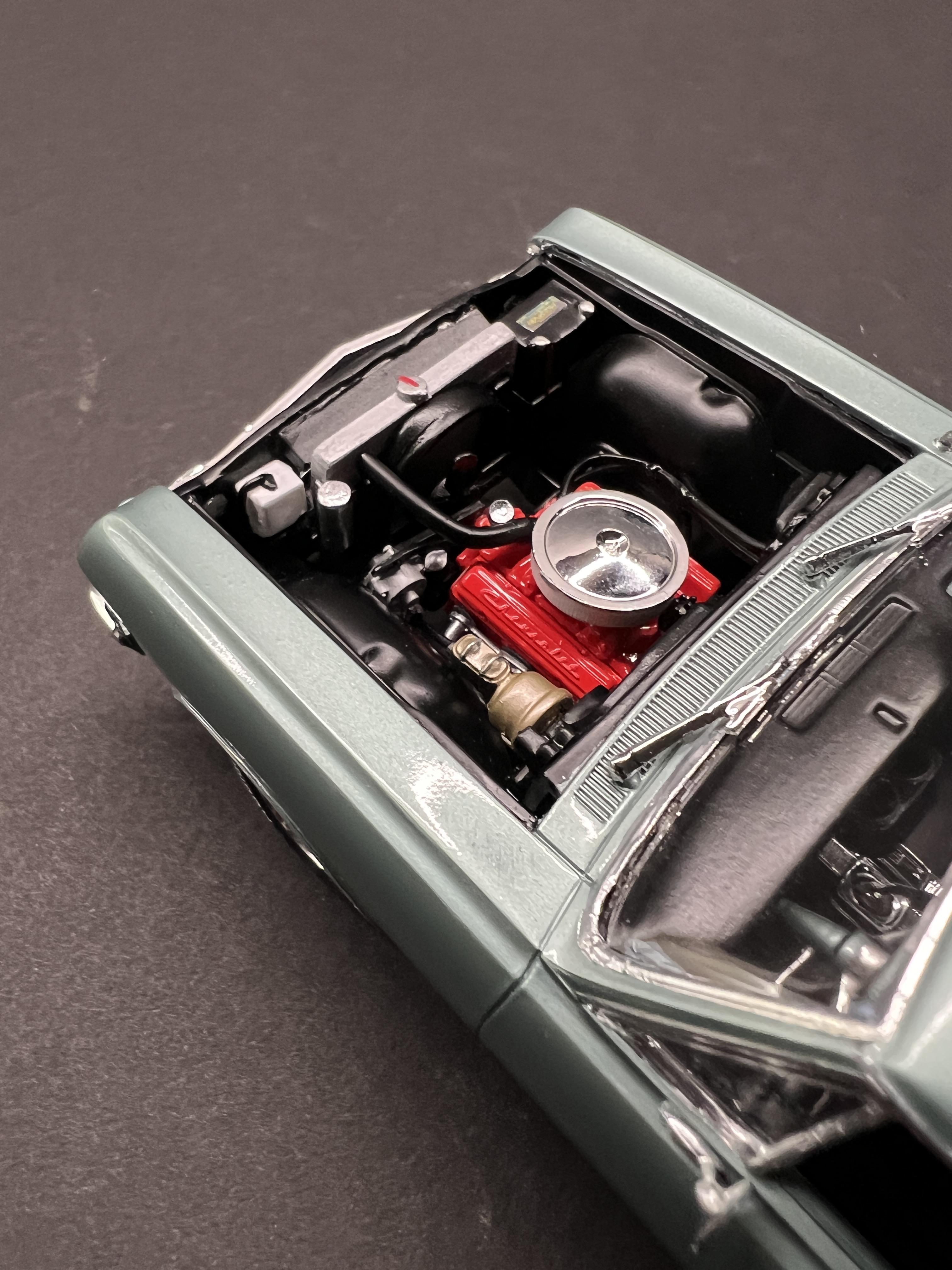 rastta Posted Tuesday at 09:45 PM Posted Tuesday at 09:45 PM This one was a bit of a challenge as I had to build an almost stock SBC version of a 65 SS using the AMT kit that came with the big block. Luckily he had left over paint so I was able to air brush that. The biggest challenge was the rear end, as it's completely different on the regular SS not the Z16. That and the fact that the small block has a spacer between the radiator and the support to move it back to the motor. I did add some stuff to the model that aren't on his car yet, such as the bumper guards, wheel opening chrome, windshield wipers and washer tank. Those are in the works. Overall I'm happy and he's stoked so that's all that matters. Made the license plate decal and had the SS one from my stash. Here's a couple pictures of his car and then the model version follows. 9