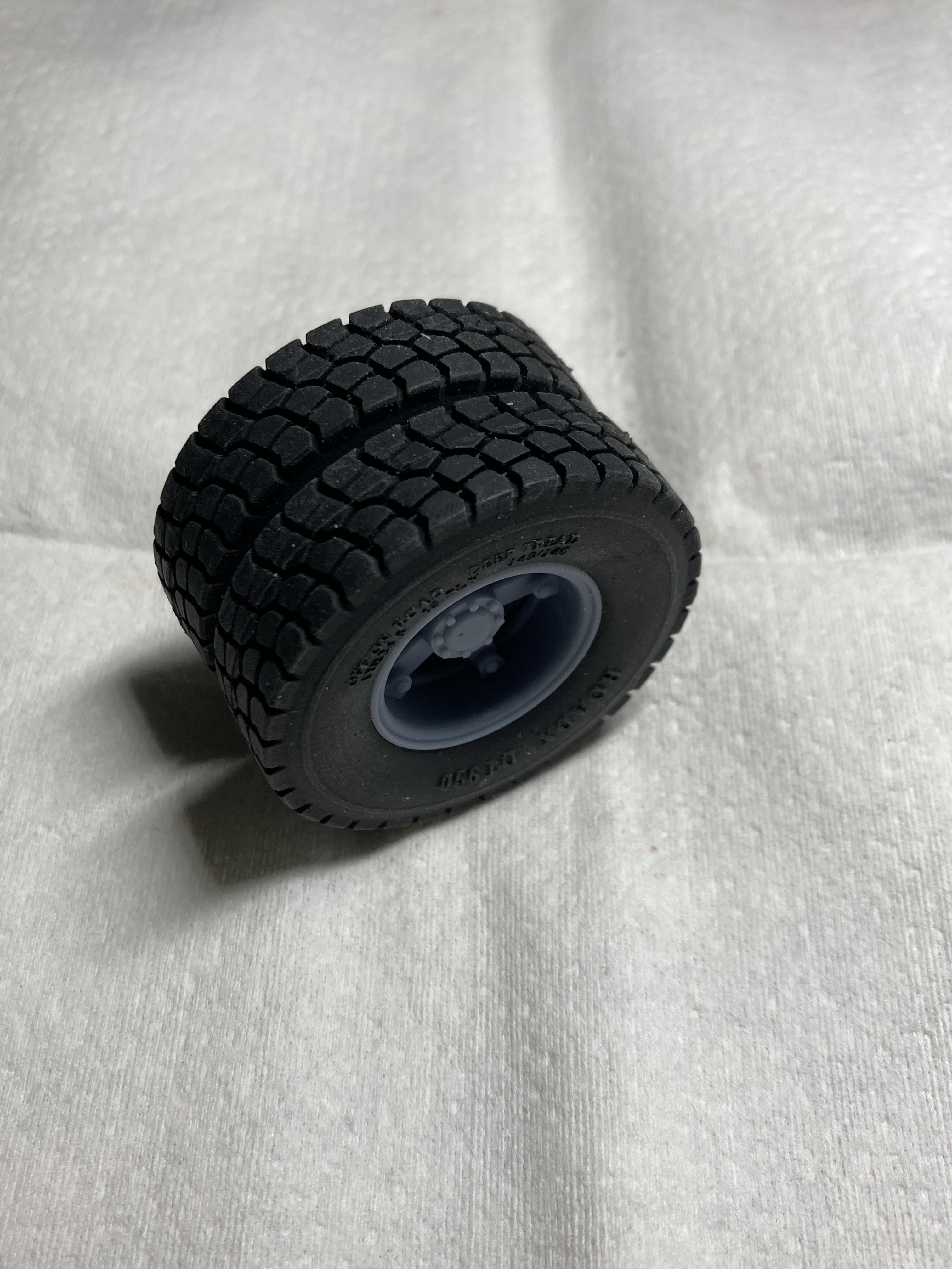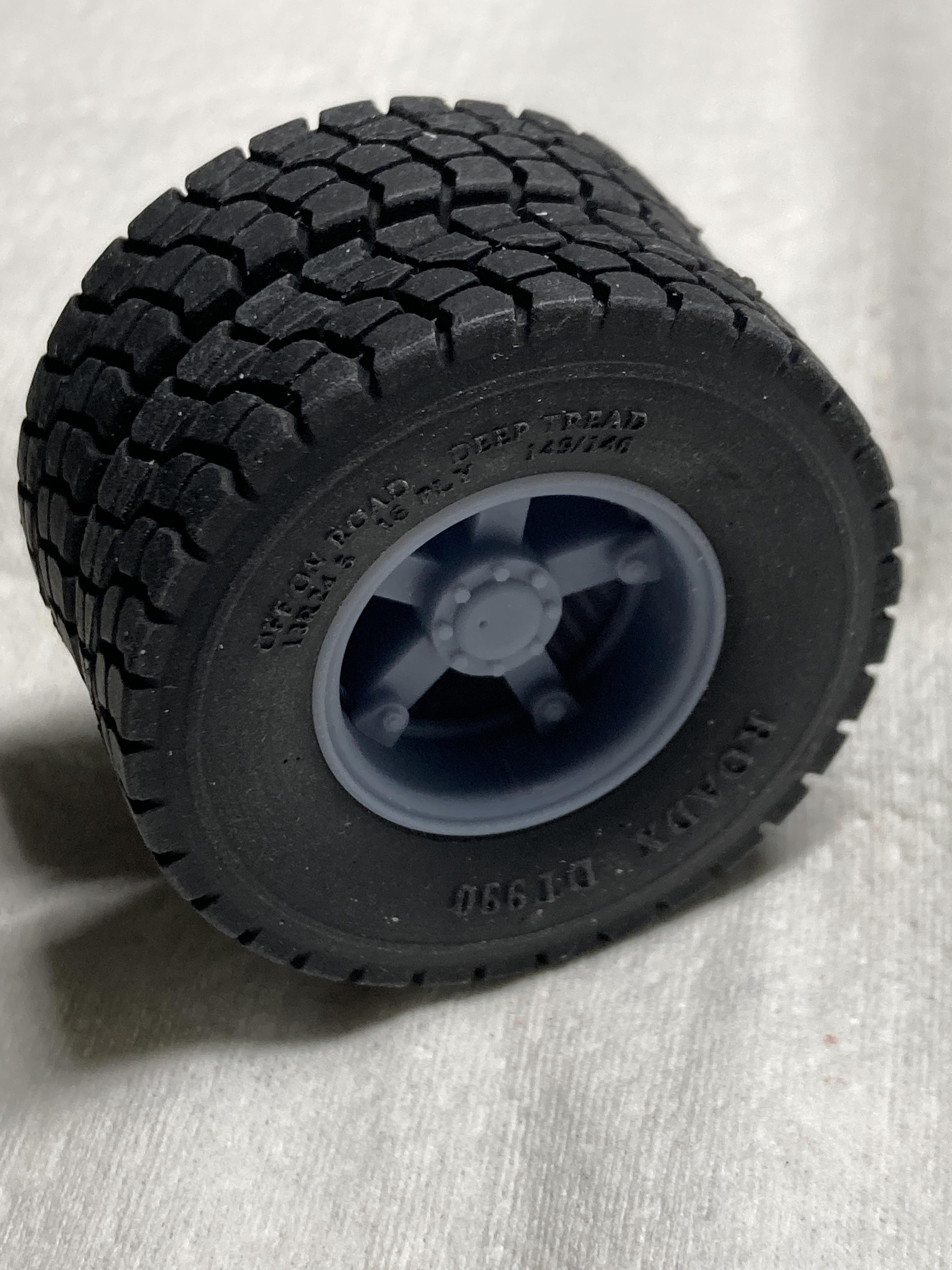 Gary Chastain Posted Wednesday at 06:41 PM Author Posted Wednesday at 06:41 PM Tires and wheels. I bought these 1:24 scale tires a long time ago but they for the wide 1:25 scale front rims perfectly. Because this is not an oilfield truck I want a road tire with thought of building a lowboy trailer with a Jeep and stinger, someday. I am sometimes curious about aftermarket scales and their compatibility but it works good. The rear rims are Auslowe 1:24 scale with some larger/taller 1:25 scale tires. For you purists, I just crossed the line 🤭😆. any help appreciated guys, jump in. This build is a little outa by box of skills. 4