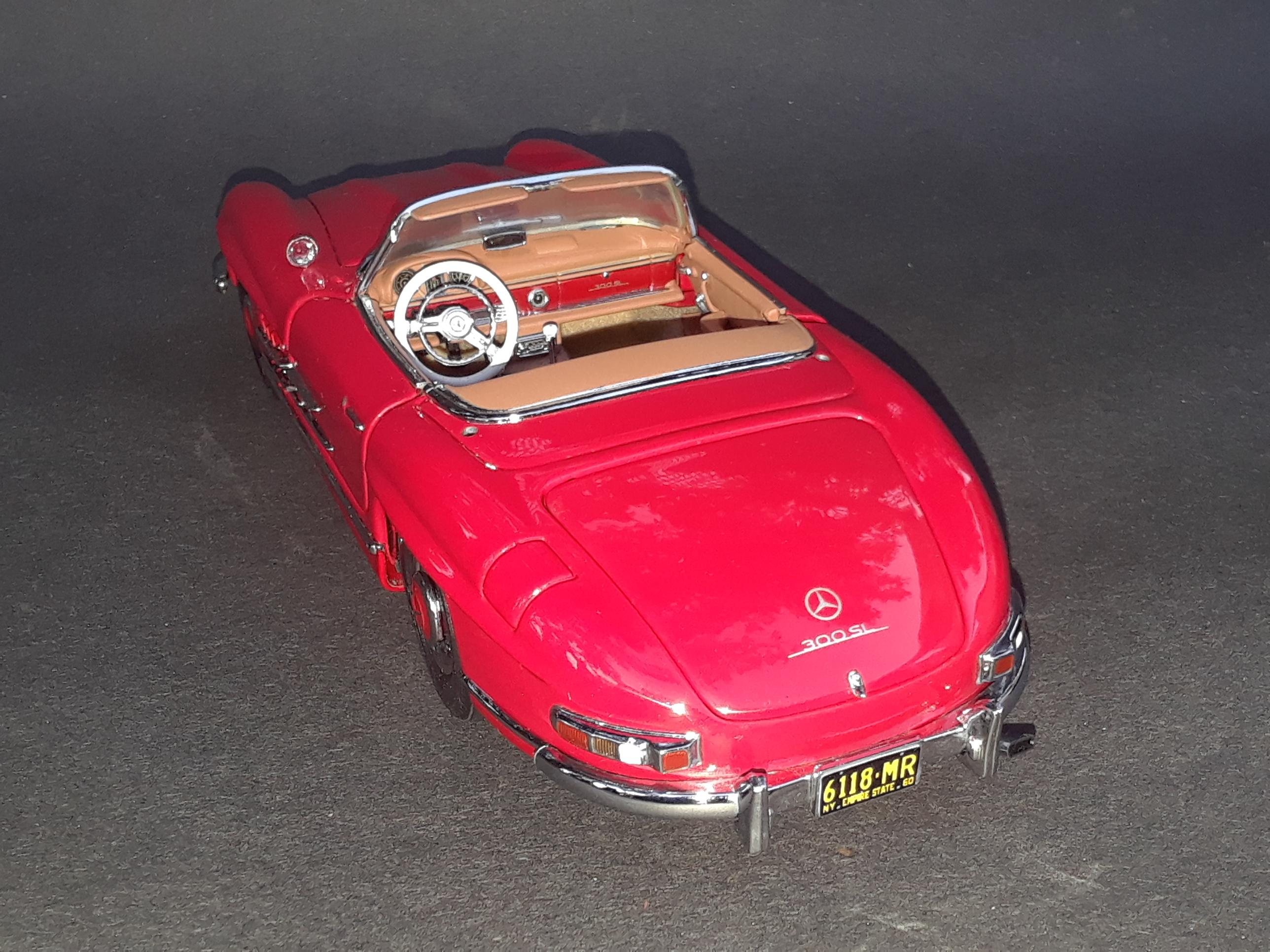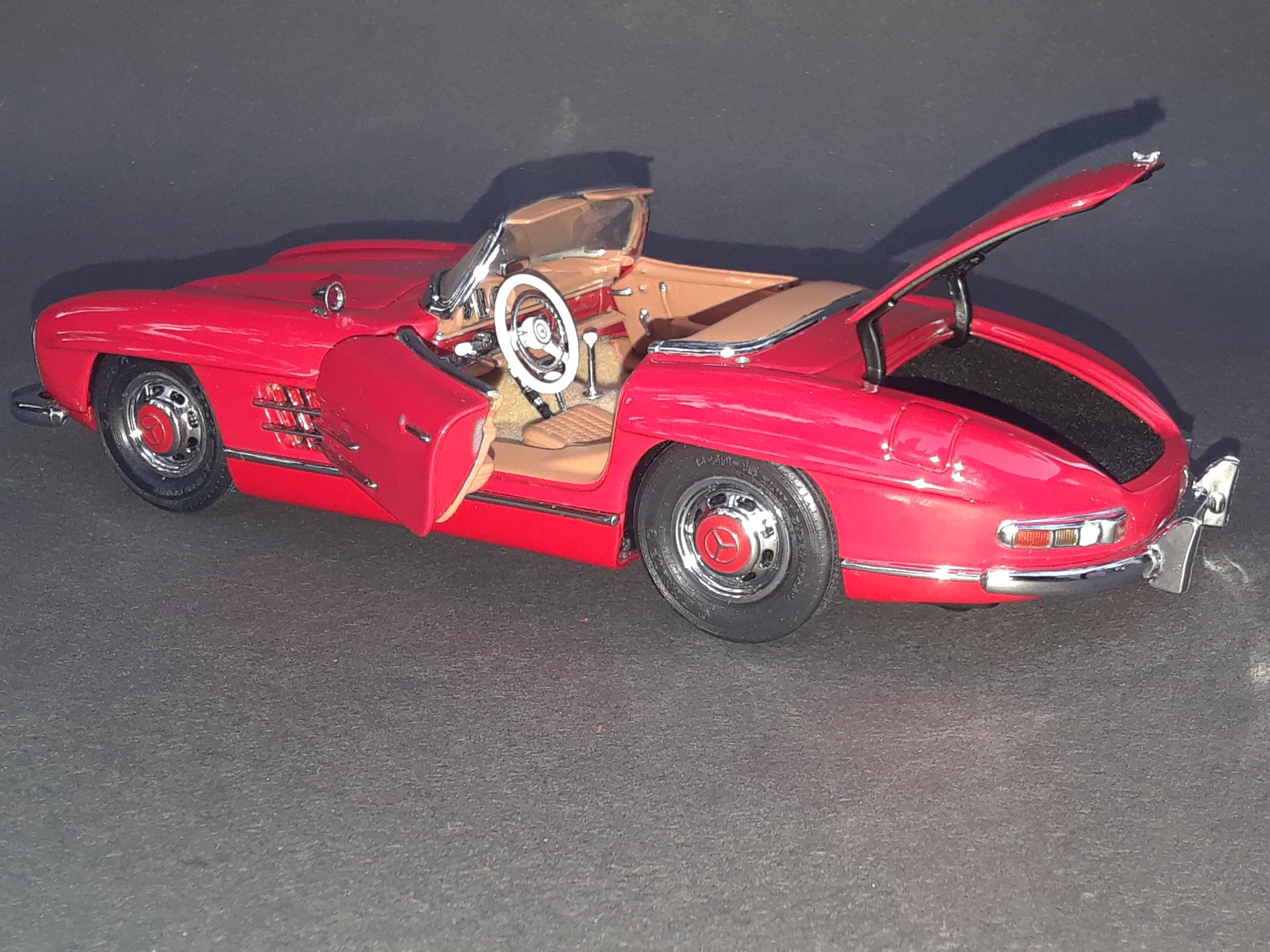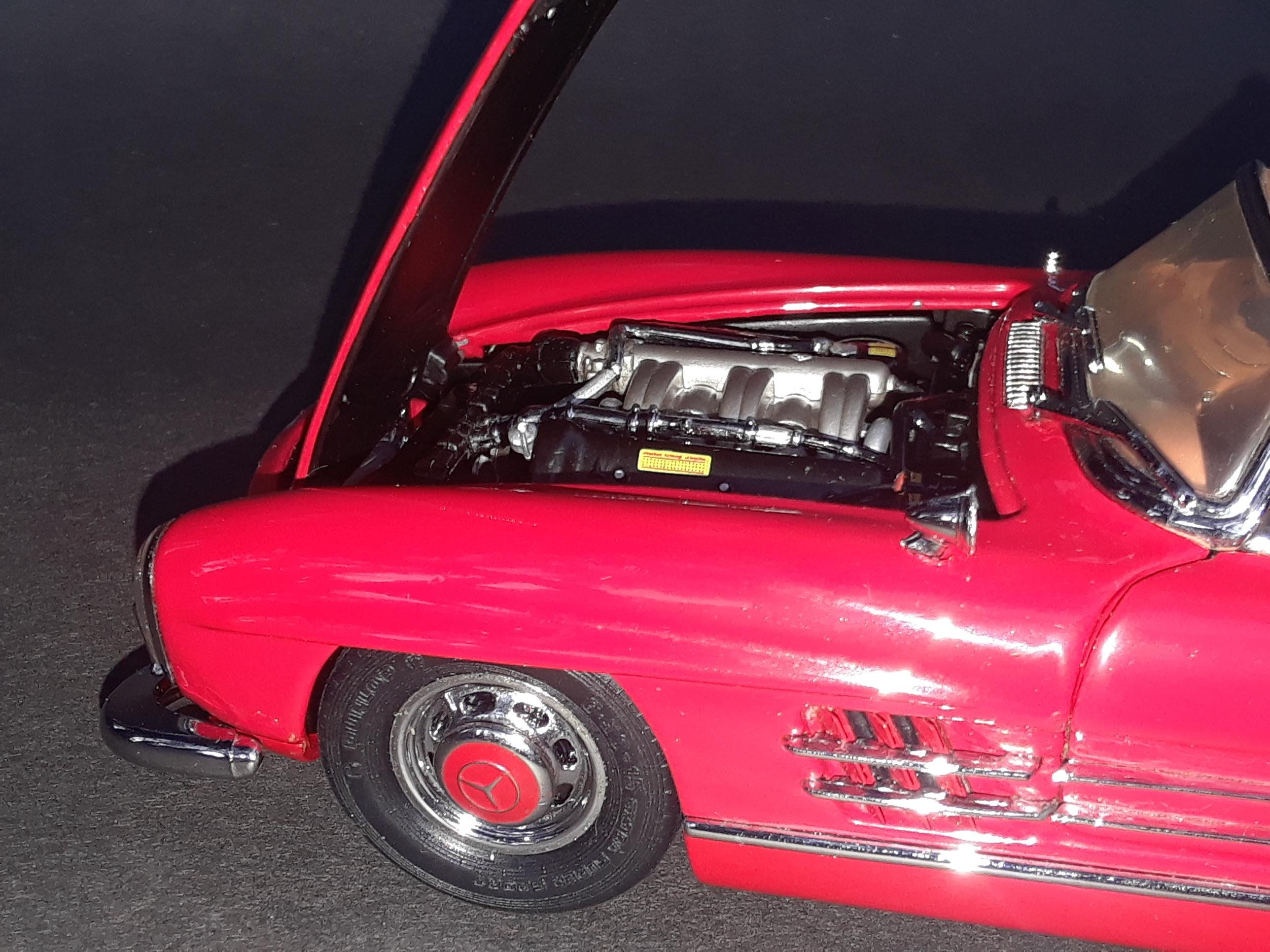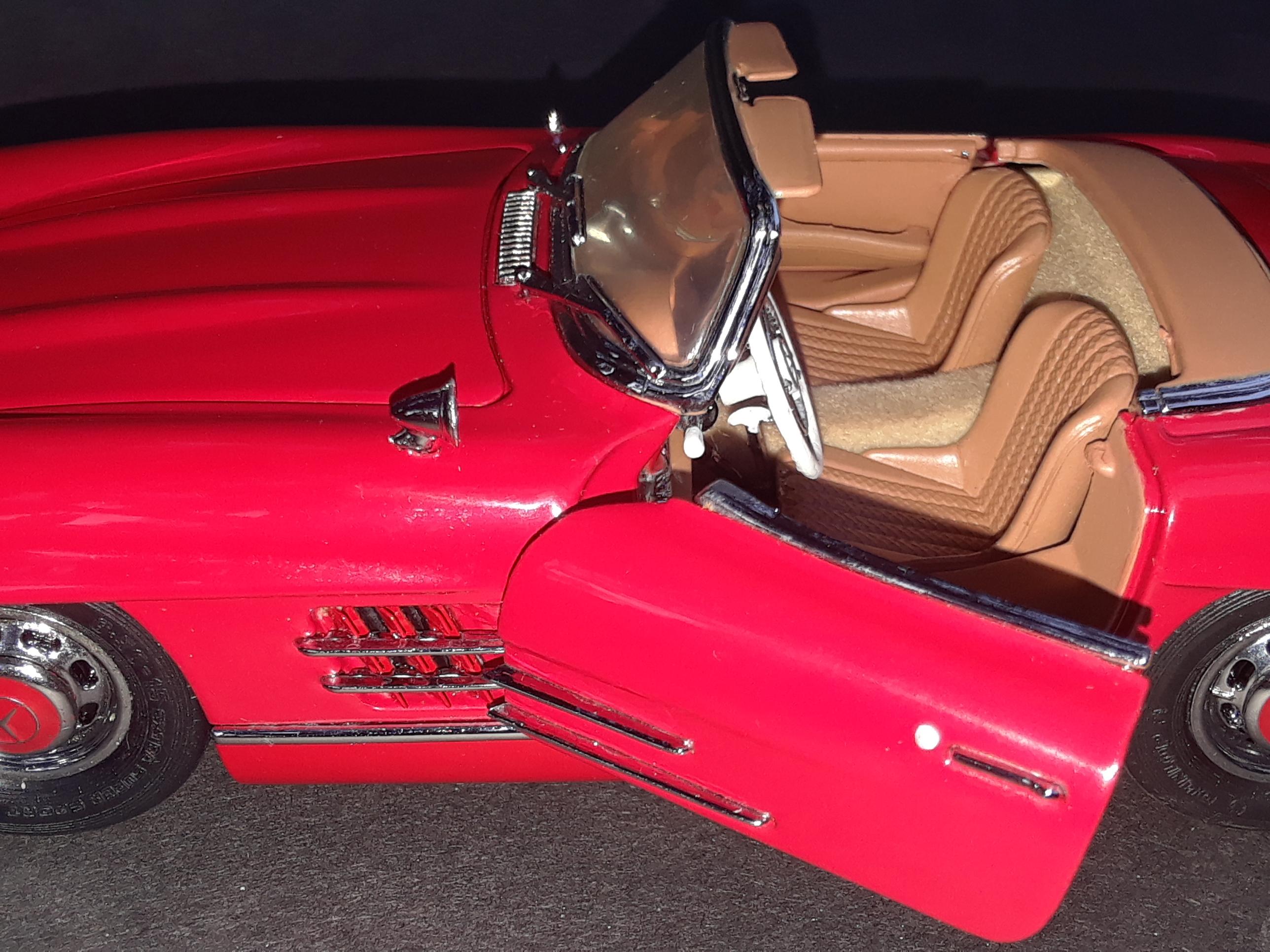 Hoffman Posted yesterday at 01:12 AM Author Posted yesterday at 01:12 AM These are nice diecasts. Franklin Mint offered both the Gullwing coupe and the roadster. Differences between the two are 1) wheels and tires, 2) full belly pan on the coupe, 3) of course the headlights are different on the roadster, just like the full size cars. The FM coupes have chrome wheels. The roadsters are painted centers, chrome outer rims. The tires on the coupes are taller, solid hard plastic. The roadsters come with shorter, rubber tires. I like the coupe wheels and tires better, so I bought a set and adapted them to the roadster. I lowered the front suspension while I was at it and added a license plate to the back. Otherwise, as offered by the factory. -TIM-