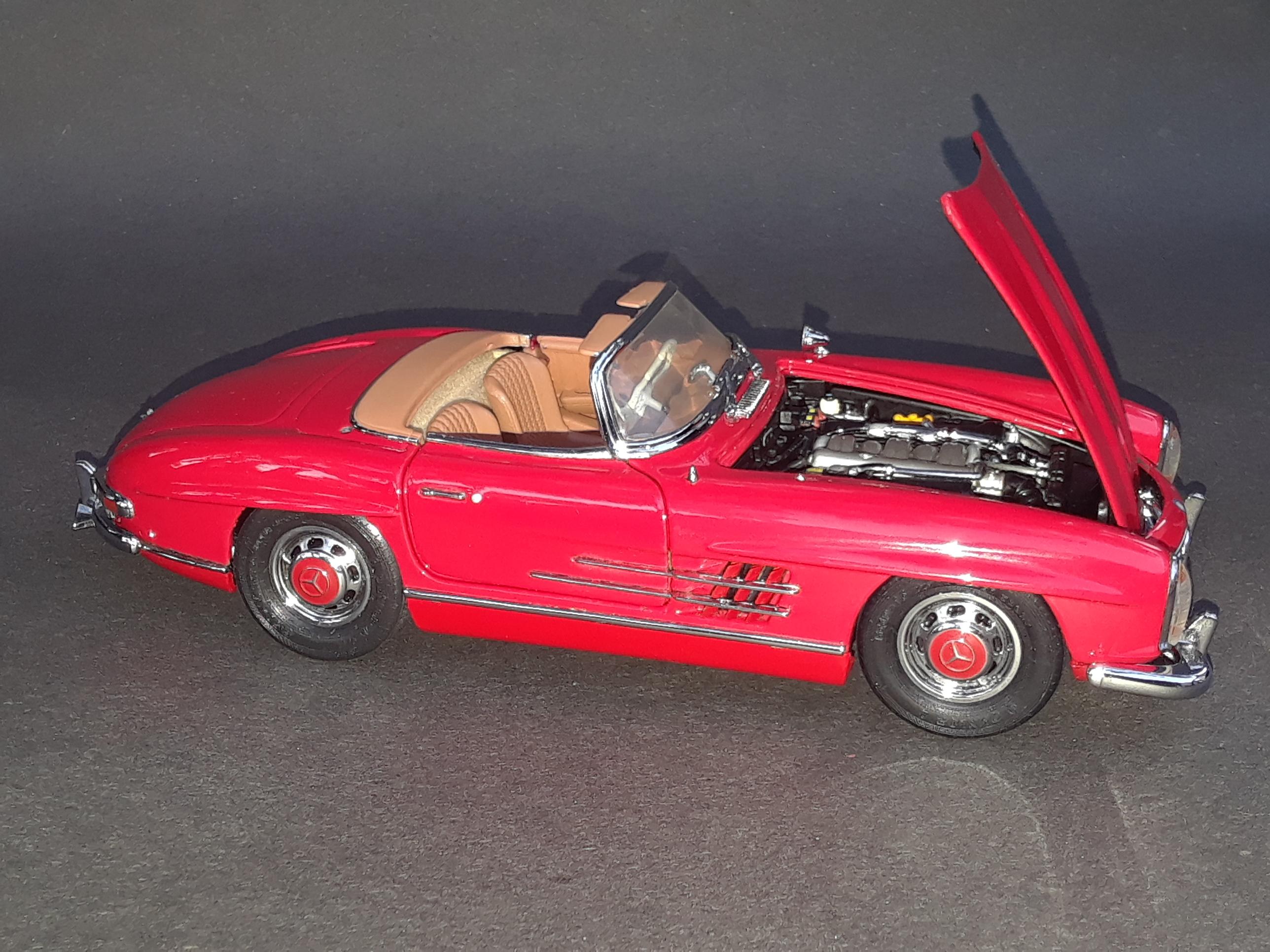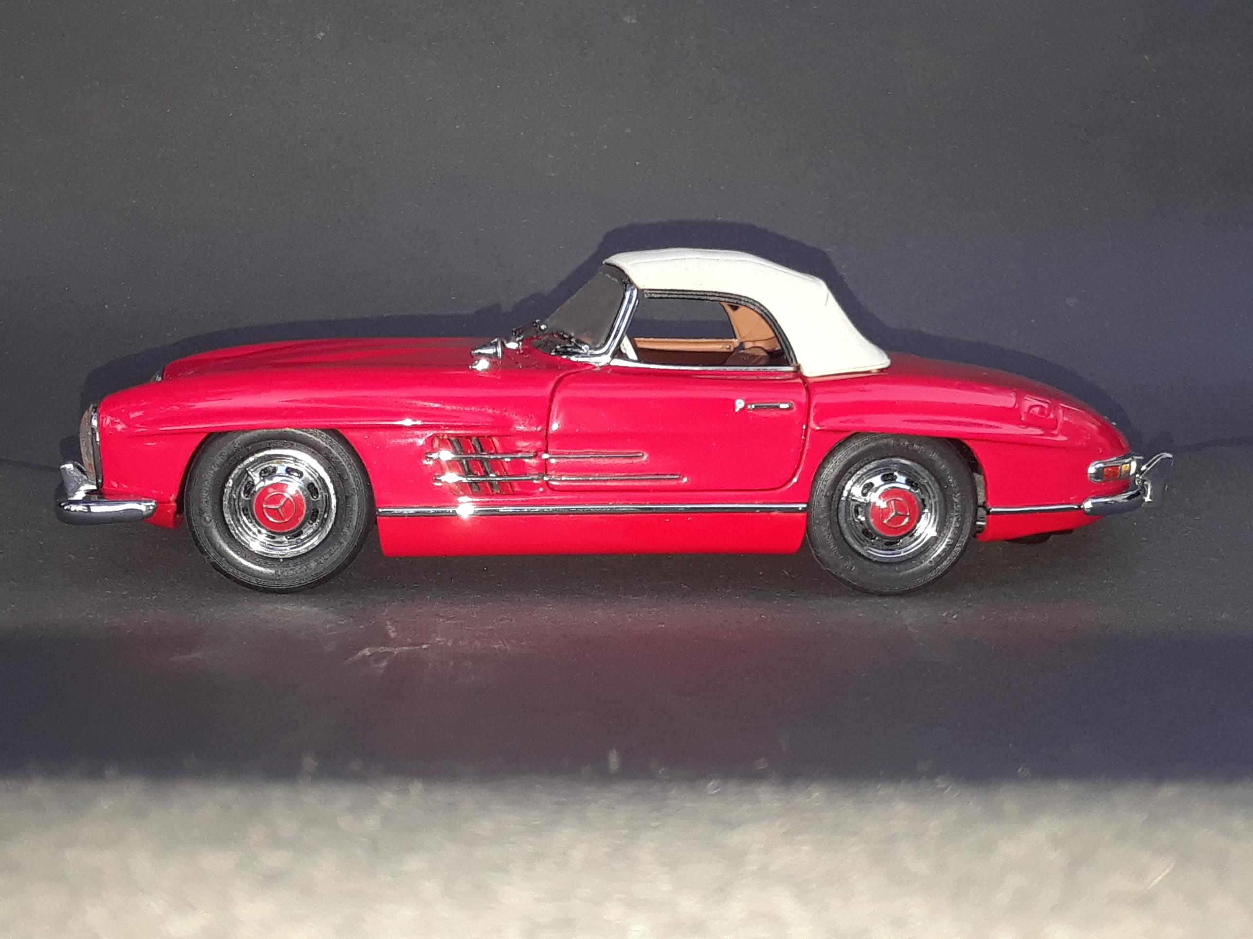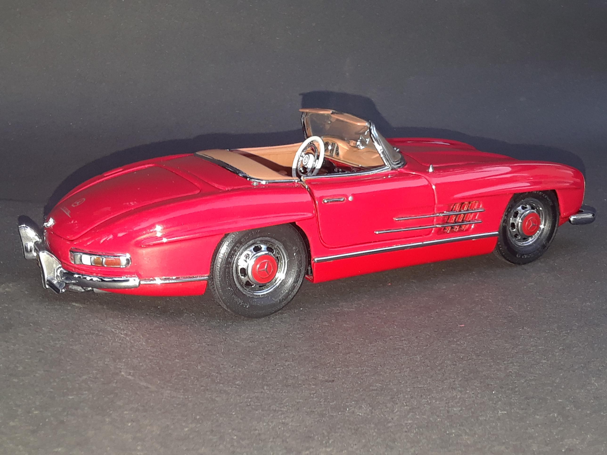 Hoffman Posted yesterday at 01:12 AM Author Posted yesterday at 01:12 AM These are nice diecasts. Franklin Mint offered both the Gullwing coupe and the roadster. Differences between the two are 1) wheels and tires, 2) full belly pan on the coupe, 3) of course the headlights are different on the roadster, just like the full size cars. The FM coupes have chrome wheels. The roadsters are painted centers, chrome outer rims. The tires on the coupes are taller, solid hard plastic. The roadsters come with shorter, rubber tires. I like the coupe wheels and tires better, so I bought a set and adapted them to the roadster. I lowered the front suspension while I was at it and added a license plate to the back. Otherwise, as offered by the factory. -TIM-