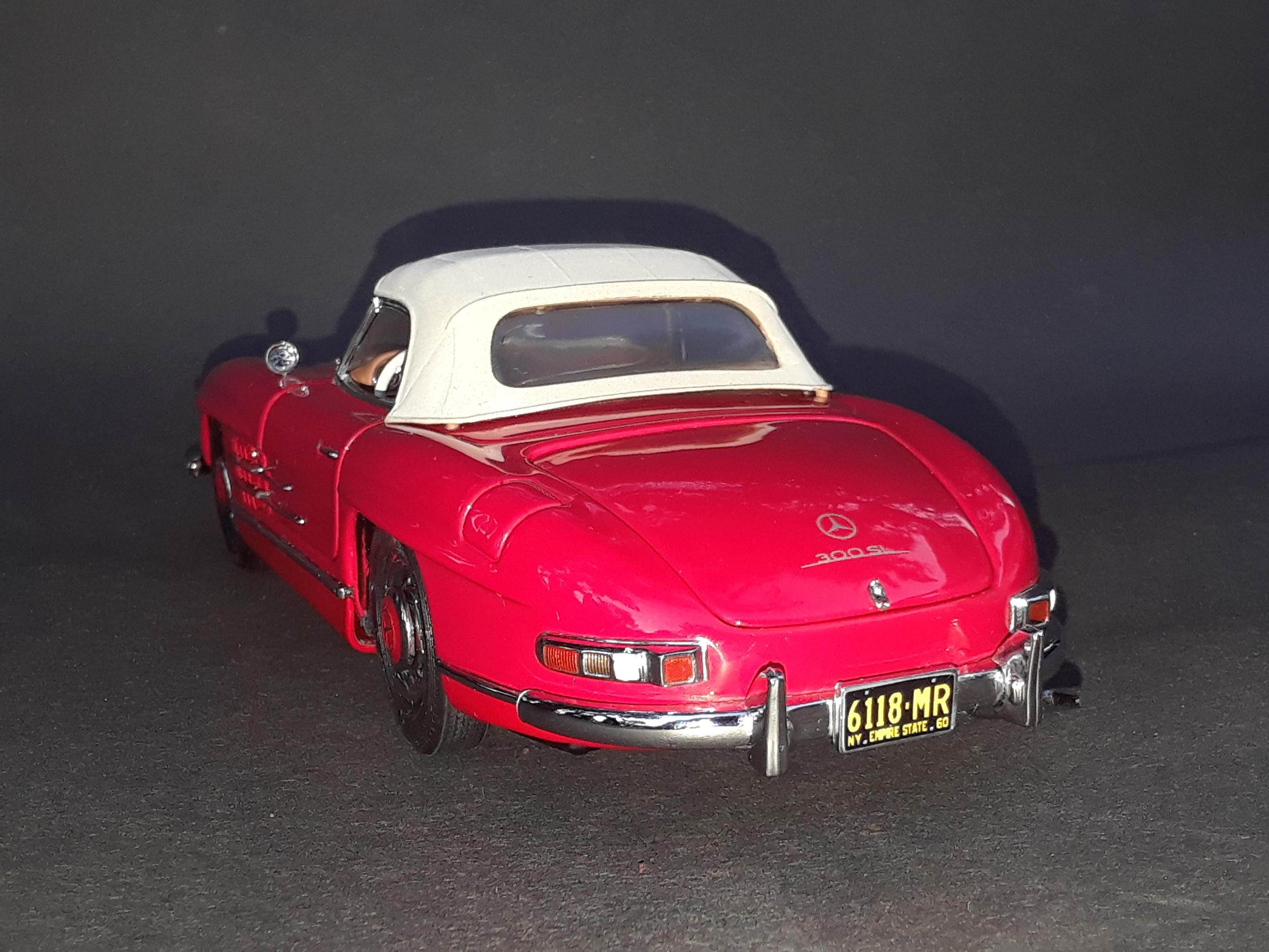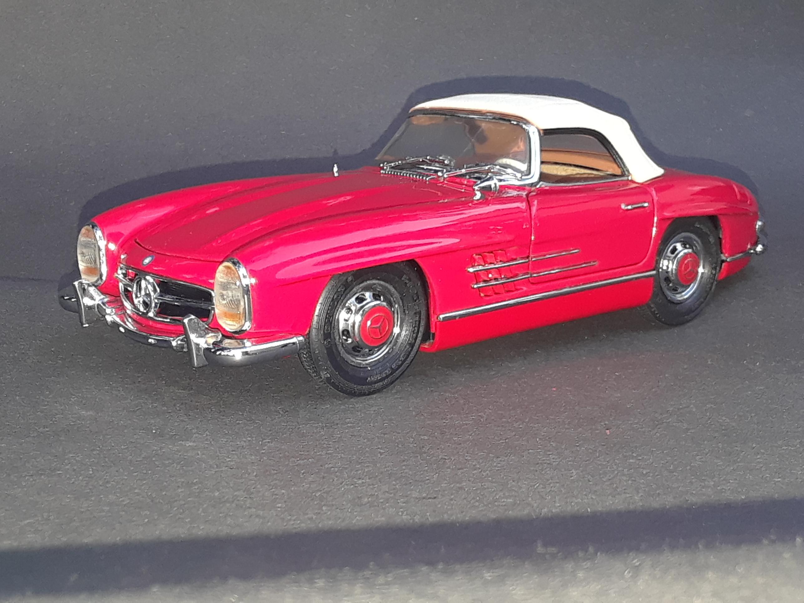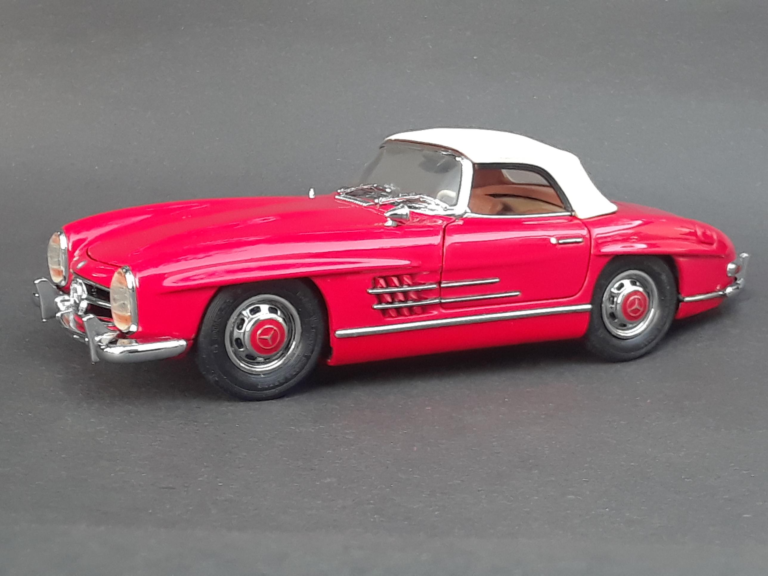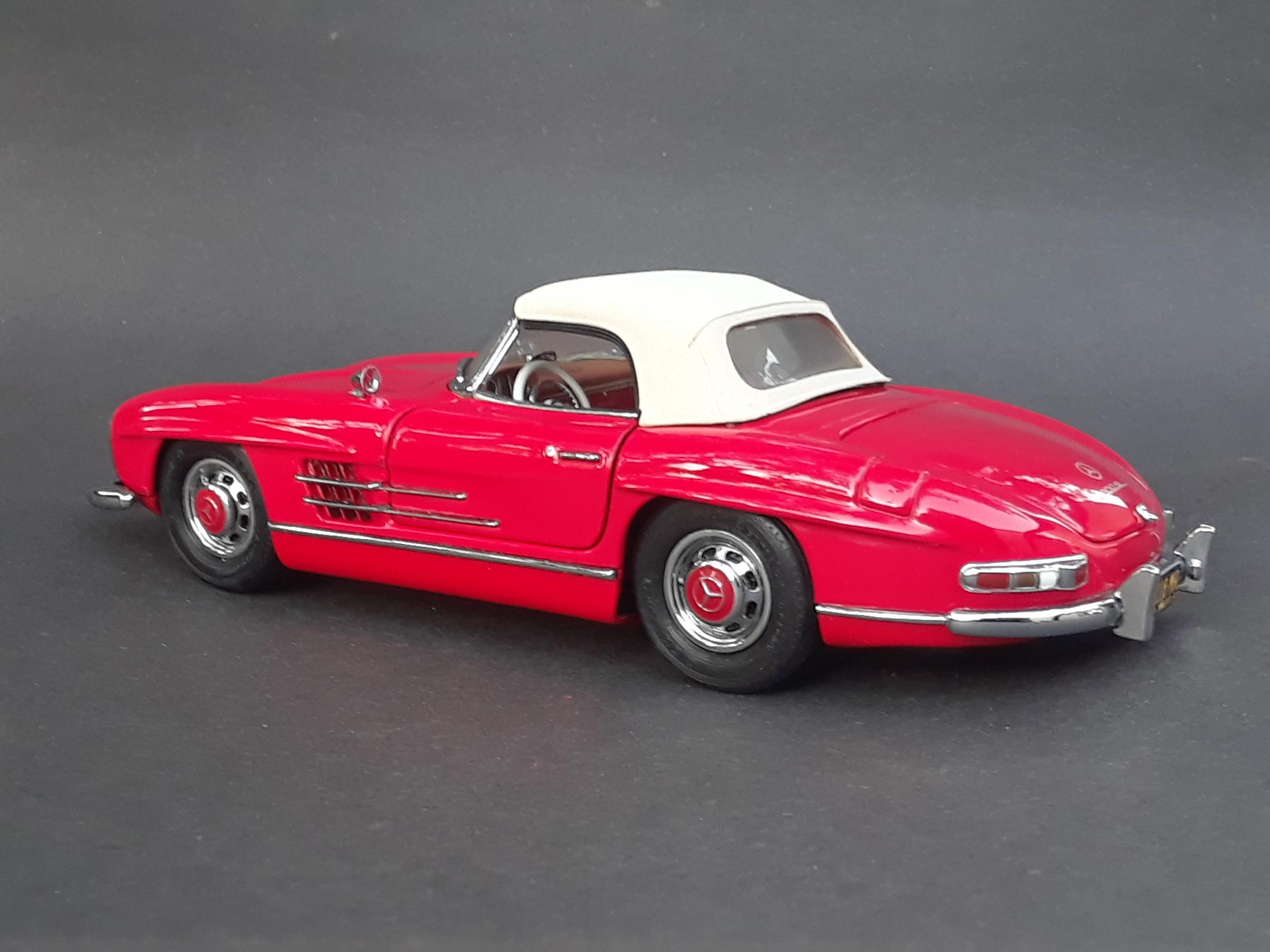 Hoffman Posted yesterday at 01:12 AM Author Posted yesterday at 01:12 AM These are nice diecasts. Franklin Mint offered both the Gullwing coupe and the roadster. Differences between the two are 1) wheels and tires, 2) full belly pan on the coupe, 3) of course the headlights are different on the roadster, just like the full size cars. The FM coupes have chrome wheels. The roadsters are painted centers, chrome outer rims. The tires on the coupes are taller, solid hard plastic. The roadsters come with shorter, rubber tires. I like the coupe wheels and tires better, so I bought a set and adapted them to the roadster. I lowered the front suspension while I was at it and added a license plate to the back. Otherwise, as offered by the factory. -TIM-