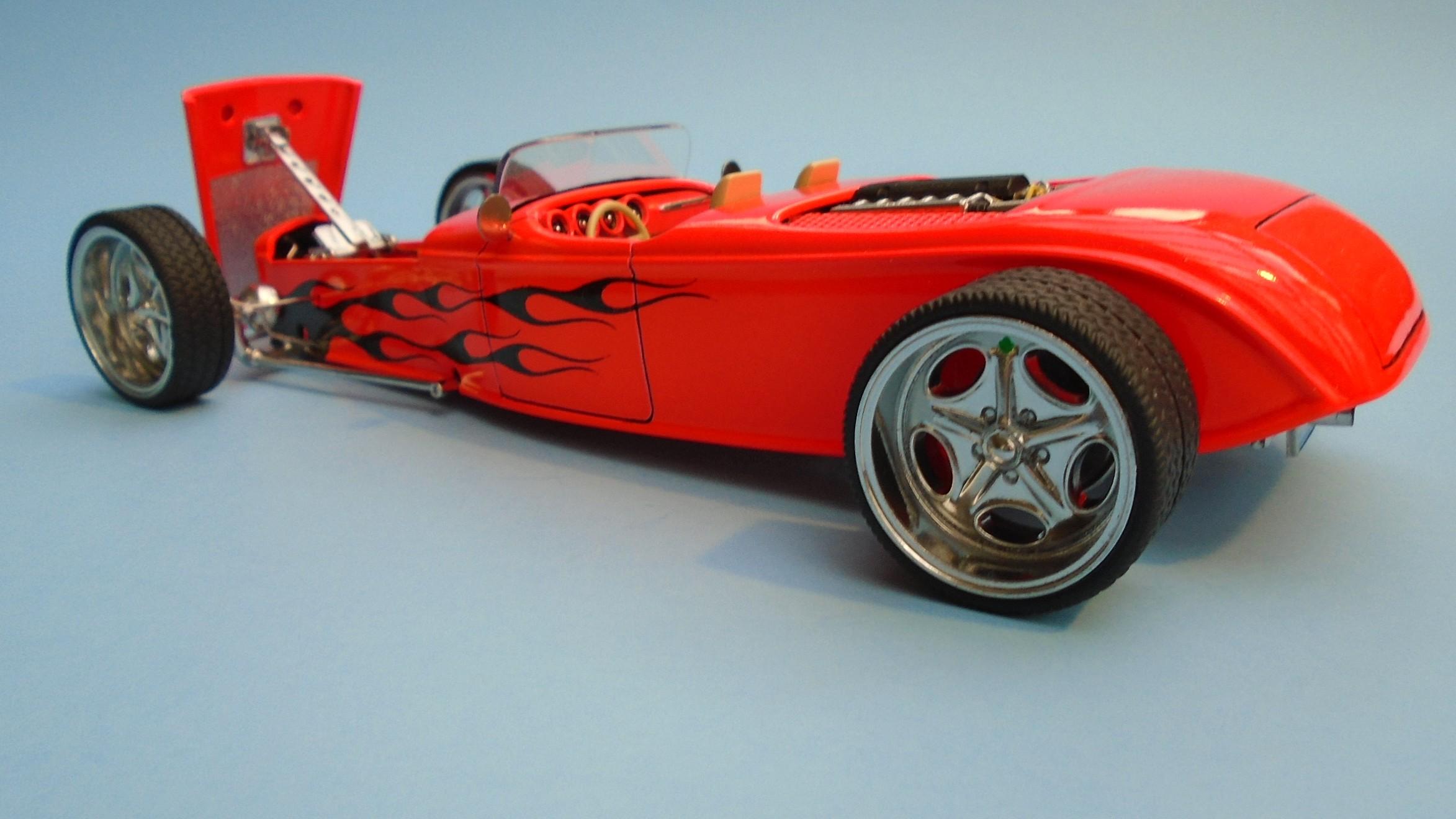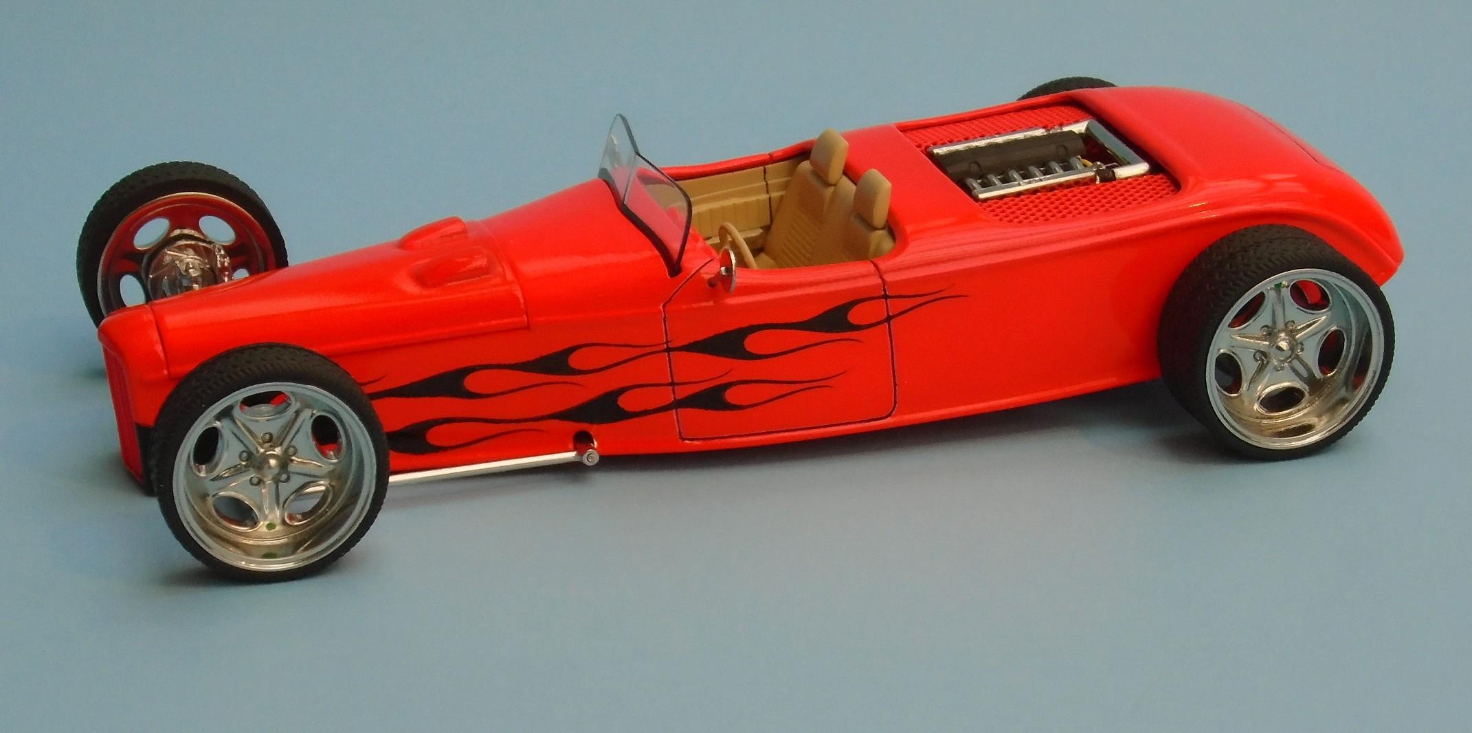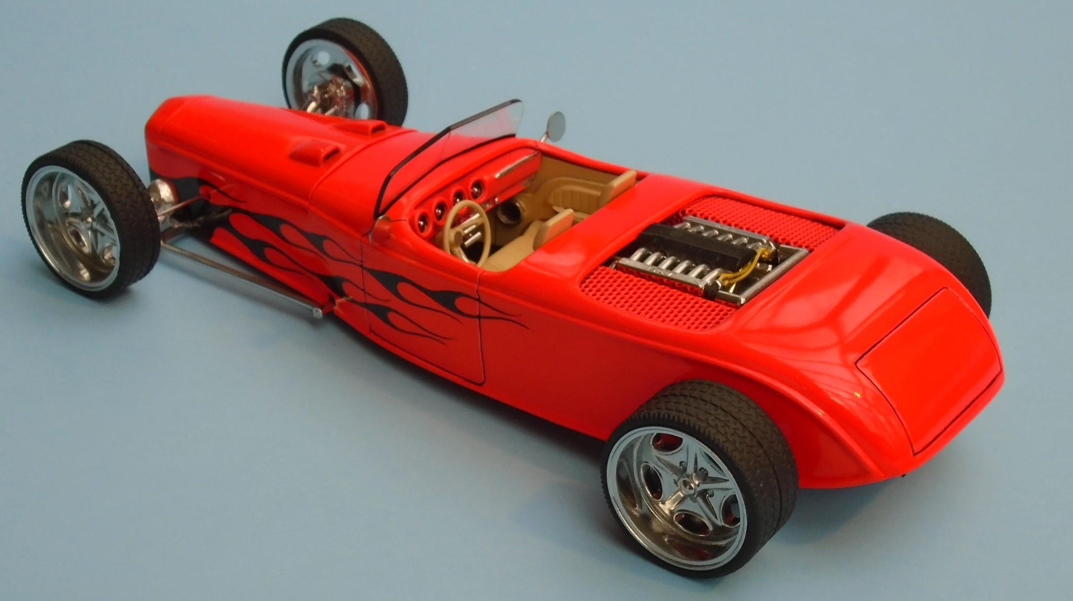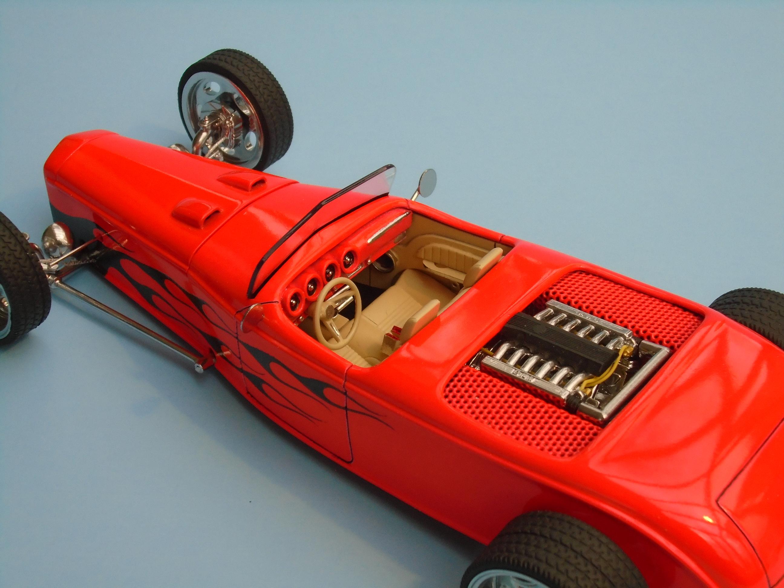 Claude Thibodeau Posted 5 hours ago Posted 5 hours ago Hi! Had many leftovers from kits that had been kitbashed in previous projects, and then I found two gluebomb 34 Duesenberg in a Ziplock at a recent show for 5$. So... Smoothed the body and hood top, shortened the grille and scratchbuilt: hood sides. reveal moldings, hood hinge, gas tank, R&P steering, belly pan, rear engine compartment mesh panels, air intake tube, door panels, console, pedals, shifter, seat belts, door speakers, taillamp, etc. Engine and IRS are from the BMW Nazca concept car, rear seat from a late Mustang, and windshield from a 37 Ford (all extensively modified). Tamya bright orange + Neon orange lacquers + Lazy modeler flame mask for black flames. Mr Hobby Premium Top Coat clear, fully polished. Rolling stock is modified (narrowed in the front) diecast stuff, hoses & wires, and all chrome is Revell's, with a few Molotow accents. You can't build 'em long and low 'enuff! Hours of fun with styrene. CT. 2
