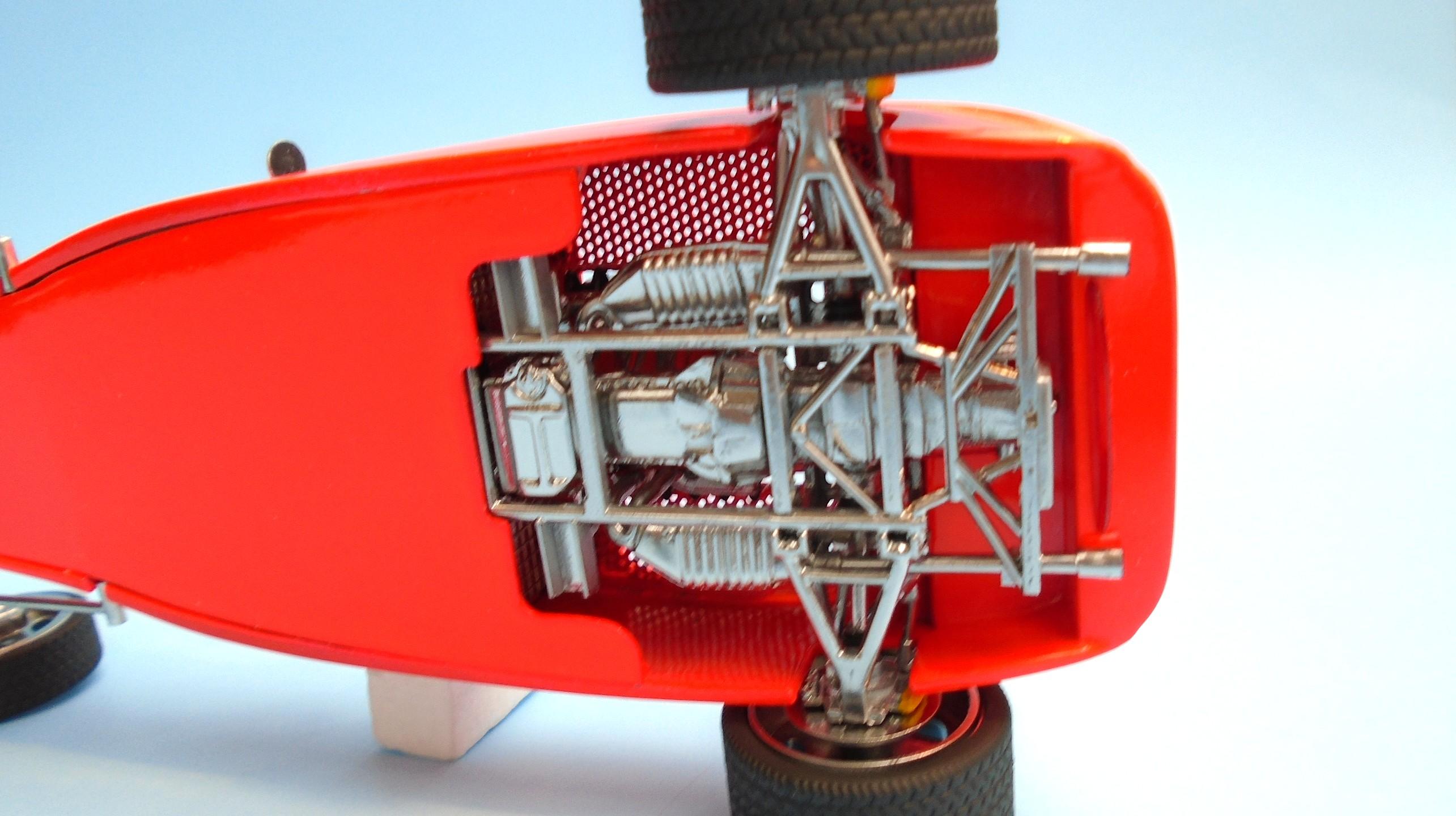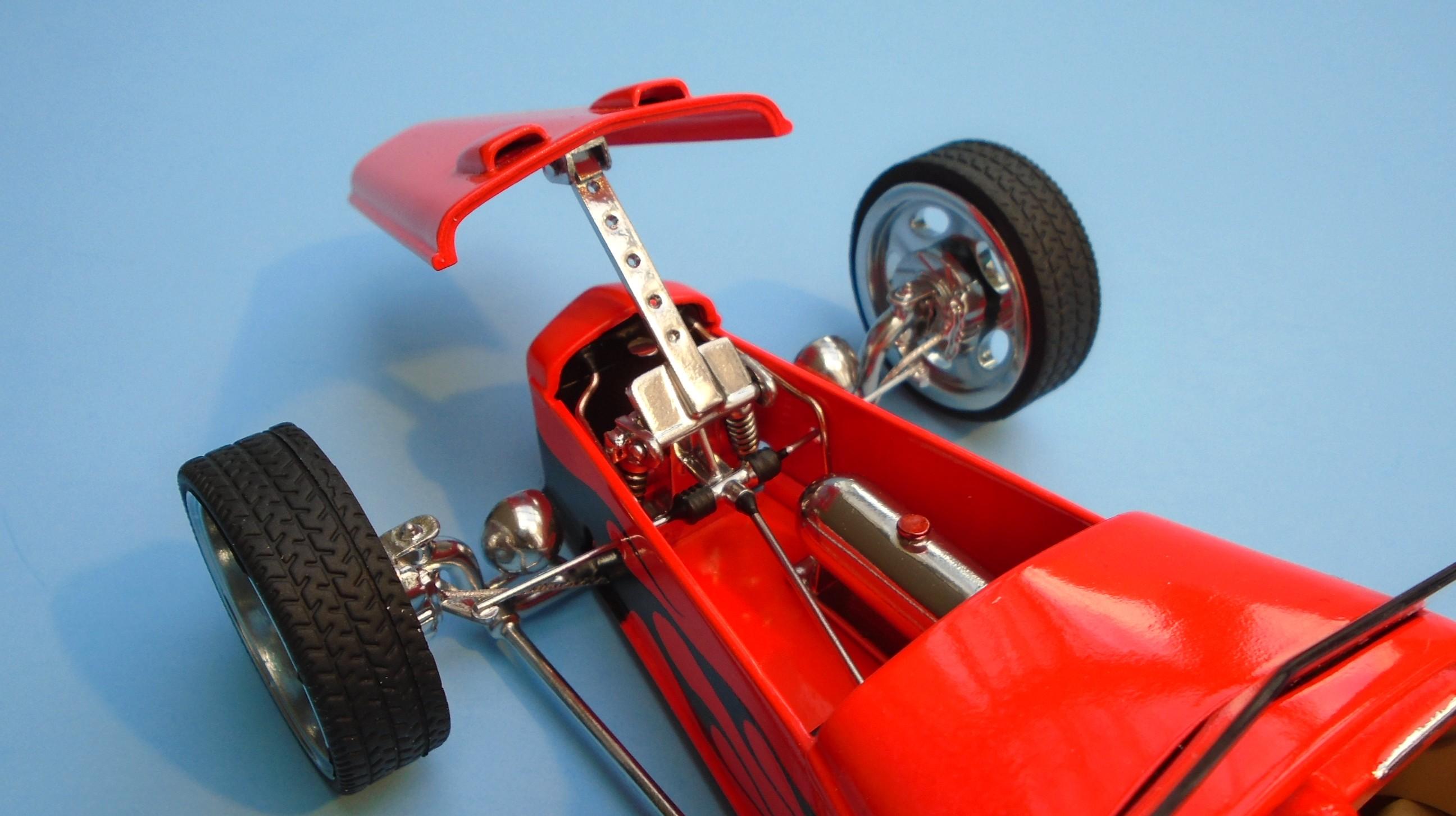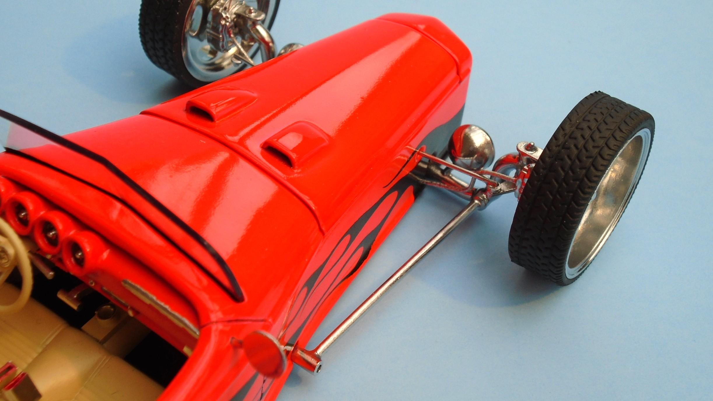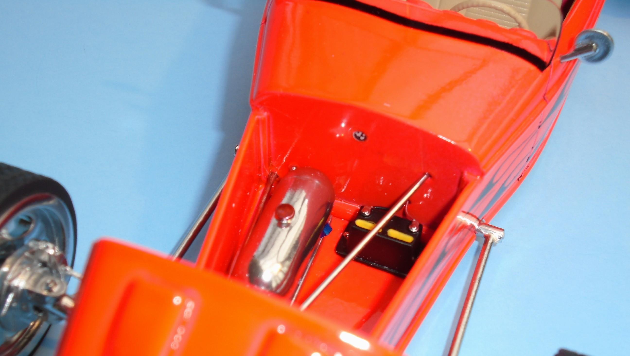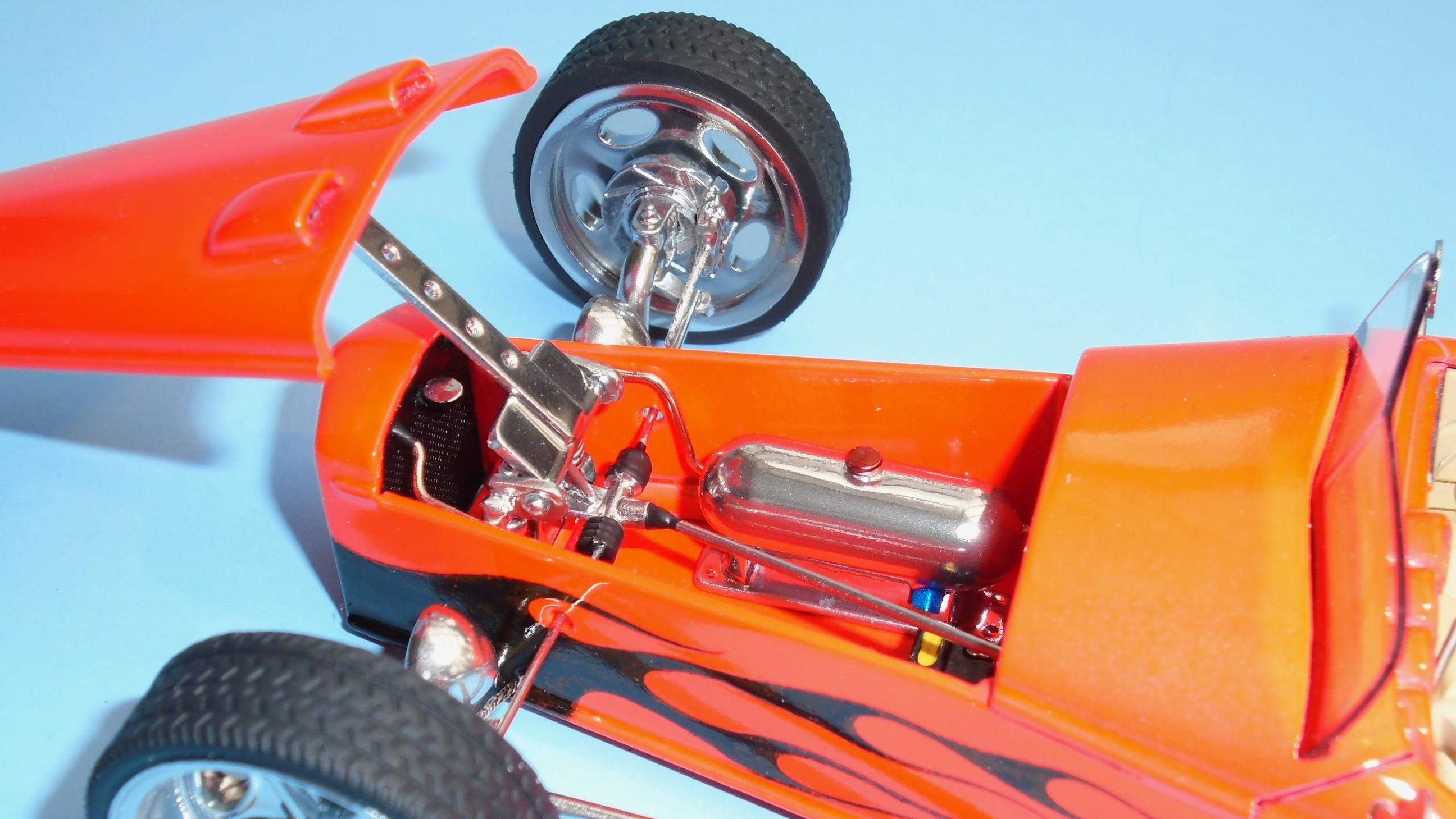 Claude Thibodeau Posted 5 hours ago Posted 5 hours ago Hi! Had many leftovers from kits that had been kitbashed in previous projects, and then I found two gluebomb 34 Duesenberg in a Ziplock at a recent show for 5$. So... Smoothed the body and hood top, shortened the grille and scratchbuilt: hood sides. reveal moldings, hood hinge, gas tank, R&P steering, belly pan, rear engine compartment mesh panels, air intake tube, door panels, console, pedals, shifter, seat belts, door speakers, taillamp, etc. Engine and IRS are from the BMW Nazca concept car, rear seat from a late Mustang, and windshield from a 37 Ford (all extensively modified). Tamya bright orange + Neon orange lacquers + Lazy modeler flame mask for black flames. Mr Hobby Premium Top Coat clear, fully polished. Rolling stock is modified (narrowed in the front) diecast stuff, hoses & wires, and all chrome is Revell's, with a few Molotow accents. You can't build 'em long and low 'enuff! Hours of fun with styrene. CT. 2