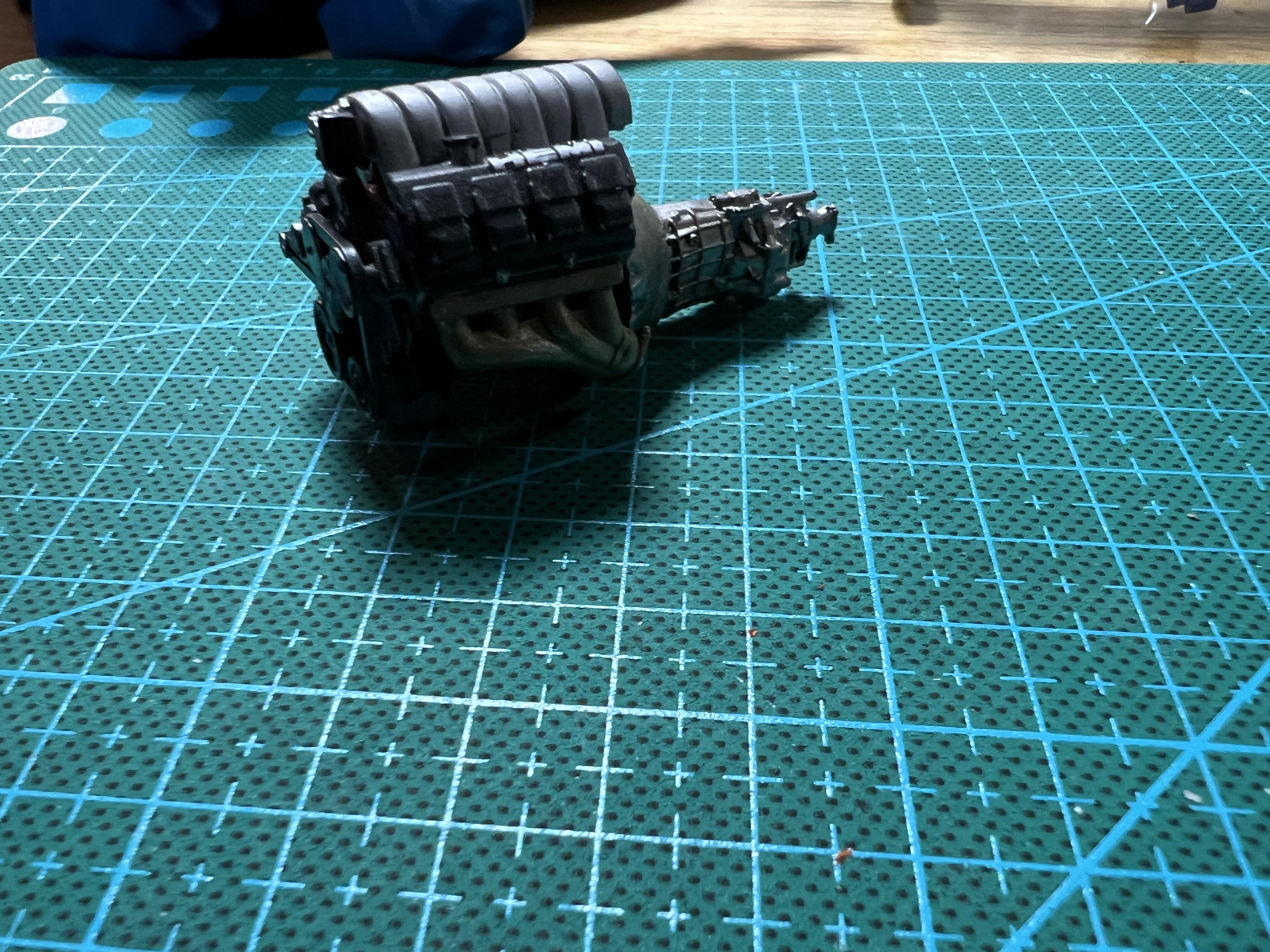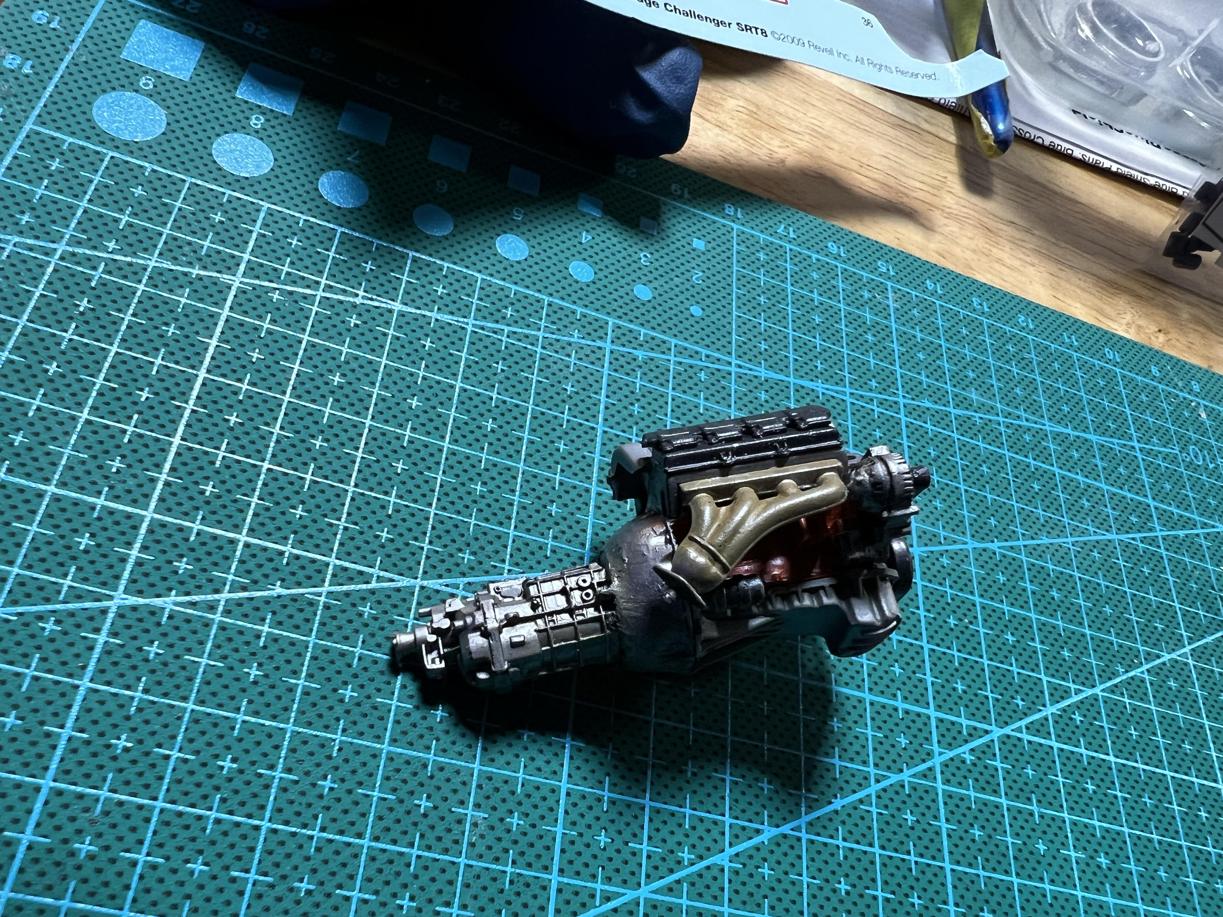 Moparman18064 Posted Wednesday at 04:09 AM Author Posted Wednesday at 04:09 AM Grille and bumper pretty much done. A member on another forum sent me all the engine parts from his kit, as he is building a super stocker. I cut off the NAG auto trans, and the Texas 3d Customs Tremec 6060( for a Mustang), so that I could mate it to the Hemi. I then modified the bell housing to more closely match the real thing. 1