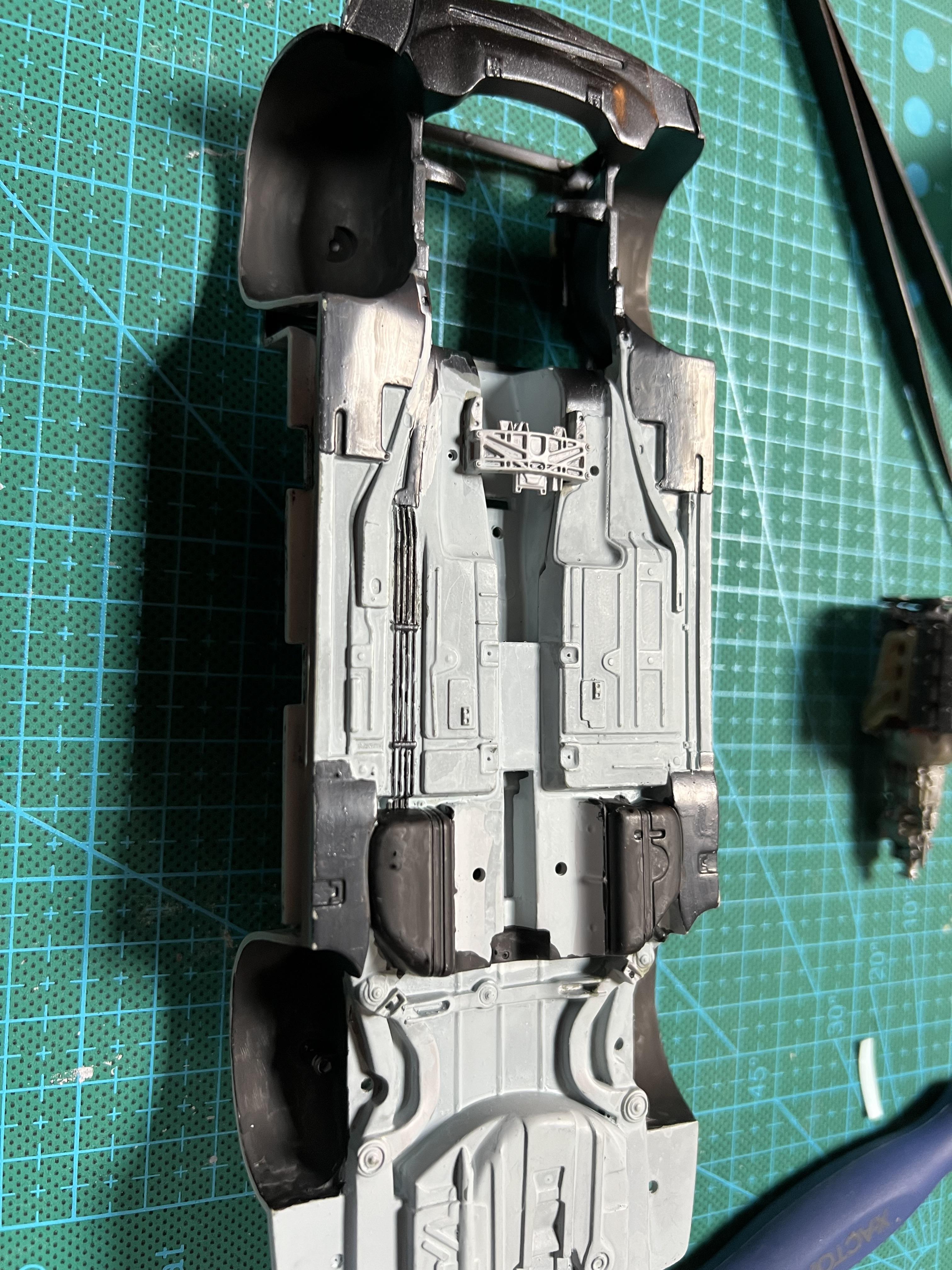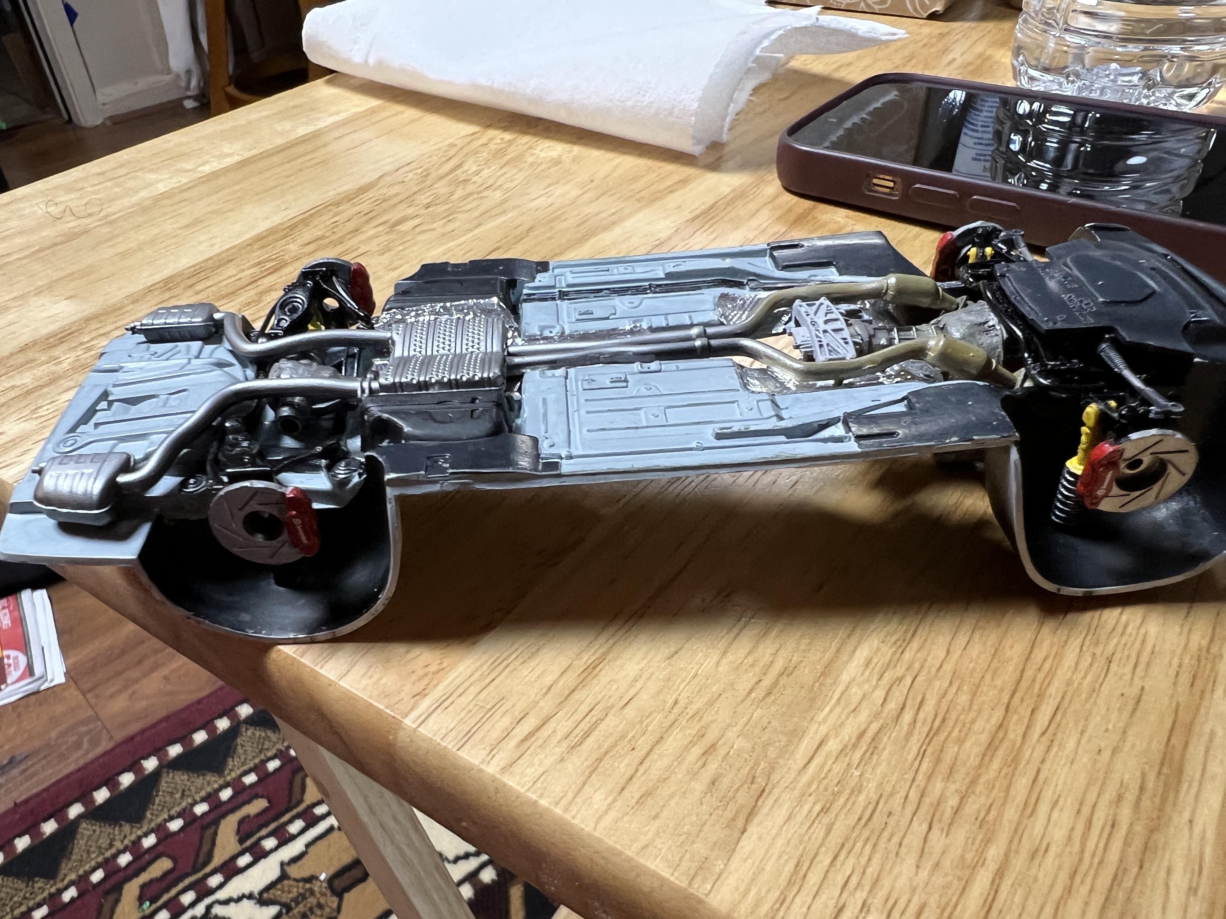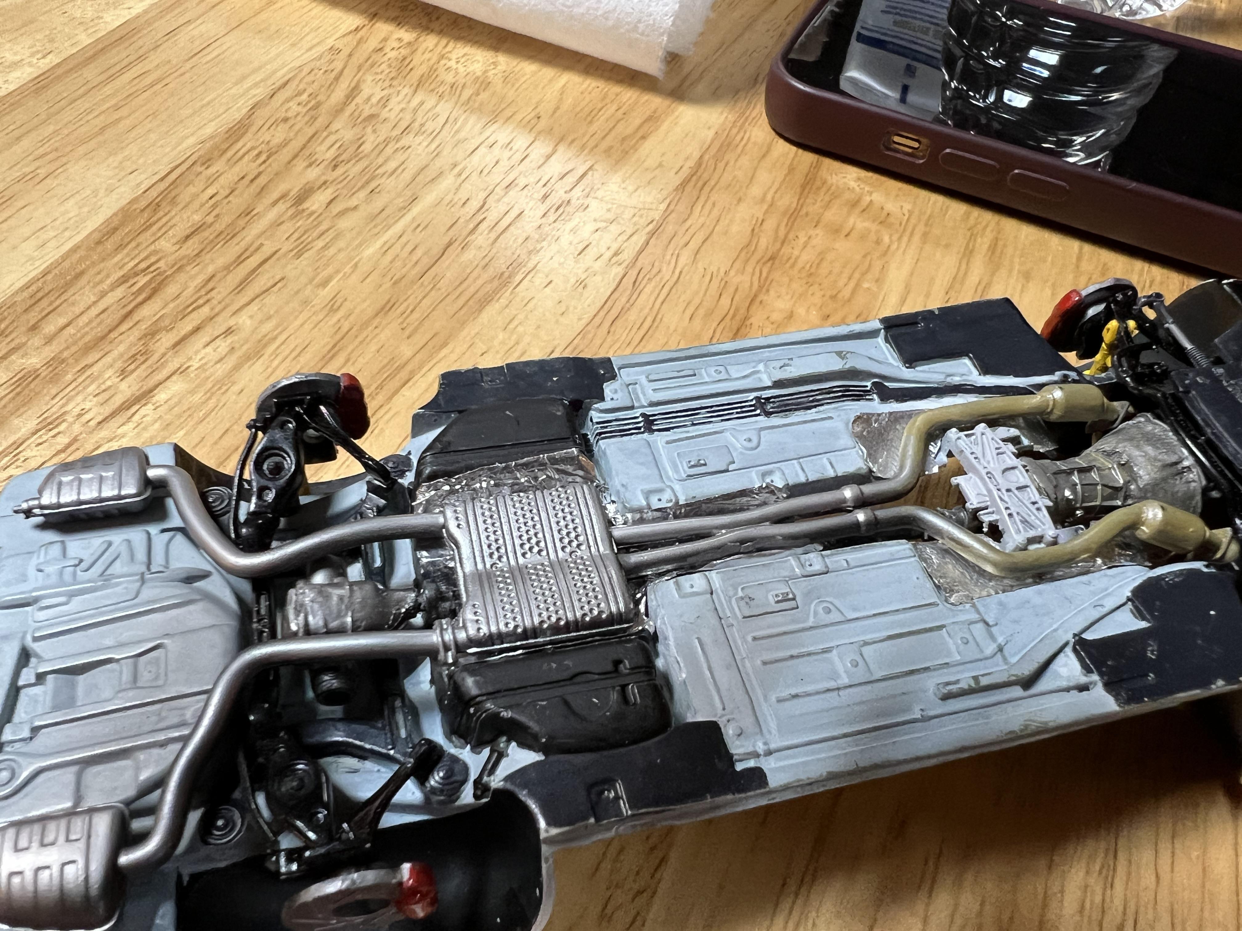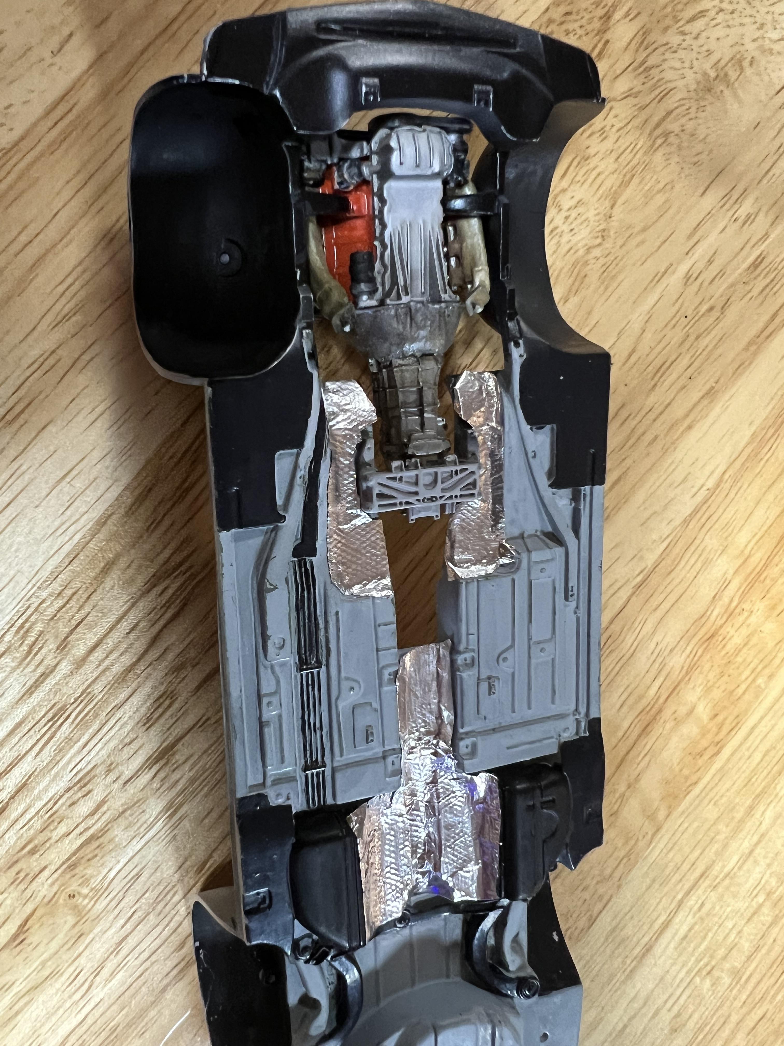 Moparman18064 Posted Wednesday at 04:17 AM Author Posted Wednesday at 04:17 AM Started to get chassis looking like the real car. I made heat shields by pressing aluminum foil against the knurled part of exacto knife.I painted and assembled interior, made clutch and brake pedals, modified the automatic console to manual, shortened a VCG Resins pistol grip to look more like my actual shifter. For velour sections of interior, I used Tamiya extra thin and baking powder( was quite messy to do) 1