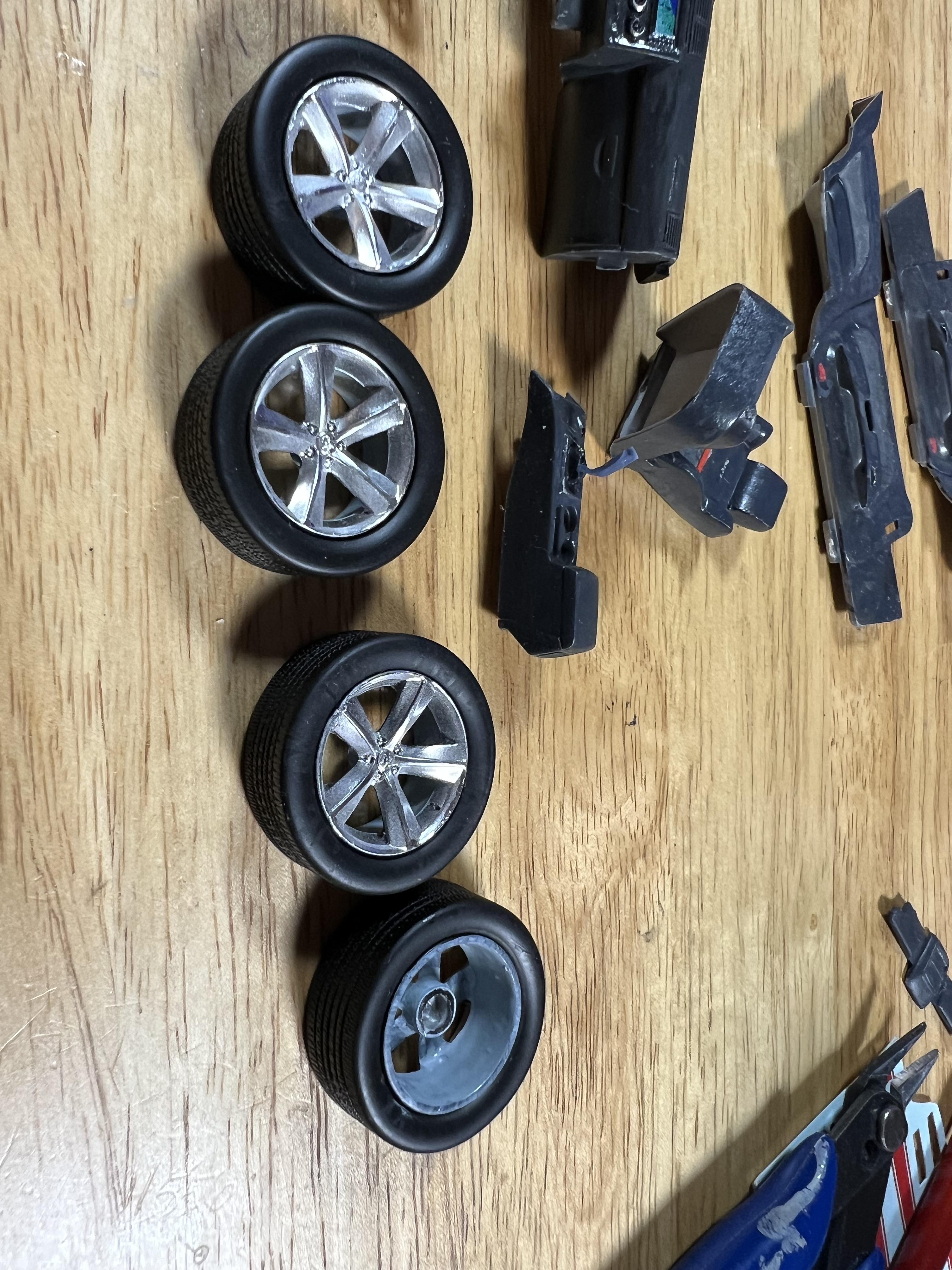 Moparman18064 Posted Wednesday at 04:21 AM Author Posted Wednesday at 04:21 AM Stripped and painted wheels gloss black, followed by Alclad polished aluminum, Molotow and Vallejo gray blue. I assembled chassis, rotors, wheels, exhaust. I scratch built a clutch master cylinder from clear sprue 3