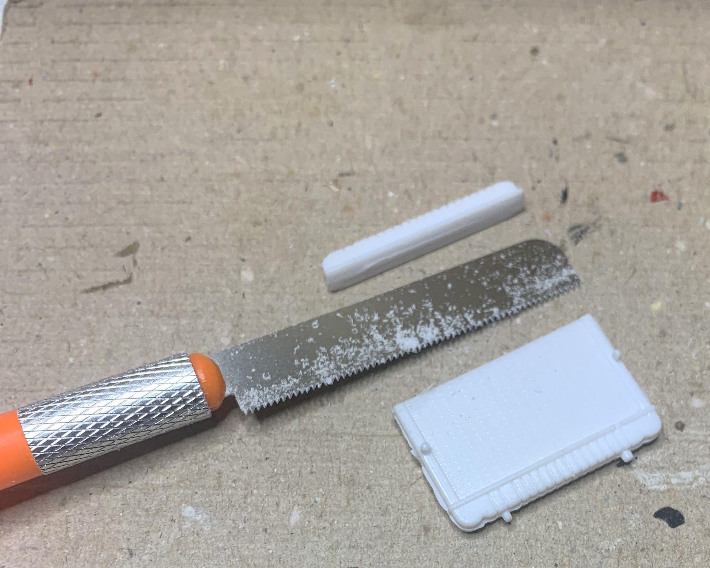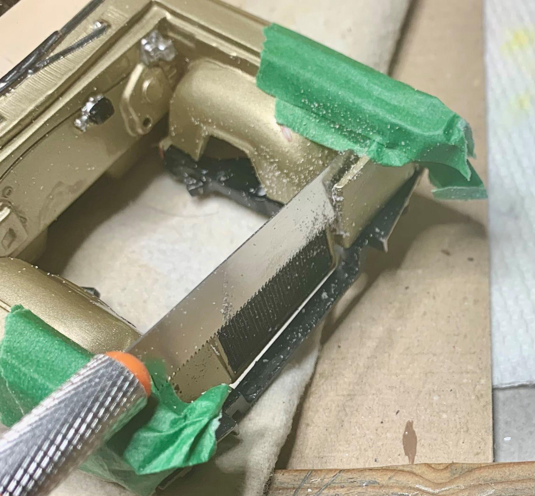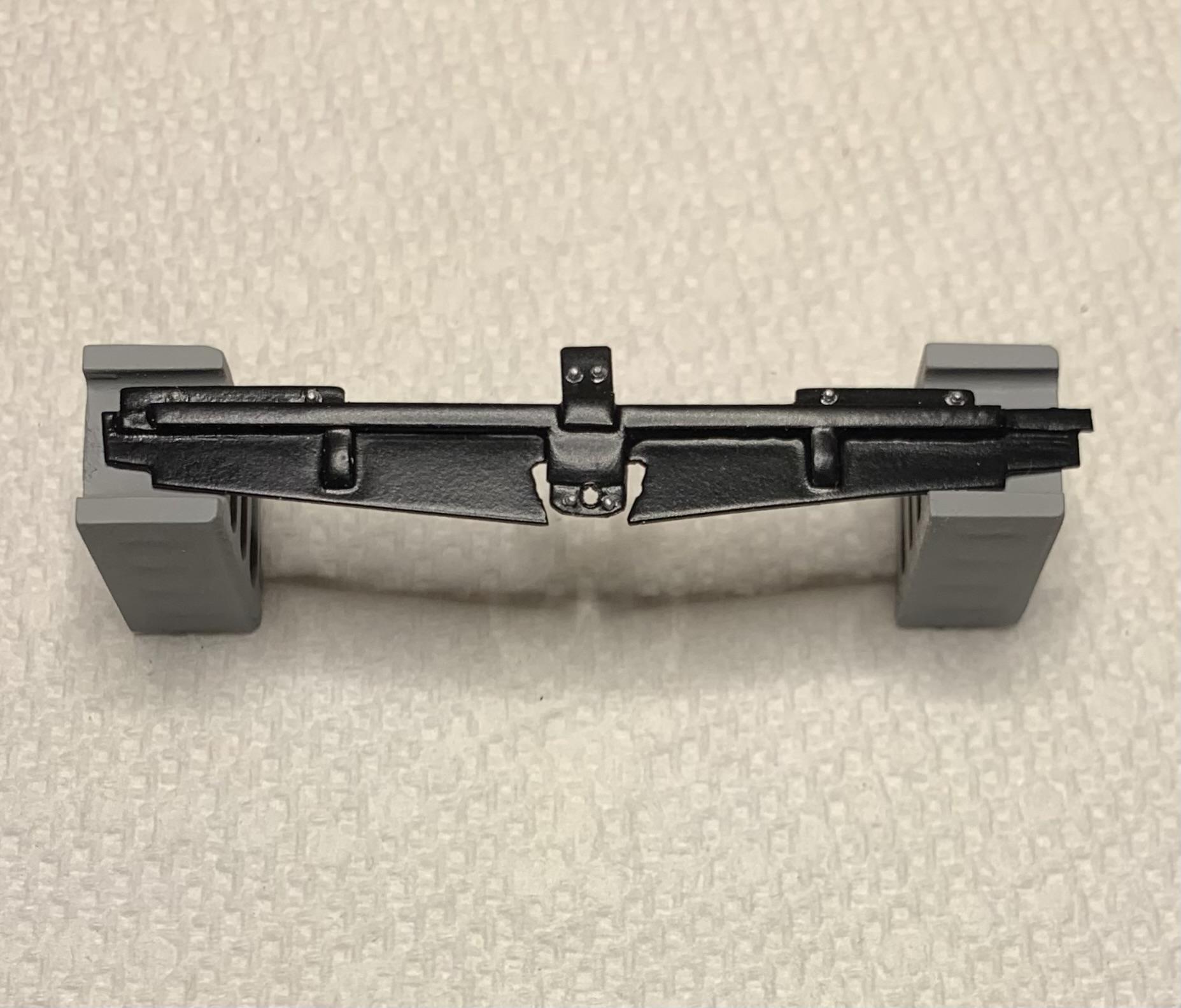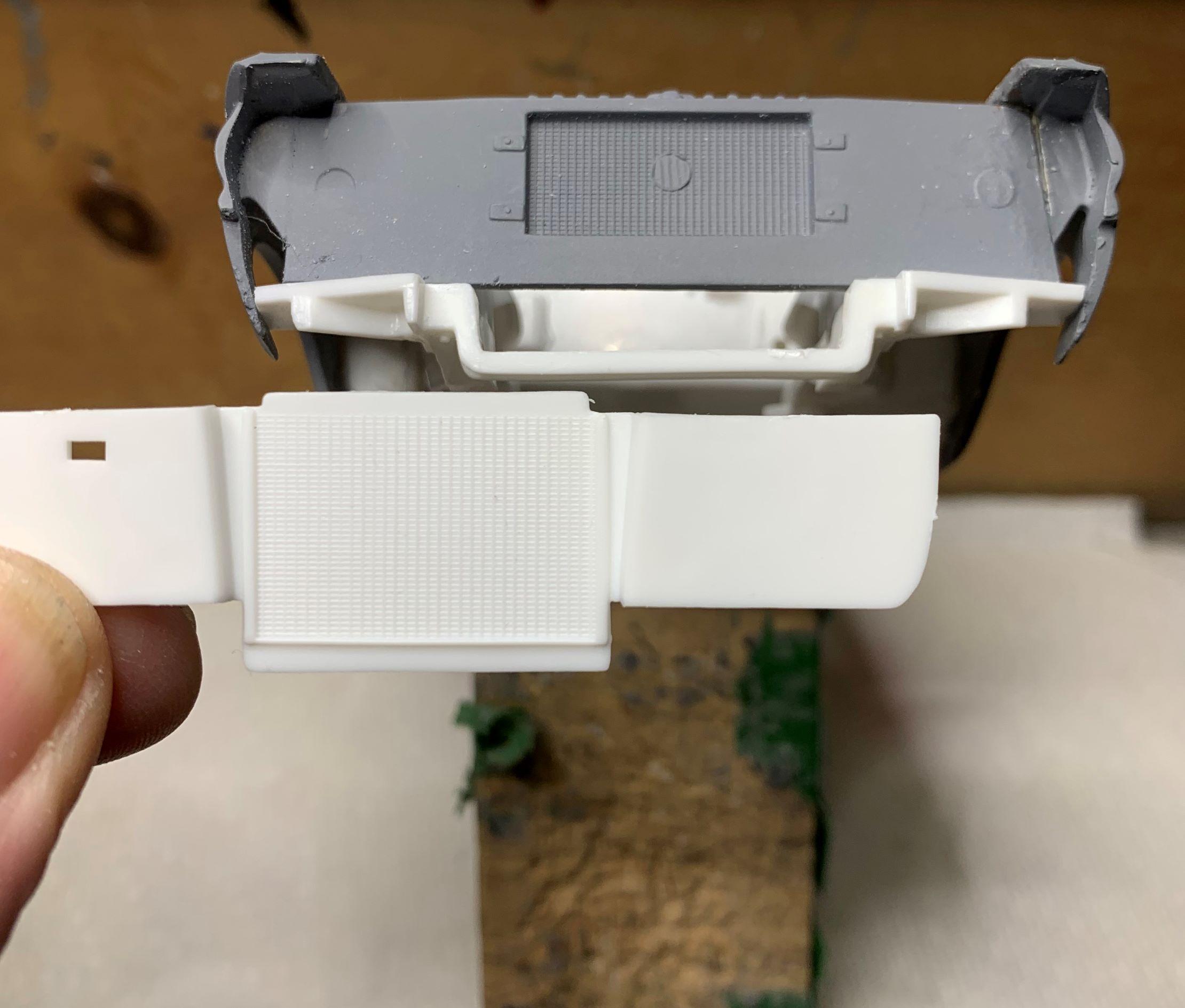dino246gt Posted 22 hours ago Author Posted 22 hours ago I scratch built this piece to bridge the new rad with the grille. It's just layers of flat styrene, drilled with tiny bolt heads from the railroad section added. Here it is installed. 5
