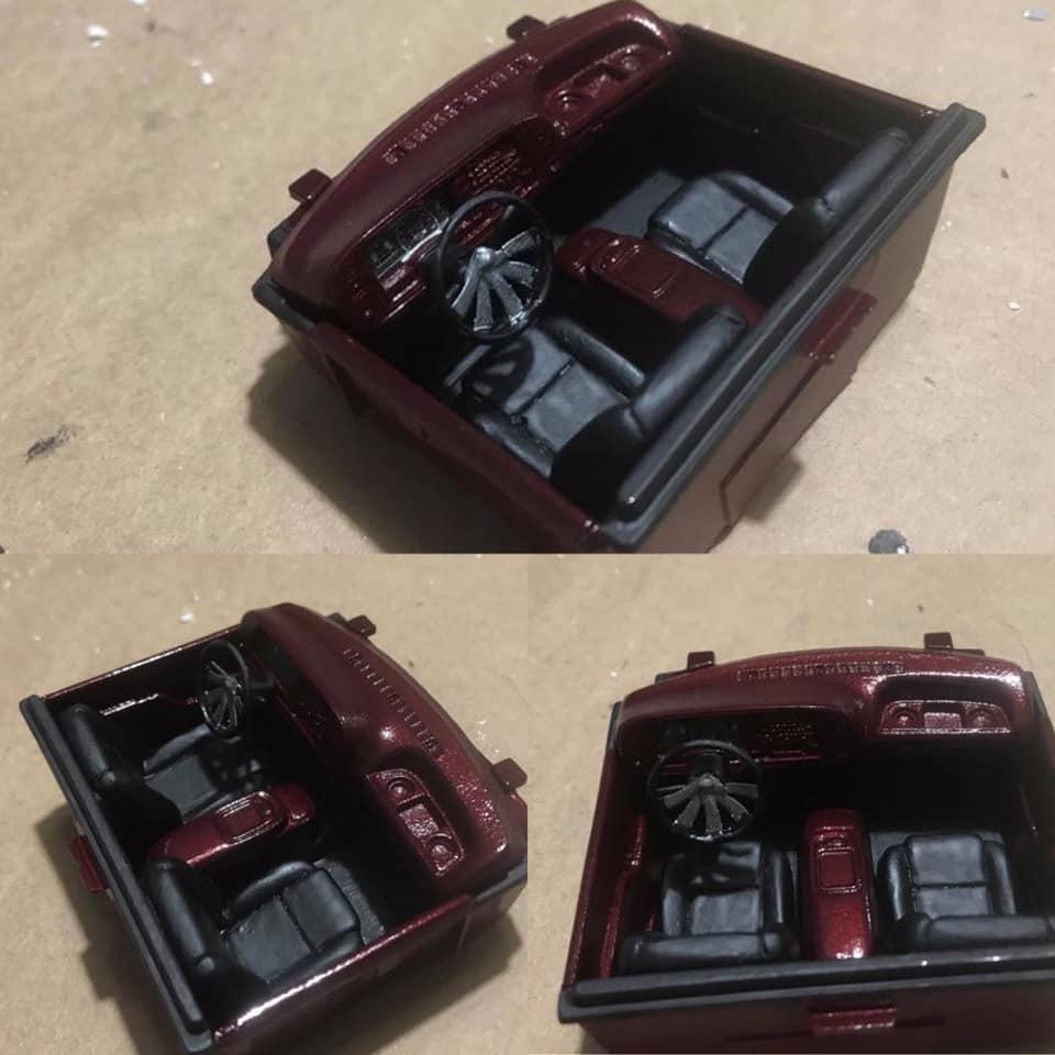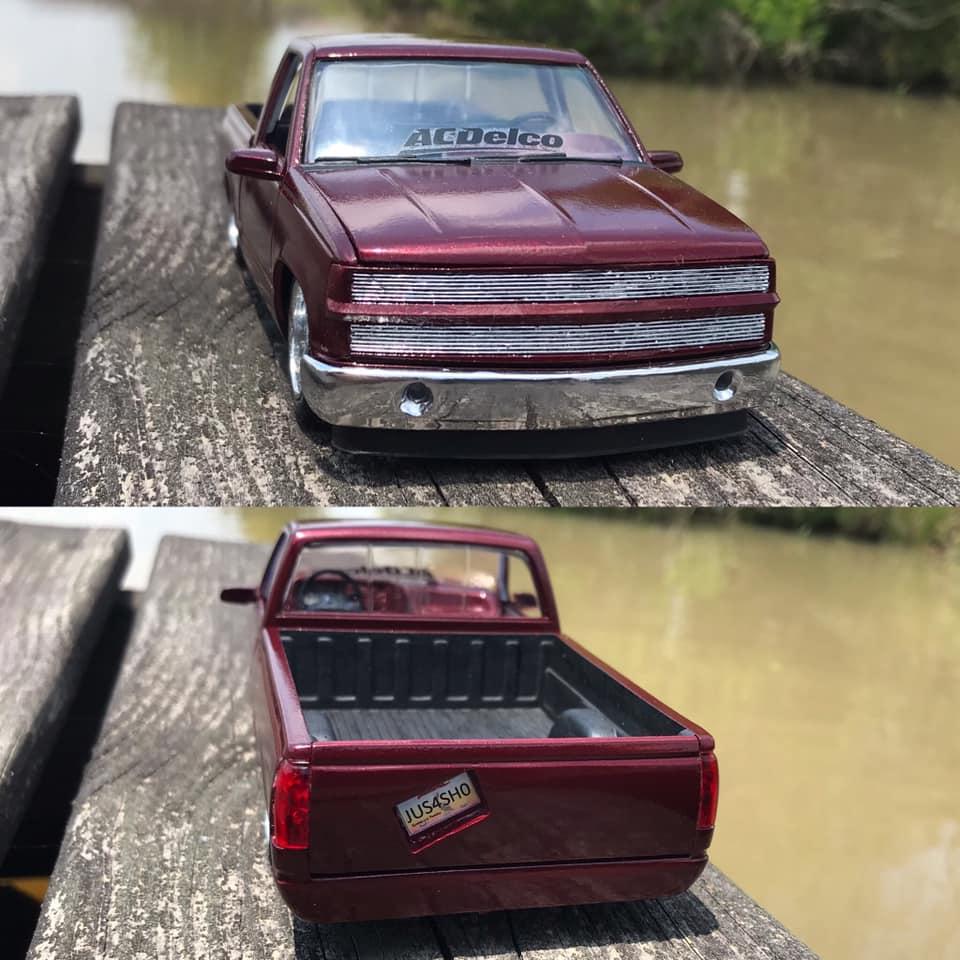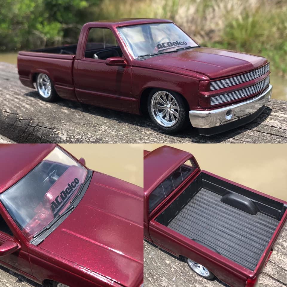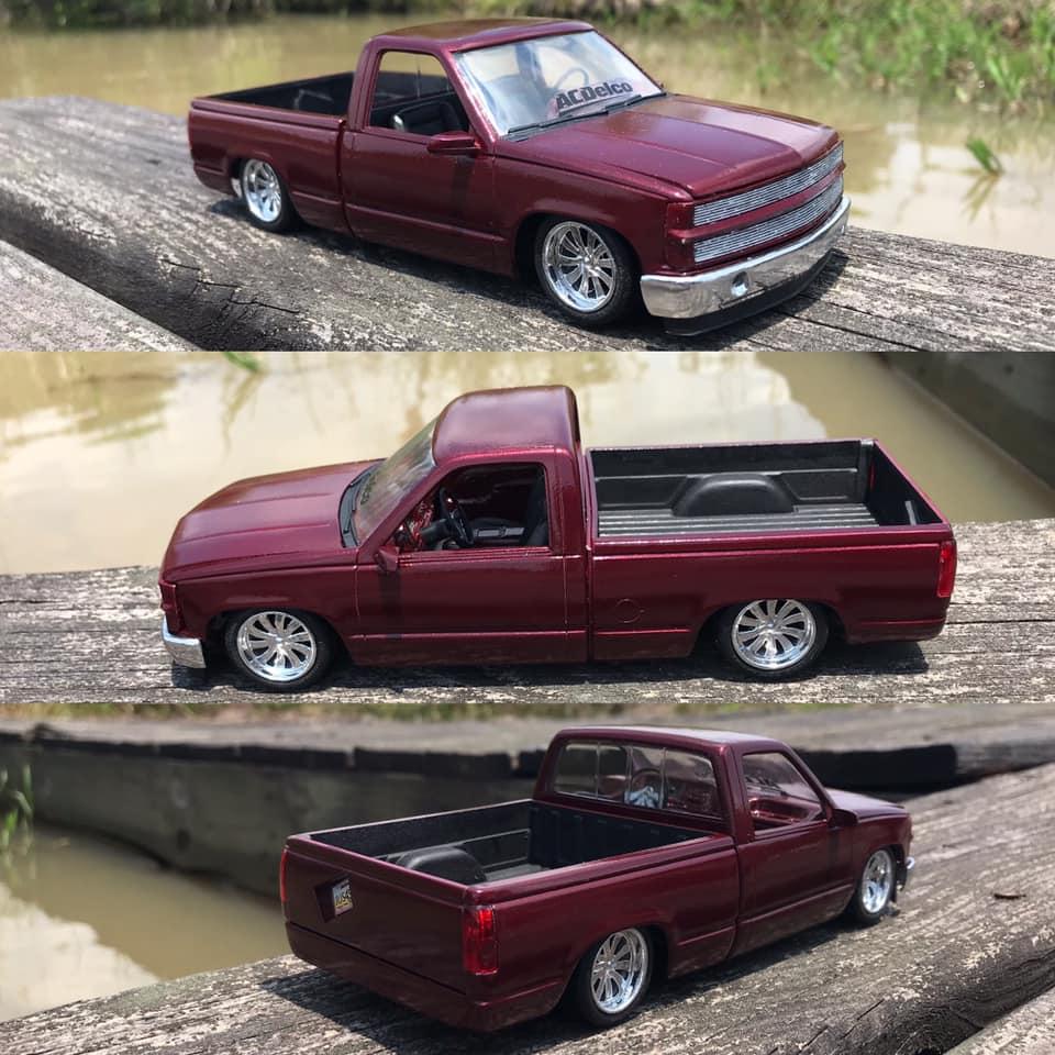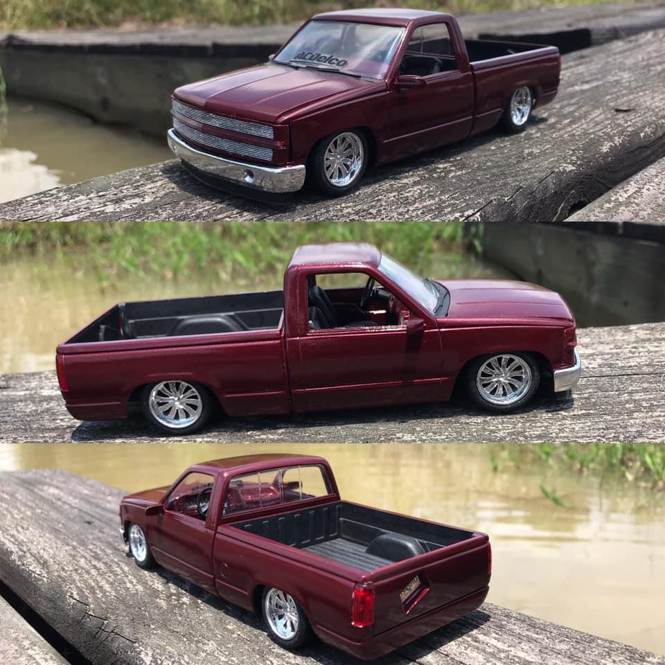 Lemcoplasticworks Posted Monday at 08:37 PM Posted Monday at 08:37 PM A simple and clean 90's Chevy with a 90's street truck style. I normally lay things flat on the ground but this one deserved the 4/6 stance. Has a phantom billet grille, smooth the front bumper and added fog lights as well as re chromed it, added a roll pan and a crooked tag box in the tailgate. Shaved all of the handles as well. There's a not a single cab kit or promo with the round dash interior. So I took an extended cab interior and chopped it down to fit. Has a matching steering wheel to the Boyd wheels. The build was overall pretty fun and is one of my favorites despite how simple it is to a lot of the stuff I've built.Β 10 1