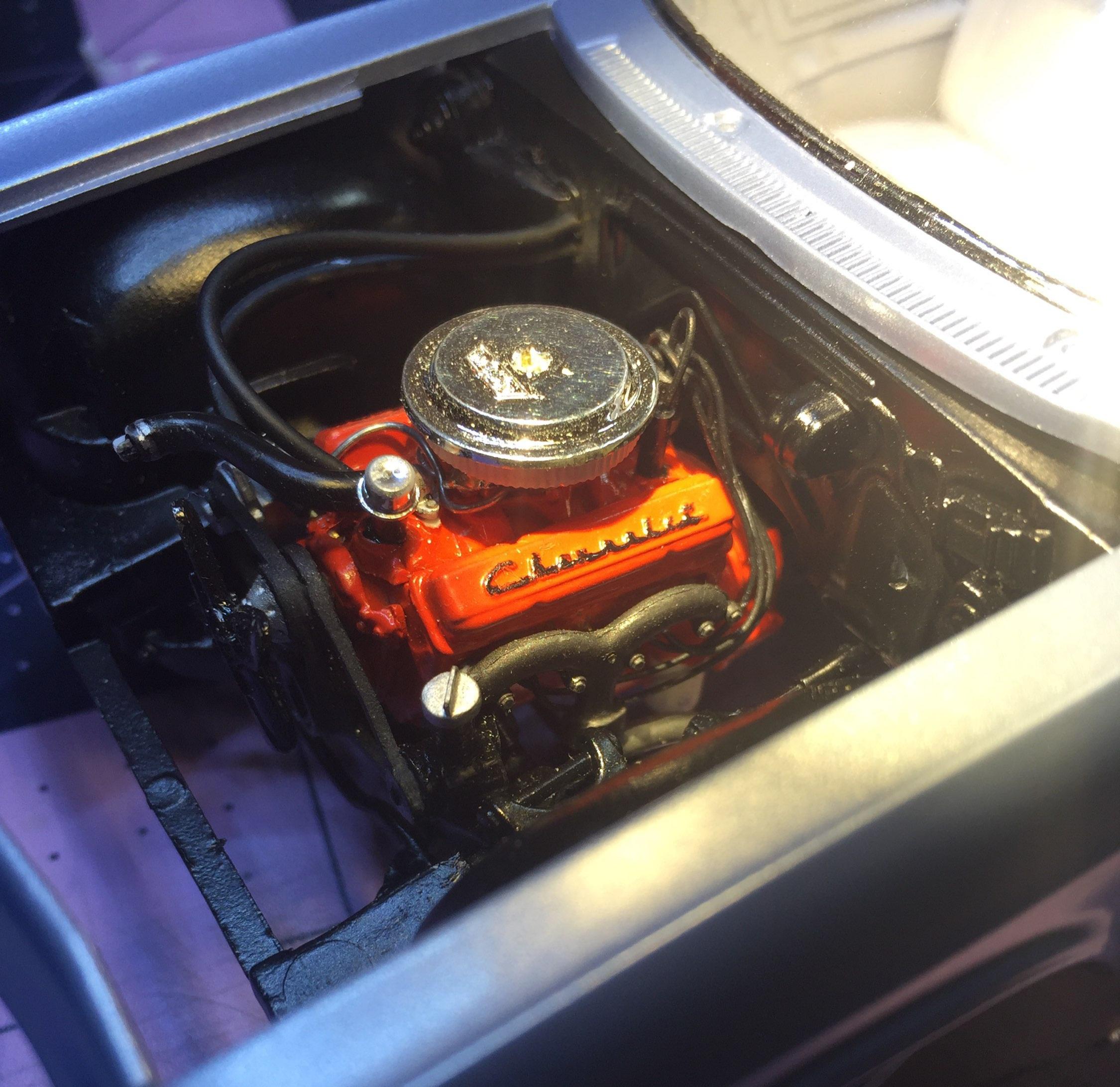 customline Posted Sunday at 05:49 PM Posted Sunday at 05:49 PM (edited) Most of this build happened a several years back. Originally, the idea was to replicate the car I was allowed to drive on occasion. It was the family car back in the late '60s. It was equipped with a 283/ powerglide and was Tahitian Turquoise with a black roof. The kit is the Revell SS 409/stick with A/C. When I opened the box I found a painted chassis, up on all four, and almost complete. The body was primed in white. I don't recall what kit I stole the small block from. We didn't have A/C in our Chevy so I eliminated the supply registers on the dash( and not very skillfully, I might add 😕.) At some point, probably because of the interior, I decided to just build it as an anonymous vehicle. It was not worth the extra work to make it my mother's daily ride. Yesterday I painted it Tamiya light pearl blue. It's very close to the light blue metallic that was popular then (and now.) Anyway, here's what's on the bench today I did a quick mockup to see where I'm at with this long overdue project. The white walls are a bit sticky. I suppose I could ignore that issue but it may be best to remove the stuff before it gets worse. What would you do? 🥴 After checking some interiors to see what needs to be detailed, it's pretty simple for the door panels. The dash...not so much, but I painted it body color and flat cleared the padding. Details later. My thought at the moment is the same blue for the upholstery. The front and rear bumper/grille had been done already and are in acceptable condition. The console was detailed with kit decals, I think. I know I used black BMF on it. This would be a nice ride for a high school senior to take his crush to the prom in if it wasn't for that blasted console. 😉 That's the story. Your thoughts are always welcome. Edited 1 hour ago by customline 6