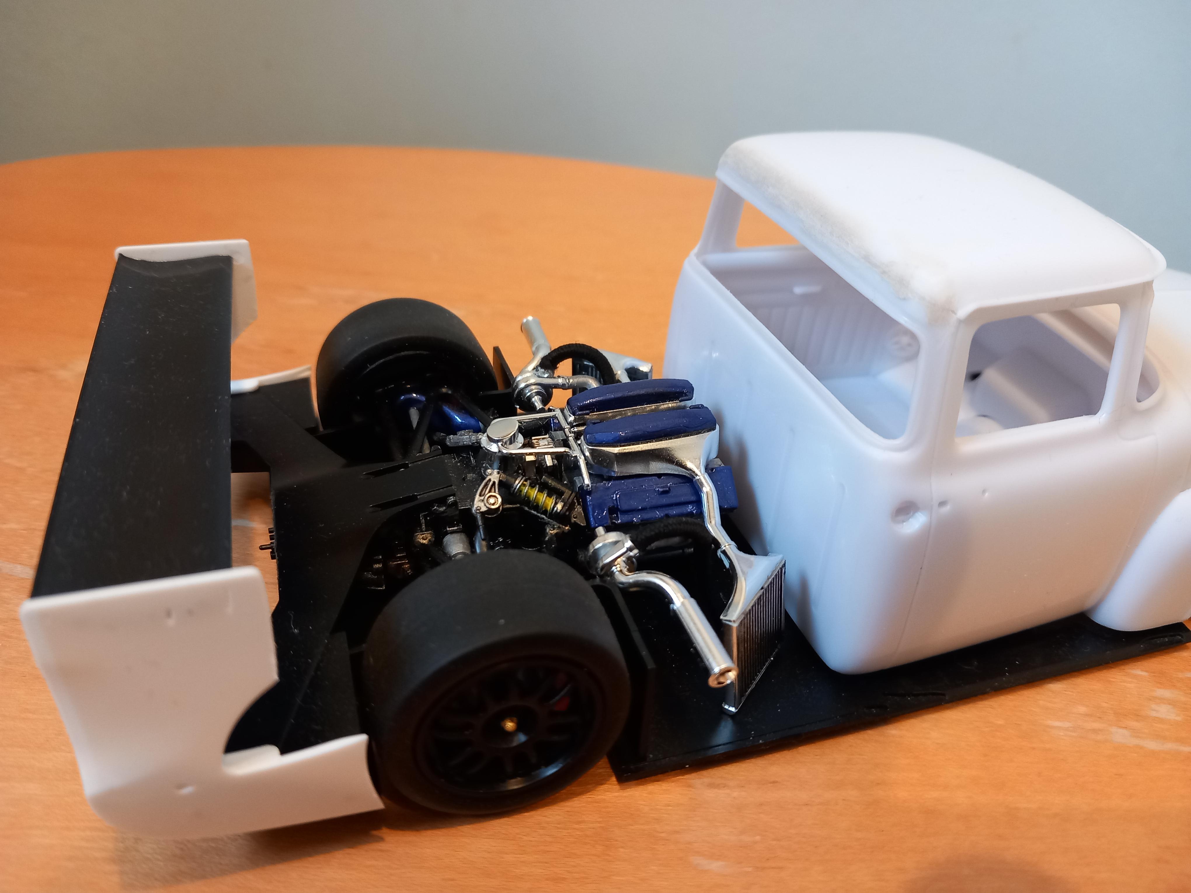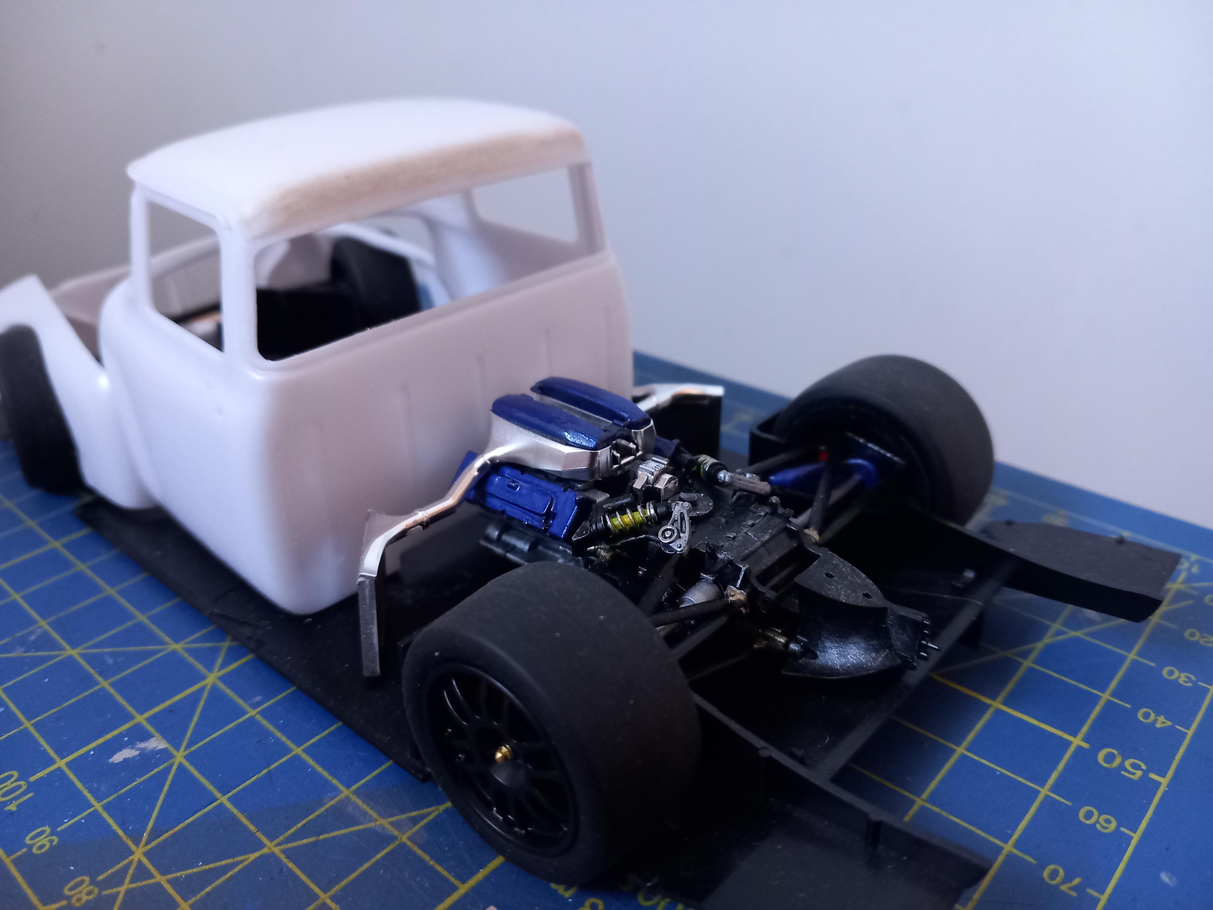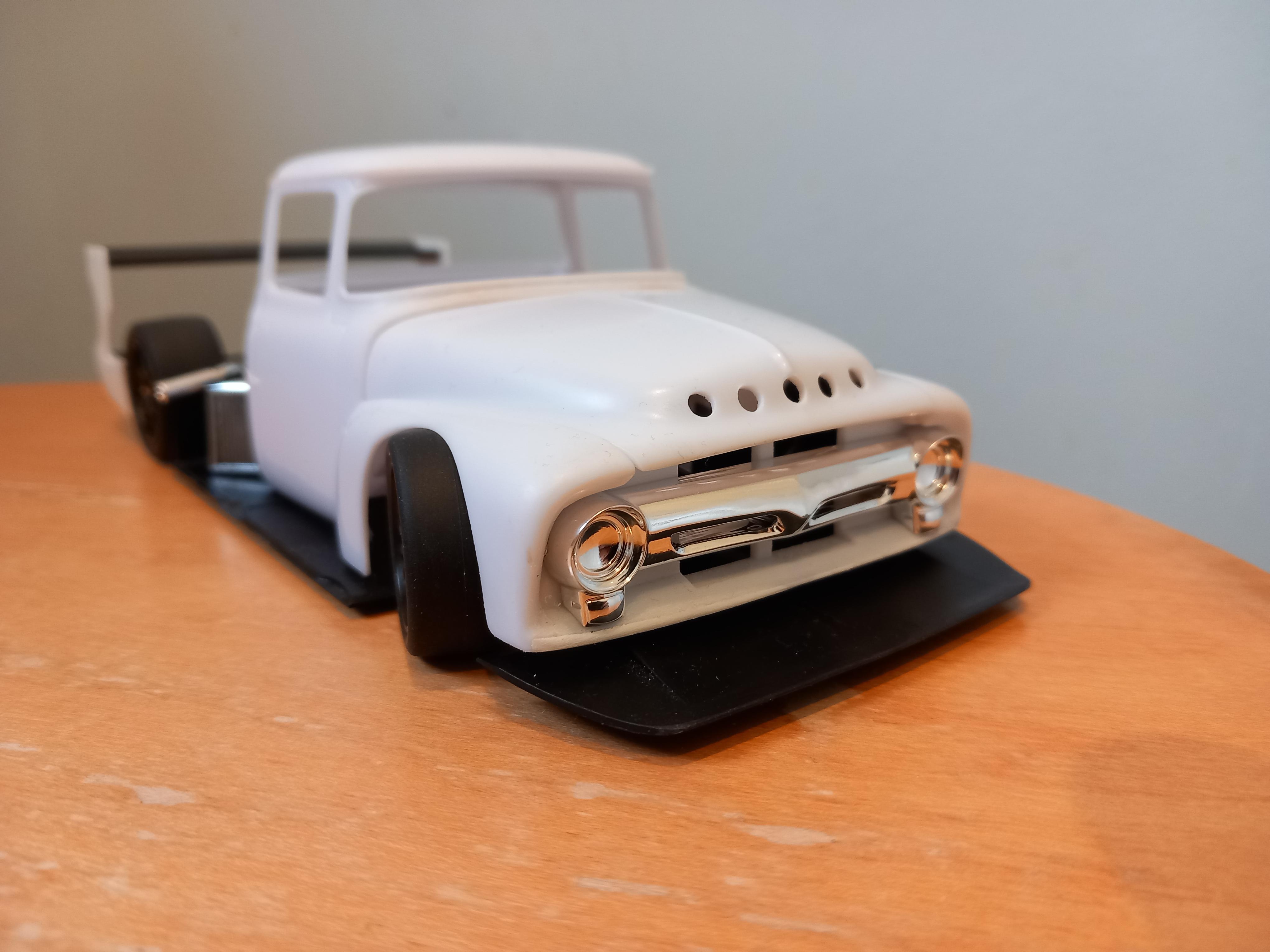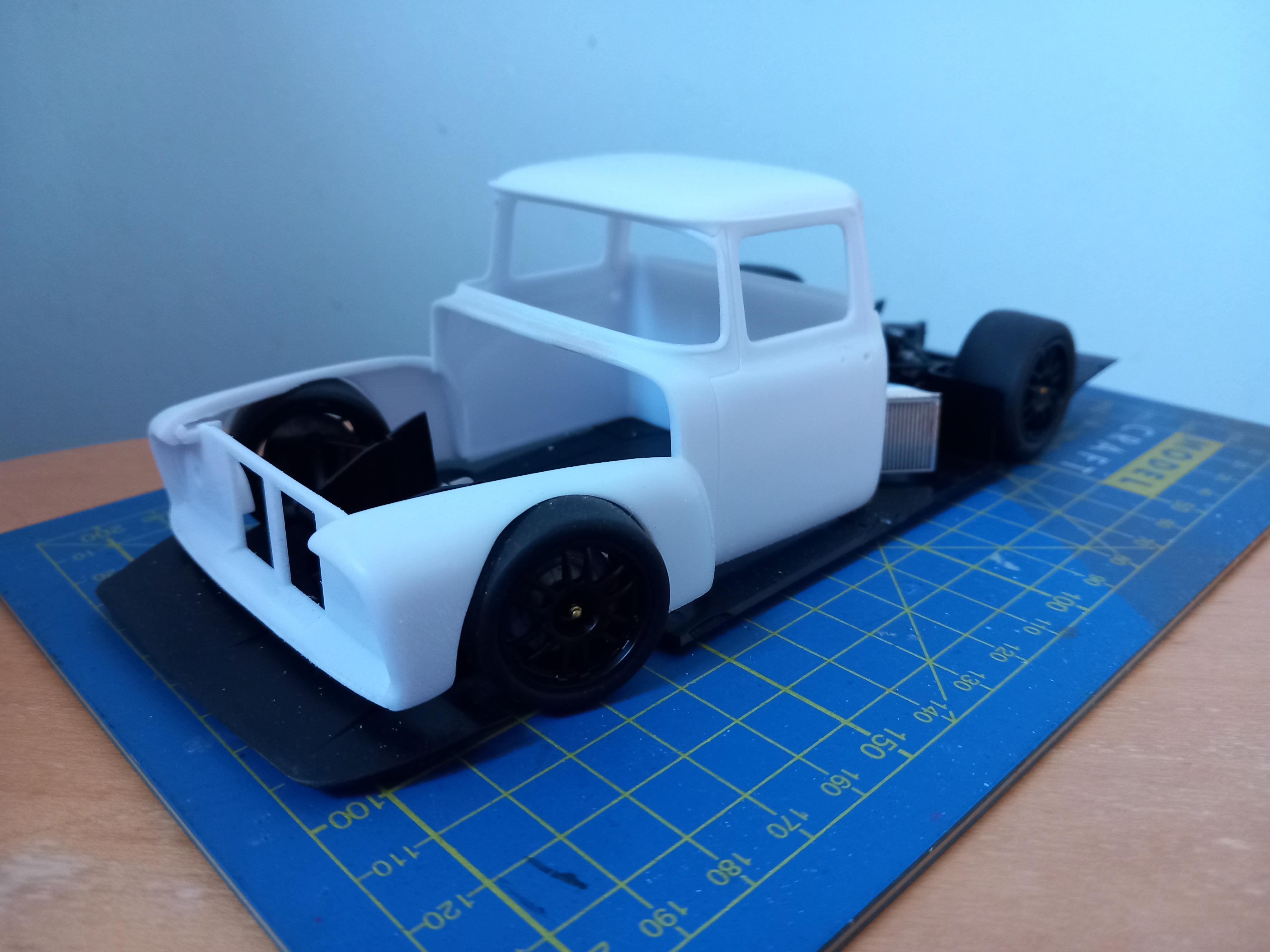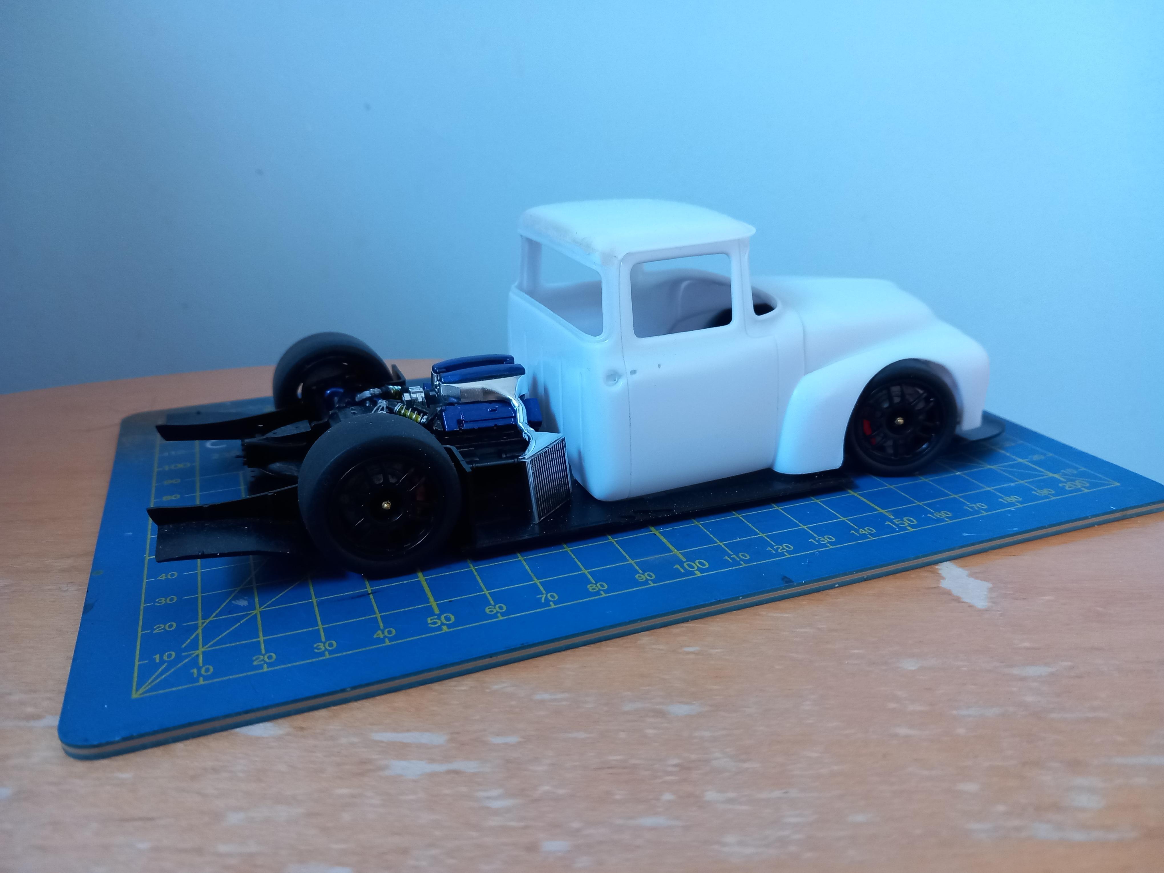 Lowlife ! ! Posted 19 hours ago Posted 19 hours ago Hi everyone ! Not been around here for quite some time, long hospital stay and then the recovery put me out of action. But Im feeling the need to chop up some plastic, so here goes another one ! Had this Foose edition FD100 for some time, and was going to build it fairly straight ! But i dont really do OOB, so a new idea was needed !! How about a Ford FD Cyberpunk truck ? With a touch of hillclimbing / racecar thrown in ? Got to give a shout out to Steve H on here.. His fantastic Dodge Daytona Cyberpunk first gave me the idea to build one. So thanks Steve, hope you approve ! I found a Toyota GT with twin Turbo V8 going cheap on fleebay, and came up with a plan !! Ive cut out the inner arches from the truck. Roof was blended in, and the arches have lost a few inches off the bottom. Next the front end had a few more inches cut off the lower half, to fit the front splitter, and then ive radialised the front wheel openings to get the tyres to fit ! Not sure yet but i might cut out the rear arches and make a new bed ? Anyways see what you think ! More soon ! 2 1