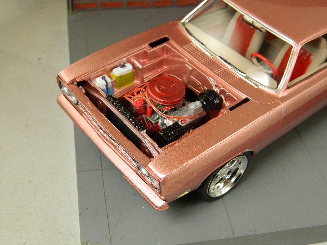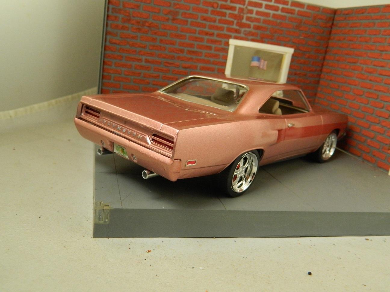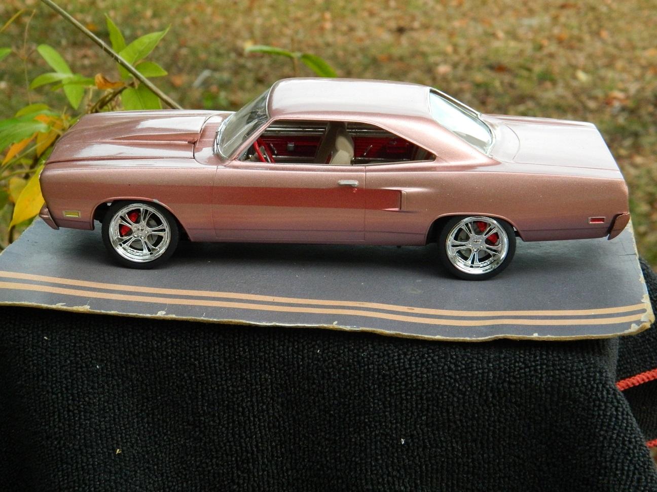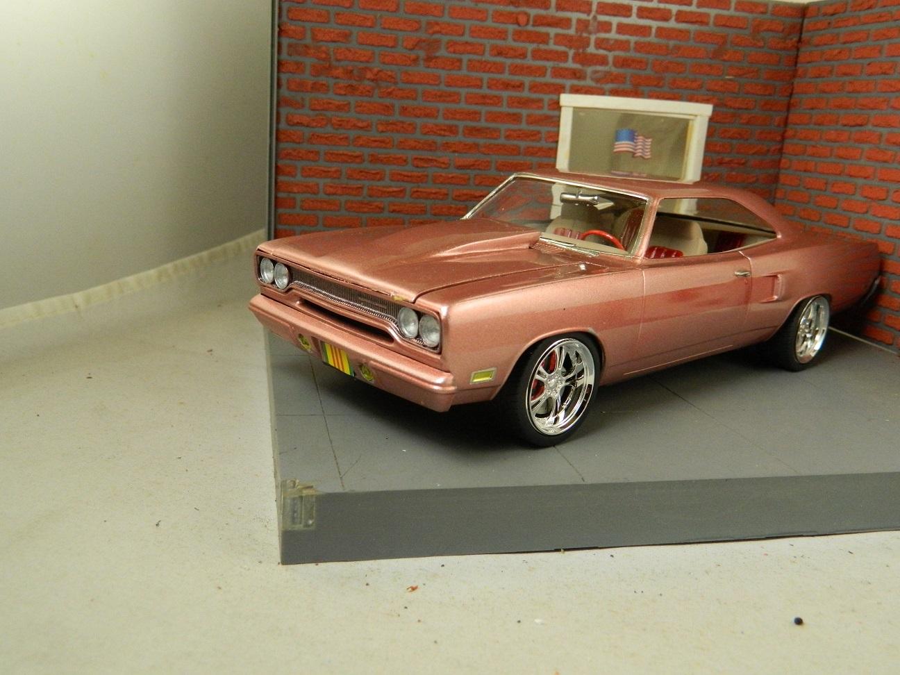 crazyjim Posted 1 hour ago Posted 1 hour ago My latest completion is this 1970 Road Runner. Paint is Inspire rose gold with a venetian red side stripe.Bumpers were stripped and painted body color. Icenam Collection 426 Hemi was installed as well as a cowl induction hood. Wheels/tires are Pegasus Phat Daddies. Vent windows were eliminated. Alumunum tubing exhaust extensions were added. Interior is done in tan and burgundy.