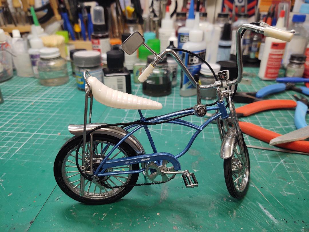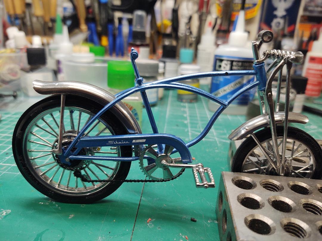 Scott Eriksen Posted yesterday at 12:13 AM Posted yesterday at 12:13 AM This is probably the most fiddly kit I've ever done,,,lol but anyway its a tribute to the Schwinn I had,,I didn't have the "Krate" version with the springer front though. Mine was blue with the white pearlescent banana seat .I stripped off all the kit chrome and used Revell chrome topped with Spaz Stix Clear for chrome . I hit the frame with a can of Mopar B5 Blue touch up I had then 2K clear over that. Banana seat is Tamiya Pearl White with 2K clear, might have it done this weekend 2