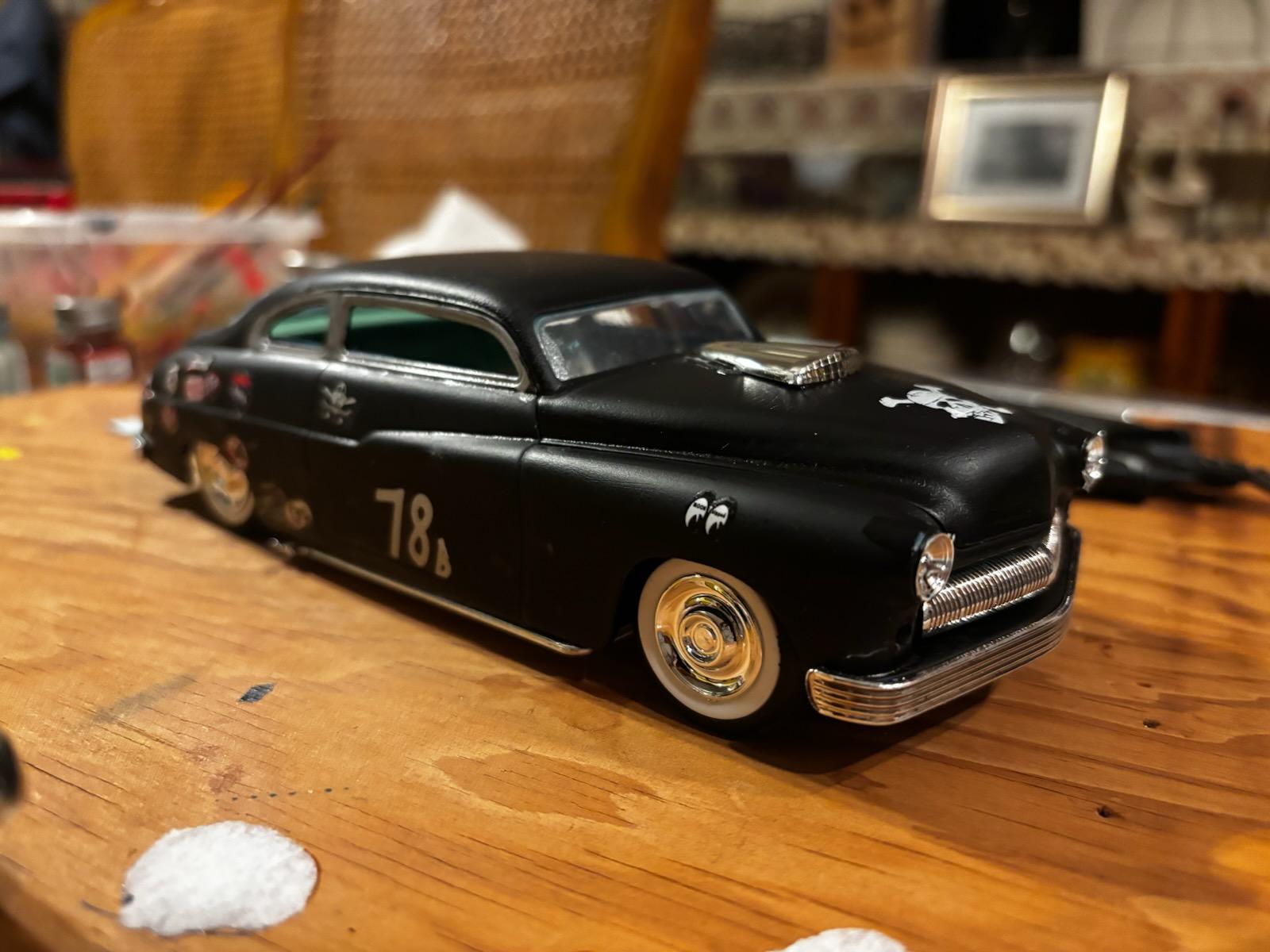 ChainsawMike Posted 1 hour ago Posted 1 hour ago dont really know what I am going for here, this was my first car build after I got tired of doing pickups. It was originally a tamiya coral blue and the engine bay was still unpainted, few nights ago I sprayed it a matte black with some spare "bumper spray paint". Then I took a bunch of decal sheets I never used and slapped whatever I thought looked 'racer-esque'. I'm new to the automotive hobby as a whole and don't know too much about drag racers and vintage gassers, so take this with a grain of salt! I also took out the stock motor that it came with, horribly painted with acrylic and had awful brush strokes on it. going to re do that engine entirely with new chrome valve covers, manifold, and carbs. for the time being I shoved a SBC into it from my spare parts drawer, and repainted the engine bay. Now I gotta re do the interior and put new seats and dashboard into it. 1