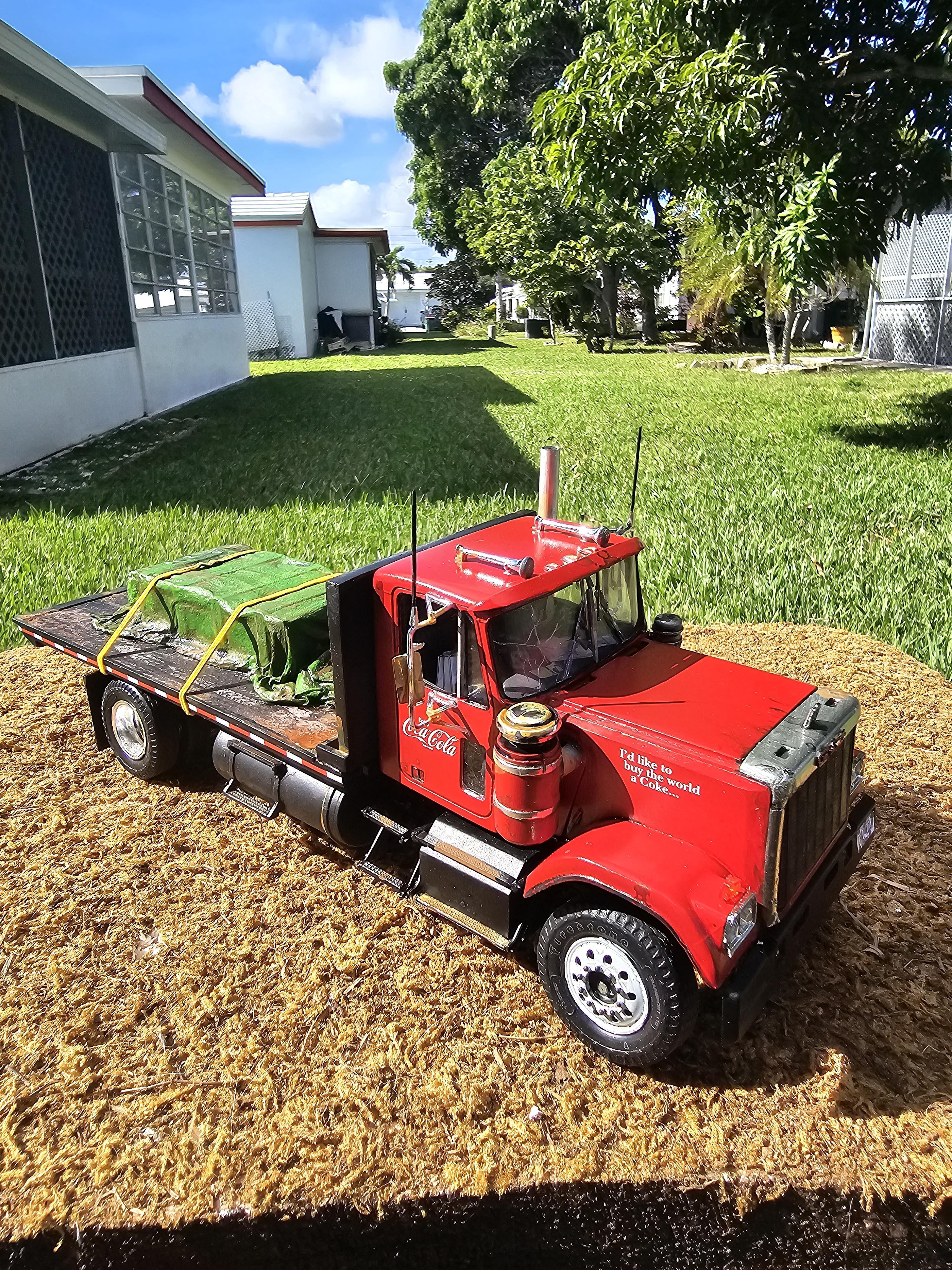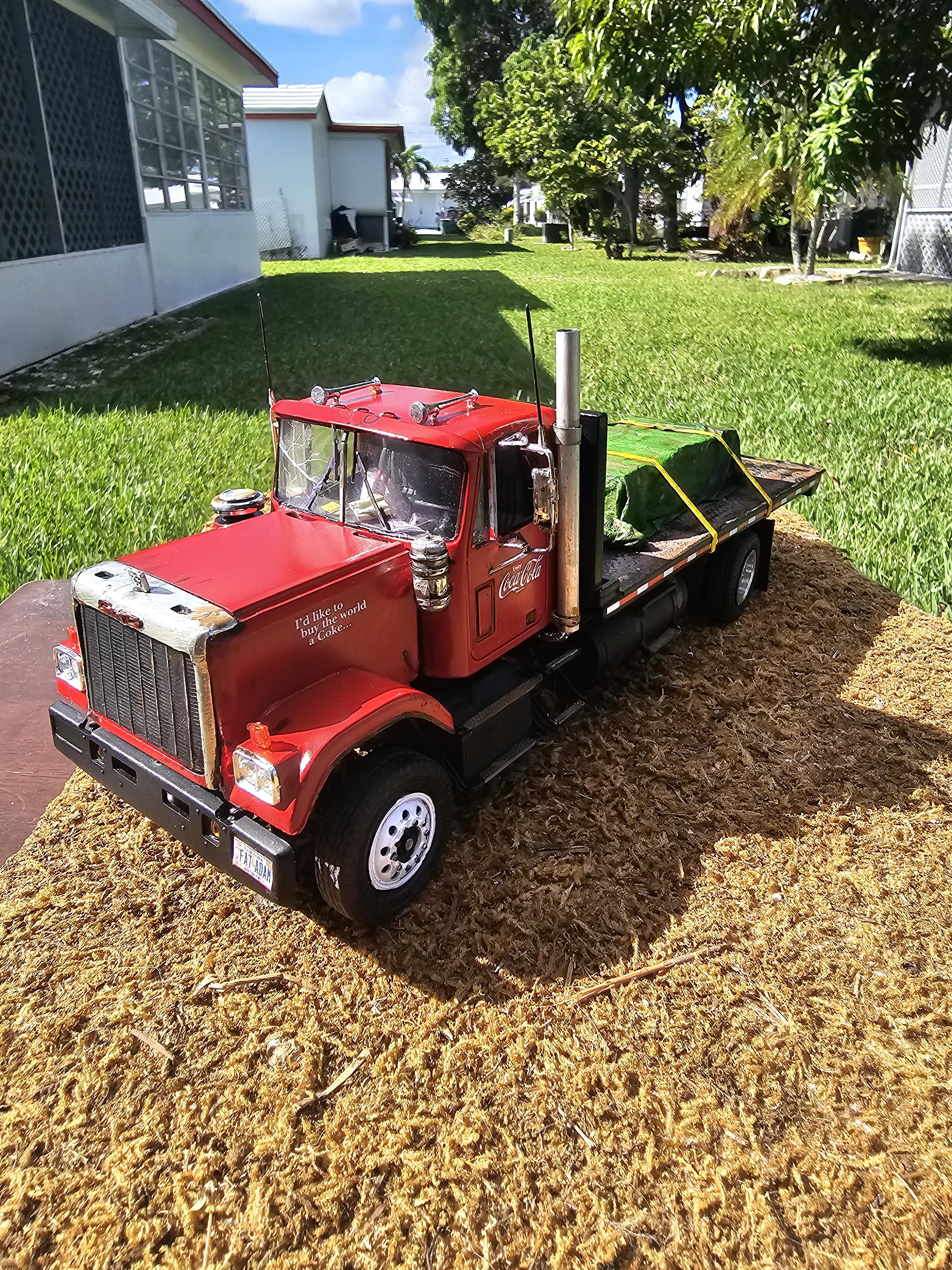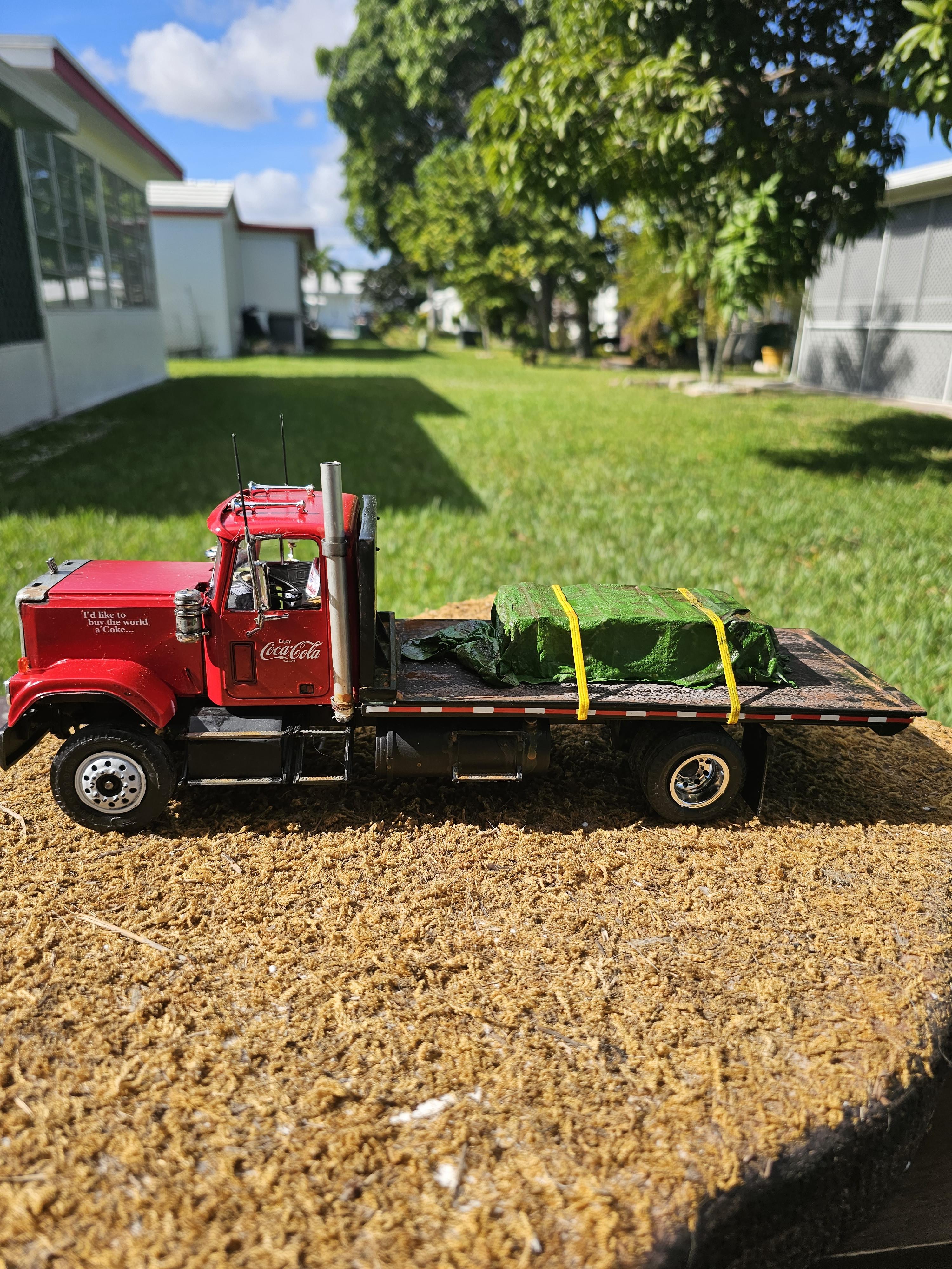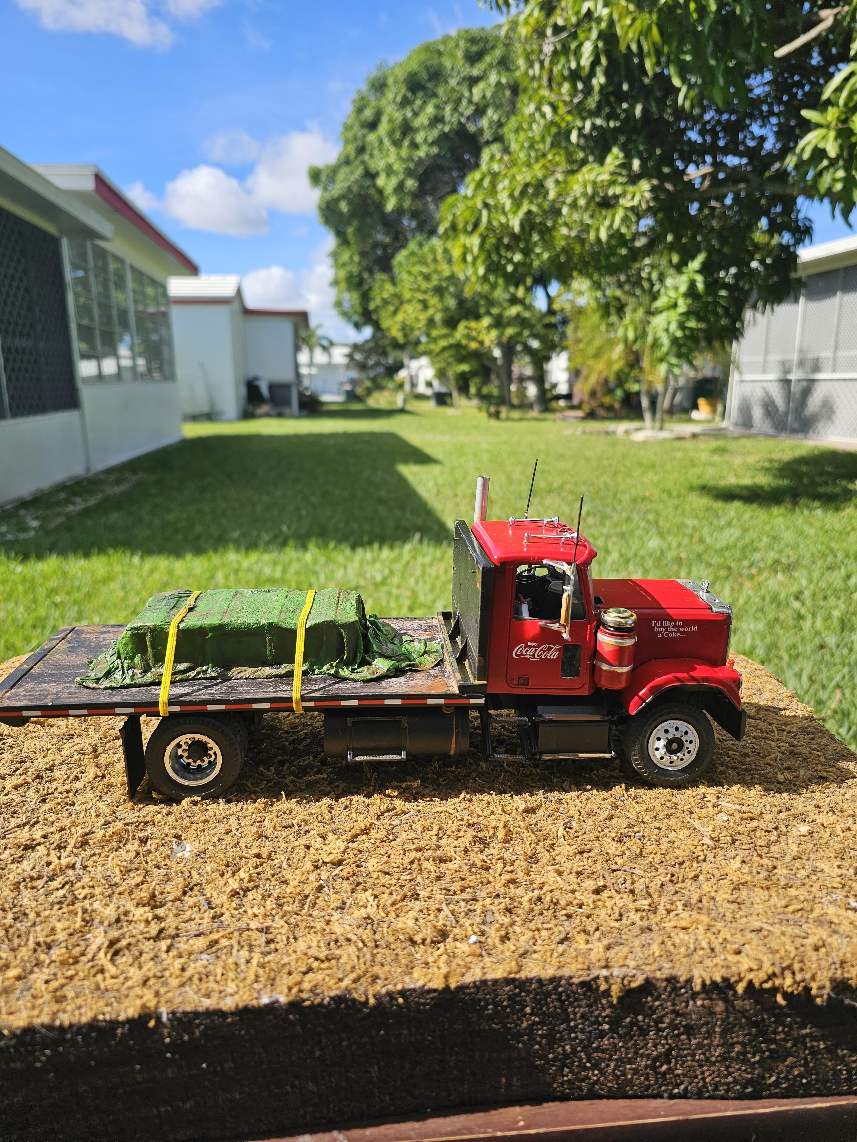 Model Builders Mafia Posted yesterday at 04:46 PM Posted yesterday at 04:46 PM Wow this one is finally done. I can definitely see why people in the 70s who tried to build these kits quit the hobby, yikes. Anyway, this is the AMT Coca-Cola GMC General. I started this project with a totally different thing in mind, but ended up cutting the chassis down to a single axle and adding the flatbed on the back. The final idea behind the kit was basically a maintenance truck in the Coca-Cola Fleet was sold off at auction, and a small company bought it to use for everyday needs. They never bothered to try to remove the Coca-Cola markings or clean up the truck in any way, just put it right to work. The one thing that did work out on this truck was I finally got to try to make my own tarp, and I'm quite happy with the way it came out. Basically, it's just a medical paper towel with Modge Podge and water put over a wooden crate and let dry and then painted with Vallejo paints and Tamiya panel line colors 3