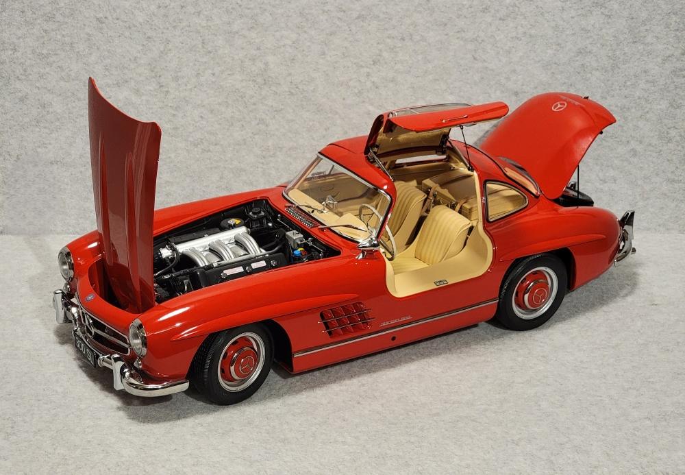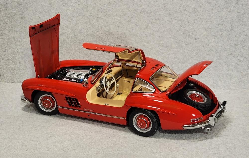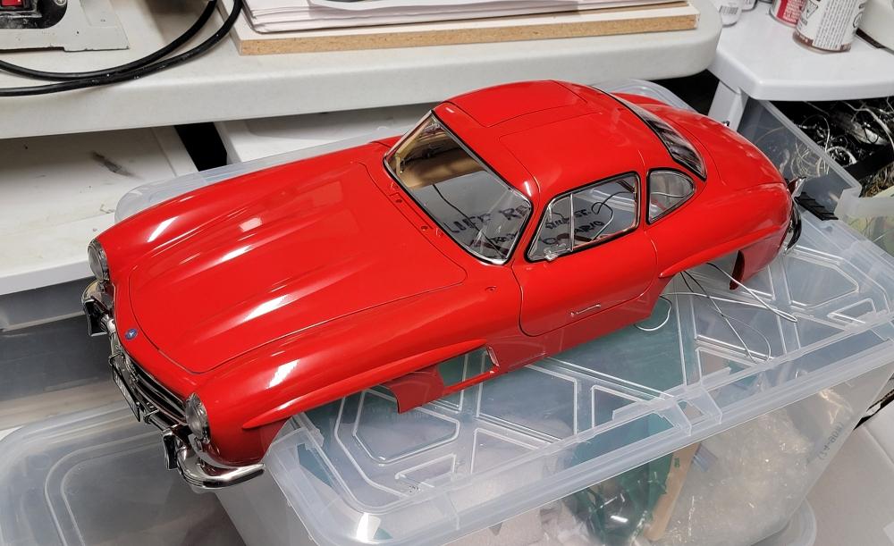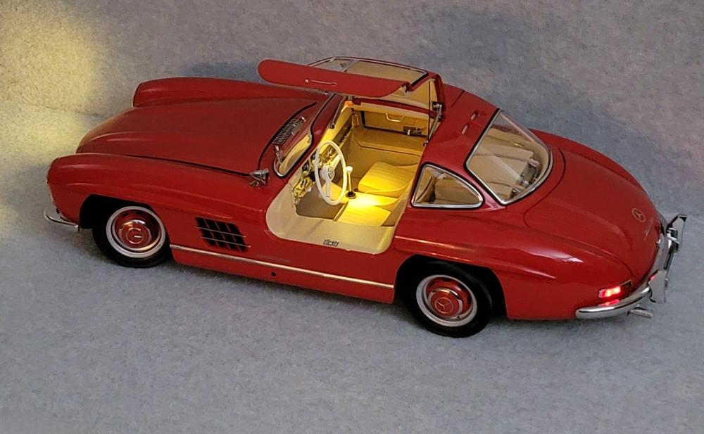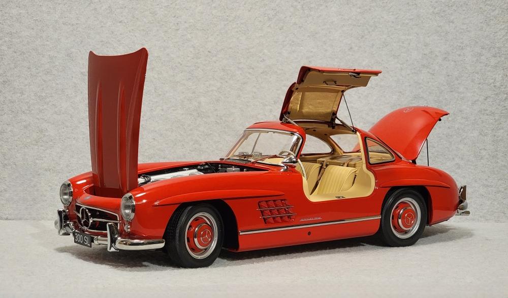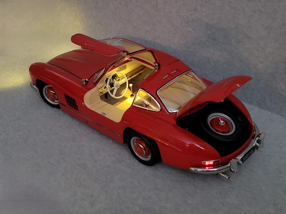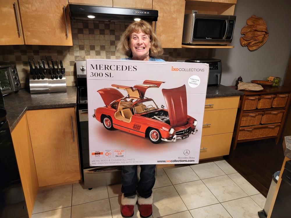 traditional Posted Thursday at 05:18 PM Posted Thursday at 05:18 PM (edited) I've just finished building this huge (1/8 scale) Mercedes 300SL from IXO Collections. My twin brother, Larry, bought it on a 'Black Friday' one-day sale and had it sent to me for building since he was too busy at this time of year with his senior's rock band (he plays keyboard). The IXO model kit (over 600 parts) comes beautifully packaged with parts well finished (no painting required). It's sort of like an expensive, huge, complex 'snap kit' including a well illustrated 254 page soft cover instruction manual. The finished model includes working headlights, tail-lights, brake lights, and interior light when the gull wing doors open. It was fun to build and I'm delighted with the finished product. My wife, Heather, holding the kit's large box Edited Thursday at 10:38 PM by traditional 2