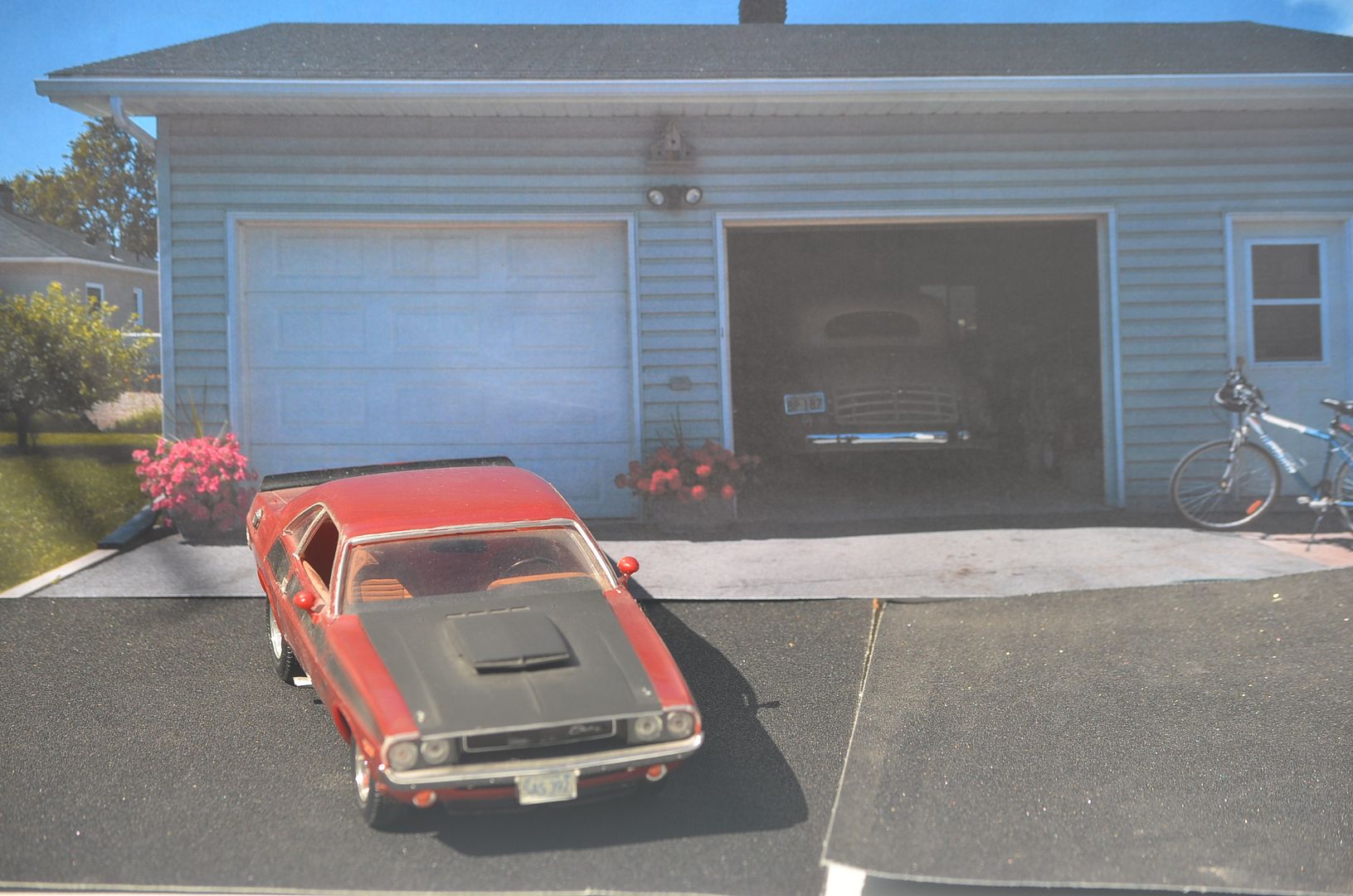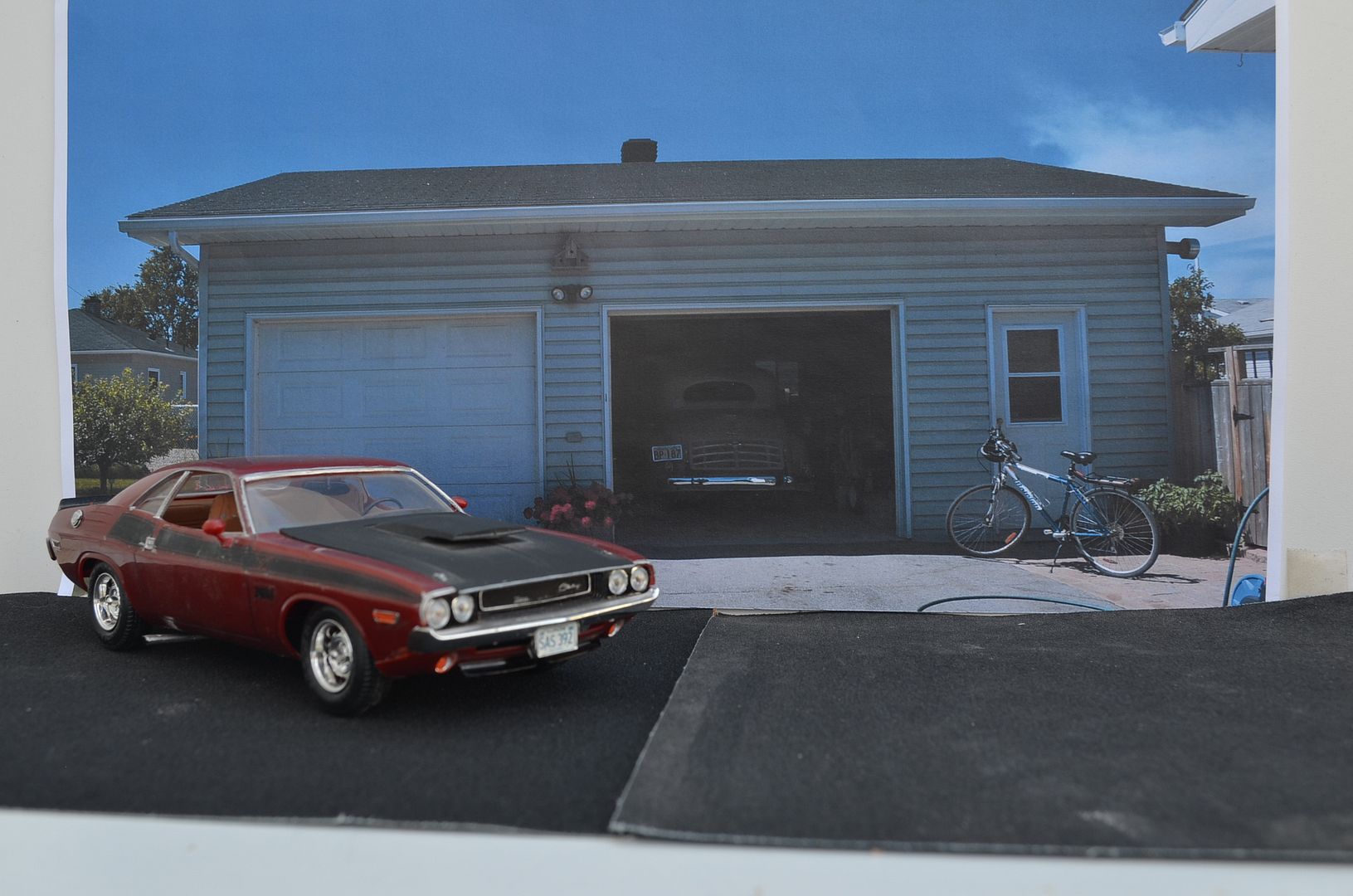 Foxer Posted August 12, 2016 Posted August 12, 2016 Following up on Doug Long's (Kodiak Island Modeler) of using a calendar image as background, I played with a 11x17 enlargement of my own garage. As you can see, I have a lot of experimenting to do yet. This is not bad. If you can get your driveway material a closer gray to the photo. And the photo needs to be darker and with more contrast to match the model. Shadows look right. Keep working it for sure!