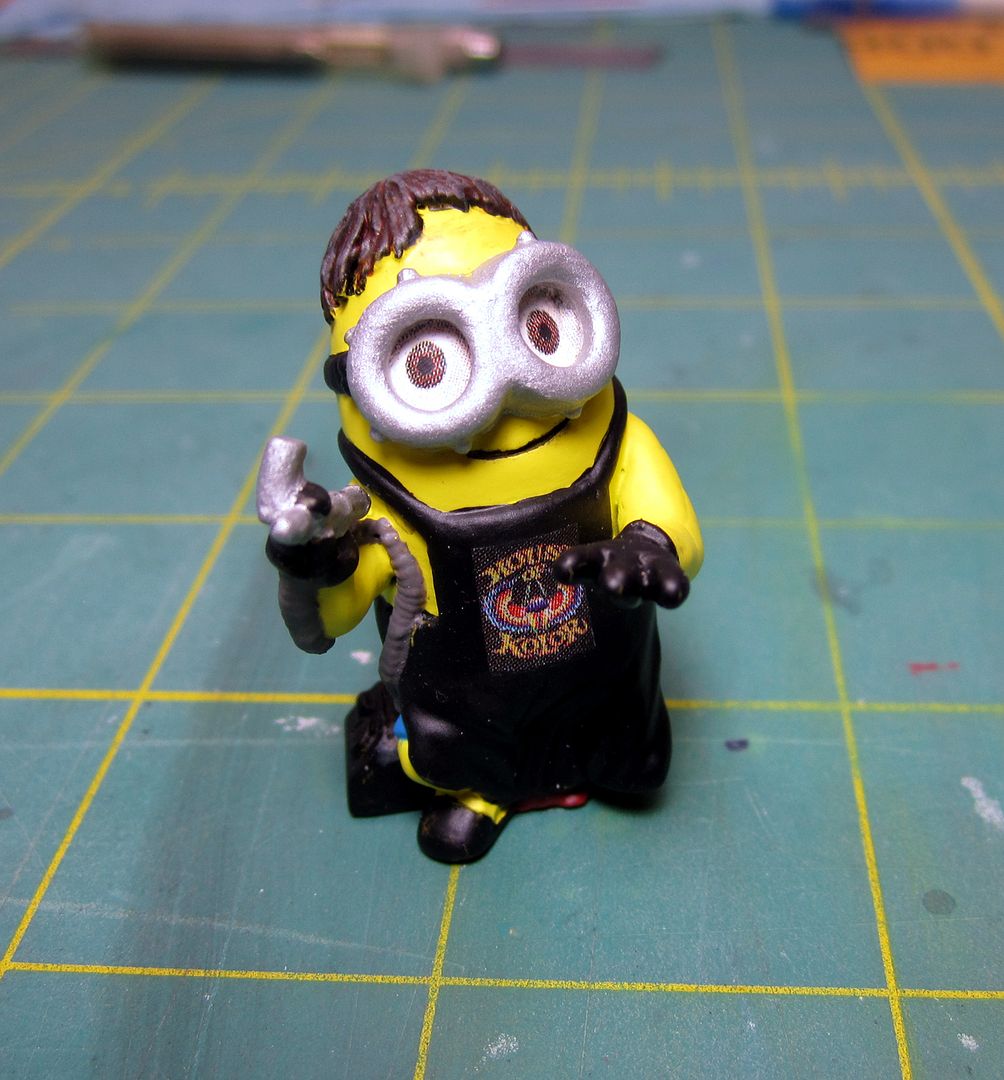 Mooneyzs Posted April 13, 2016 Author Posted April 13, 2016 SO well I have to tell you how I was actually able to get this painting done. While John Teresi was away at one of his shows in SoCal, I actually stole one of this little minions away from him to help me. This is Kevin the Painter. He is actually a resin figure that I found on Ebay which I had to paint and with the time that ran out for the desert scale classic I wasn't able to get him 100% complete. I still need to do some weathering and add some paint colors on his apron like he was wiping his fingers and getting paint on the apron. I need to thank my friend Mike Garland for printing the decals for the Eyes and the House of Kolor on the Apron for me: Here are some pics of the Painted body: