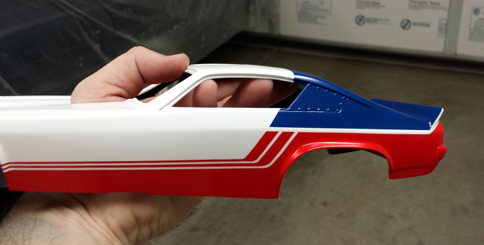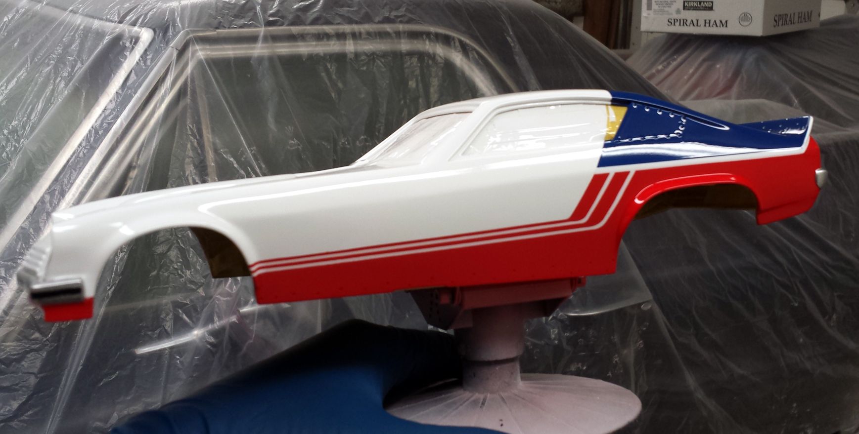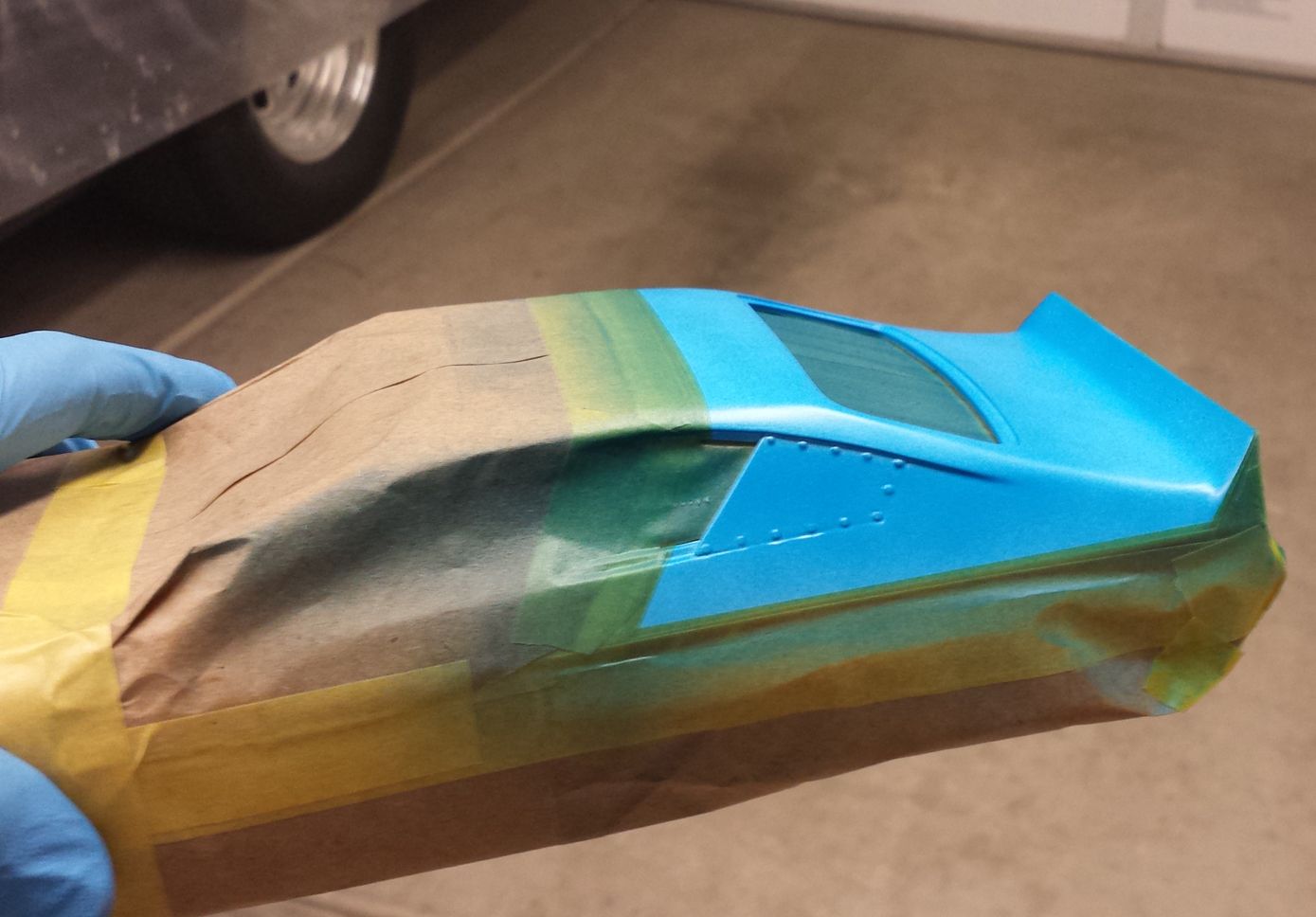 Mooneyzs Posted April 13, 2016 Author Posted April 13, 2016 Here is the body after the Blue Basecoat was finished: Next it was time to get the Front and Rear bumpers taped off for paint: