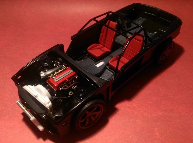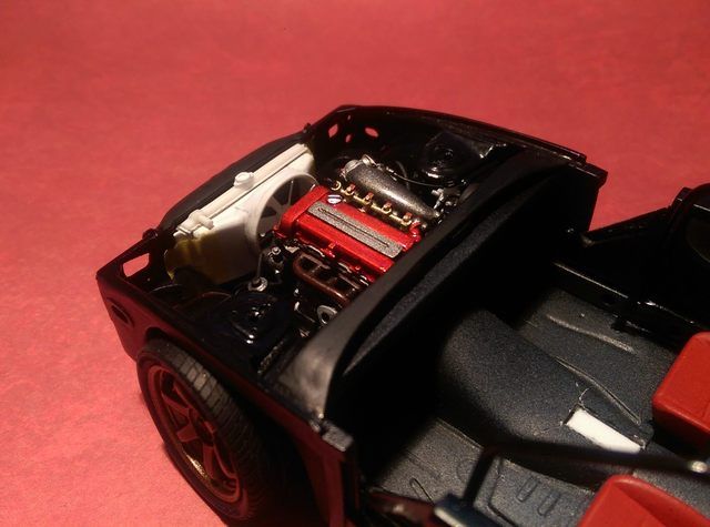 CrewDawg15 Posted February 16, 2016 Author Posted February 16, 2016 I work at the "Speed of Me", so here's a few more updates. The body has been sprayed with 4 coats of Testors black lacquer, just setting it aside so the paint will have plenty of time to cure before polishing. I also fabricated a few bits for the engine bay such as brake and clutch master cylinders, fuel filter, and power steering reservoir by turning styrene in my trusty electric drill and shaping with a good ol #11 blade and sandpaper. I also plumbed the fuel and power steering systems as well as running vacuum lines for the engine. She's still have a ways to go... ]