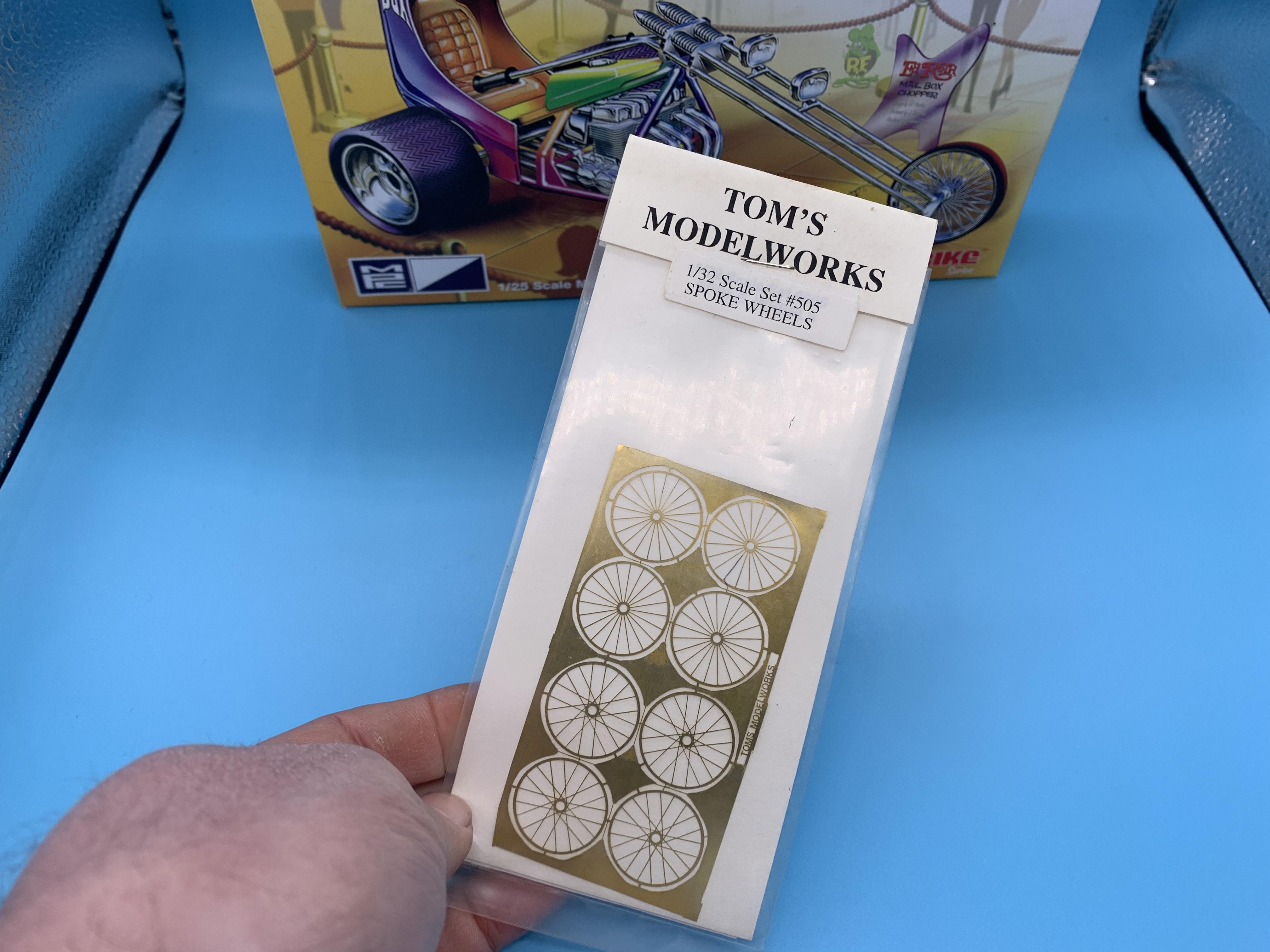 OldNYJim Posted February 12, 2021 Posted February 12, 2021 I’ve been planning to build all of the reissued MPC trikes and really wanted some sort of wire wheels for the front, having seen @Impalow use some for his. I looked at a bunch of options...and then shamelessly just ordered the same (I think?) photoetch set as Eric used for his: I’ll need to machine a rim and center for them, but they’re a big improvement over the kit parts! Need to hit the local Ace Hardware and see if they’ve got any aluminum tube of about the right diameter to machine the rims for them over the weekend