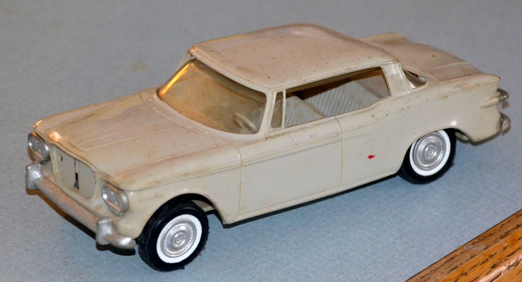 Foxer Posted February 11, 2017 Posted February 11, 2017 Went to the Bennington (VT) Toy and Model Show today, but it no longer has a model contest, just a good number of model car venders with some interesting stuff. Old and new kits, resin bodies and old built model cars. I was tempted many times, but resisted getting something I'll never finish. I did succumb to a 1961 Studebaker Lark promo with a frozen friction drive and a missing wheel and grill. The plastic body was pretty straight and was only $10. I drove a 60 or 61 Lark all summer for the Connecticut Highway Dept. taking traffic surveys all over the state. We'd sit in school desk chairs at shopping malls and take licensee plate numbers. They used this to graph traffic patterns. The Larks were our home for the day with all out lunches and sleeping quarters for smoke breaks. This model will be a nice representation of a car I "owned".