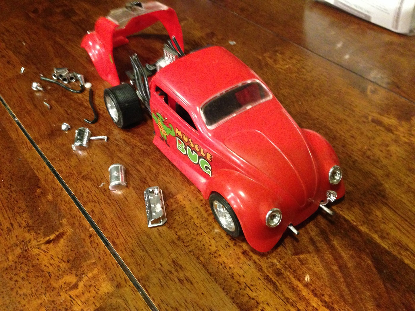 Mr mopar Posted February 17, 2017 Posted February 17, 2017 (edited) I have been hunting this one for a long, long time. I finally got a good e-bay price on one. The e-bay pic Hosted on Fotki The box showed up today. Marked FRAGILE - good. Looks like a smaller box surrounded by packing - good. Pick up the smaller box - the model drops out the open end wrapped in a plastic grocery bag. Parts follow. Poop. Broken axel, driving lights and nerf bars. The seller was doing so well. He just failed to wrap the model before putting in a 6-sided inner box (instead of an open ended box).So much for putting this one straight on the shelf. I'll have a little more repair to do. I knew it was missing one exhaust trumpet, but I also have the make the rear end cover and headlight lenses. Hosted on FotkiI know the risks of buying built models; I'm still thrilled have to have it. It will be fairly easy too take apart and restore. nice find I have a mint Smug Bug the blue one ! Edited February 17, 2017 by Mr mopar