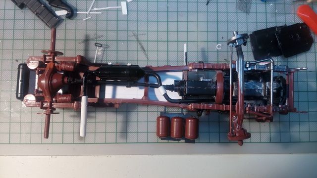 Kostas Parchas Posted March 11, 2016 Author Posted March 11, 2016 (edited) Wow!!! 2 1/2 years since the last post on this. I might be slowest model truck builder ever. I am pussing forward on this girl, I want her to be done soon, so I managed to complete the frame as far as possible in order to start priming and painting. Once again plenty of styrene was used here and there. The frame rails are now covered by custom deck plates which were shaped to mimic the frame and the exaust pipe end was fabricated The fifth wheen release handle is now extended, new exaust brakets were fabricated and also the air filter pipe supporter was detailed. A few parts of the kit are missing especialy from the exaust, so I used parts from the parts box and bits of styrene, Hope you enjoy this. The forecast says heavy rains and temperature drop for the next few days, so I will not be able to prime or paint anything, but I might find some time to puss forward also the cab and its interior. Kostas. Edited March 11, 2016 by Kostas Parchas pictures added