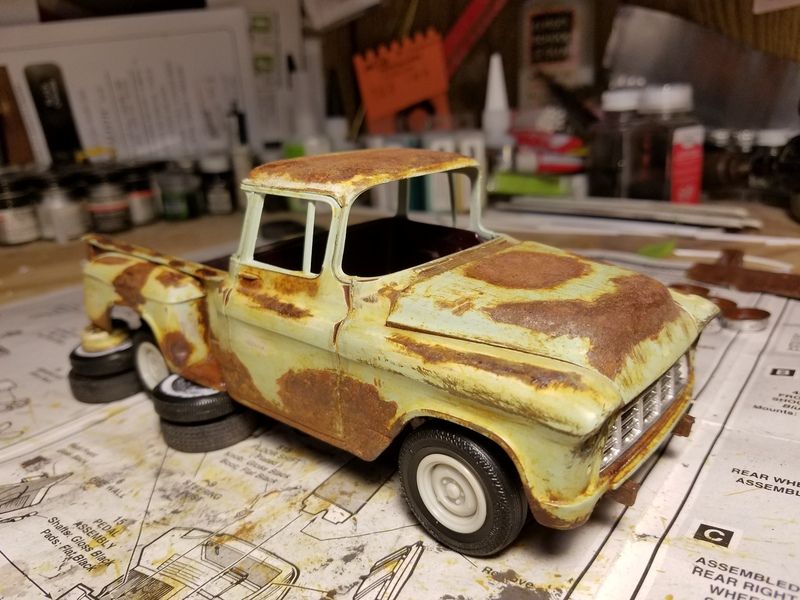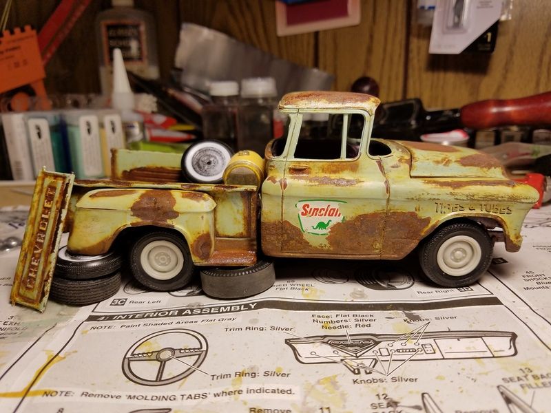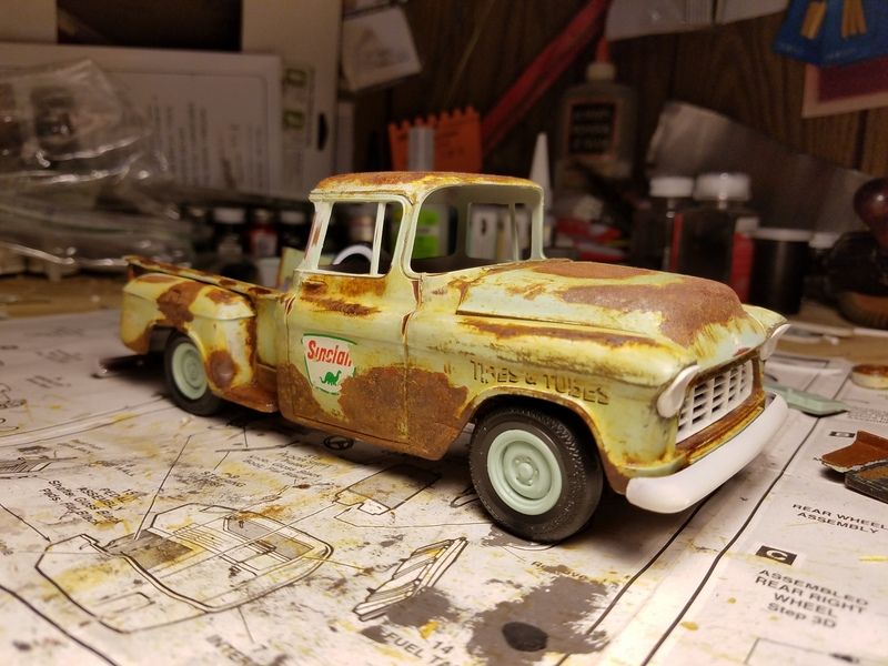 JTalmage Posted December 23, 2016 Author Posted December 23, 2016 Last time this thing was on my work bench, it had cragars and slicks on it... but I just wasn't feeling that vibe. It was way too weathered to be a hot rod truck in my opinion. I felt it had another calling in life. That's when I realized I still had some old decals from the Lindberg '34 Ford truck... so since this truck was green, it needed Sinclair fuel decals. Thus now the backstory to it is that it's a retired service station truck from Rt 66 in the southwest. Years of surface rust but no holes, which fits this thing perfectly. So here's a few updates for it... Here it is when I found a set of wheels and tires that were more fitting w/ the new theme After I applied the Sinclair decals and weathered them. Weathered my bumpers a little And was able to weather the bed floor to look like it's been used and abused for years of oil and gas and tires in it. Hoping to have it done for a club meeting for my local club in January.