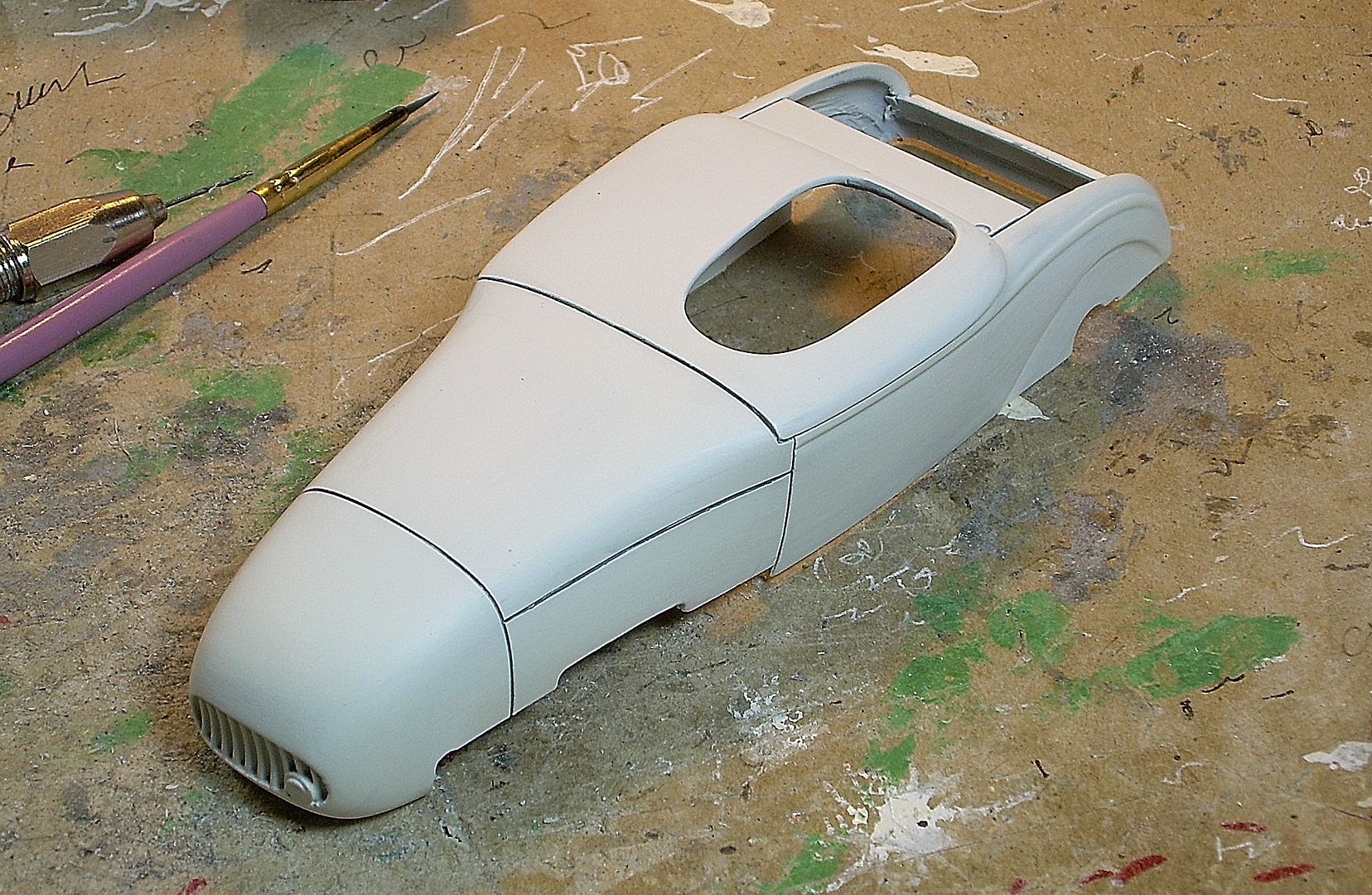 Ace-Garageguy Posted August 29, 2016 Author Posted August 29, 2016 Finally finished the bodywork and put a black wash in the body lines (more for an experiment, as this is still just the plug for a mold set). First three coats of Ace Hardware refrigerator white gloss lacquer. A little peel, but nothing difficult to deal with. A few days drying, wet-sanding with 800, and a couple more coats, then final wetsand and polish. The idea is to get a hard, slick surface to mold from. (I'm disappointed that the black wash doesn't show up better in the panel lines. I may not have scribed them deeply enough)
